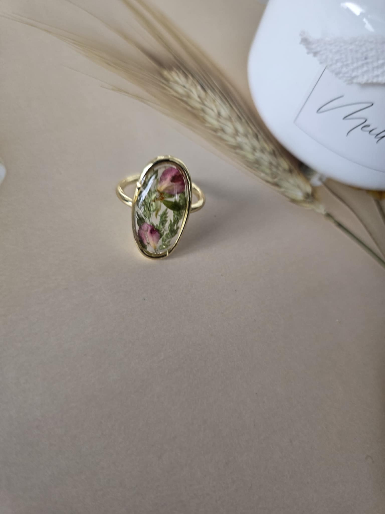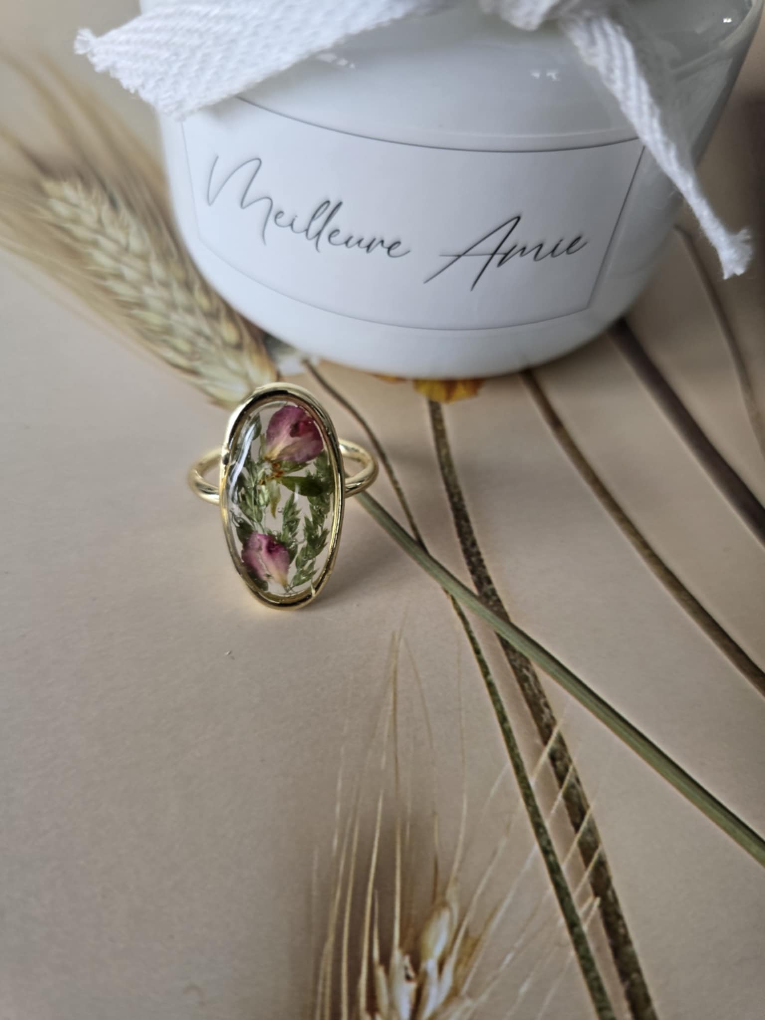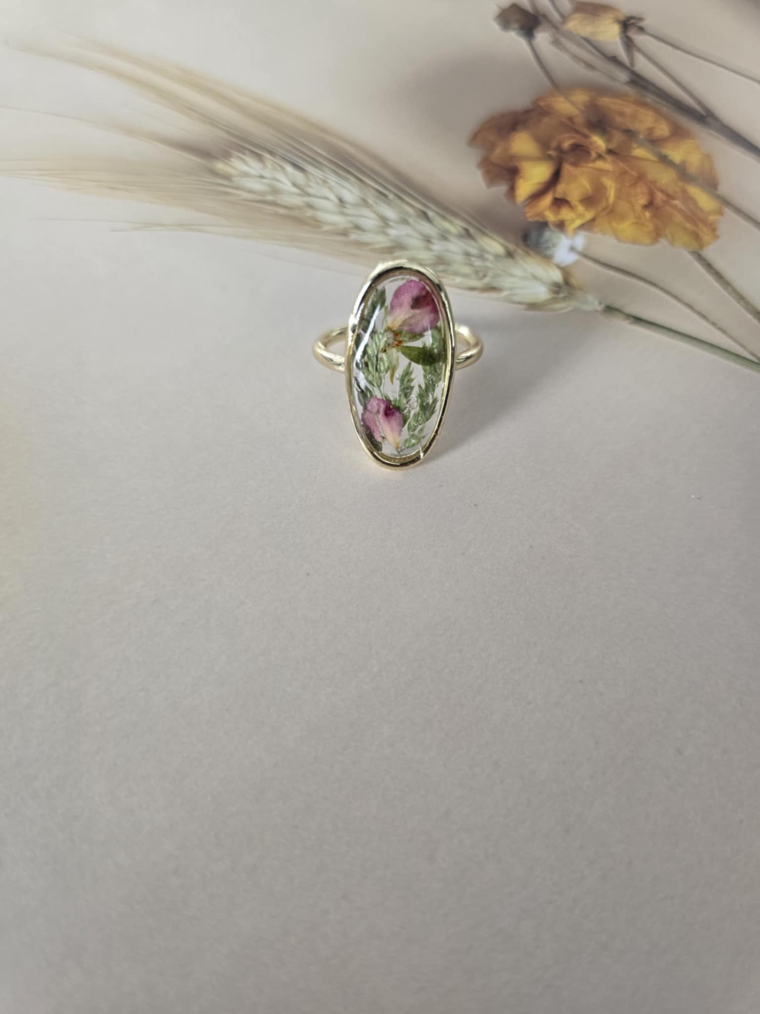 Caractéristiques : une bague plaquée or 14k, bijoux en résine avec des fleurs naturelles est un accessoire élégant et unique. La résine permet de préserver la beauté des fleurs tout en les mettant en valeur. Ce type de bijou est souvent apprécié pour son aspect artisanal et sa capacité à capturer la nature.