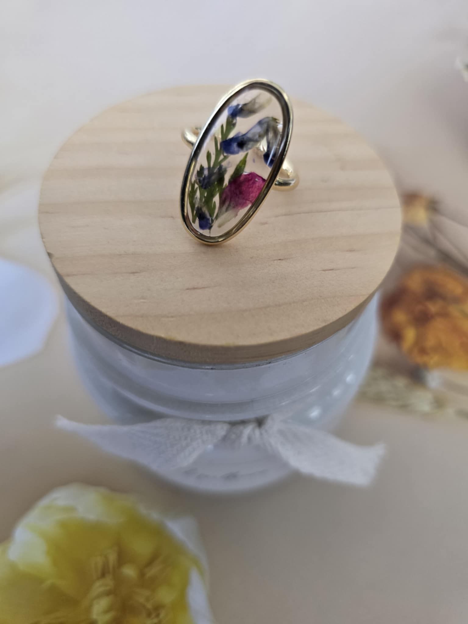 Caractéristiques : une bague plaquée or 14 carats ornée de bijoux en résine avec des fleurs naturelles est un accessoire élégant et unique. La résine permet de préserver la beauté des fleurs tout en les mettant en valeur. Ce type de bijou est souvent apprécié pour son aspect artisanal et sa capacité à capturer la nature.