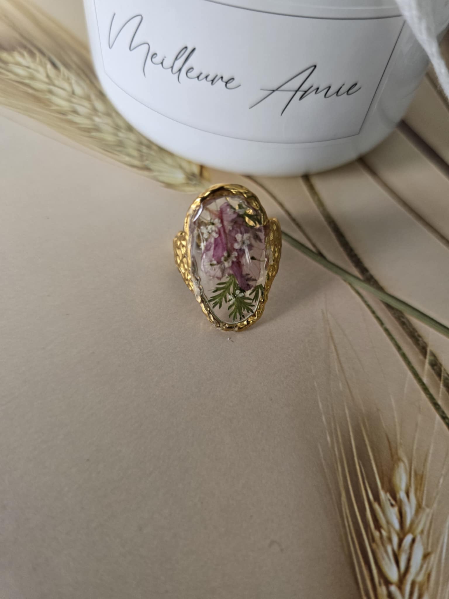 Caractéristiques : une bague en acier inoxydable, un bijou en résine avec des fleurs naturelles est un accessoire élégant et unique. La résine permet de préserver la beauté des fleurs tout en les mettant en valeur. Ce type de bijou est souvent apprécié pour son aspect artisanal et sa capacité à capturer la nature.