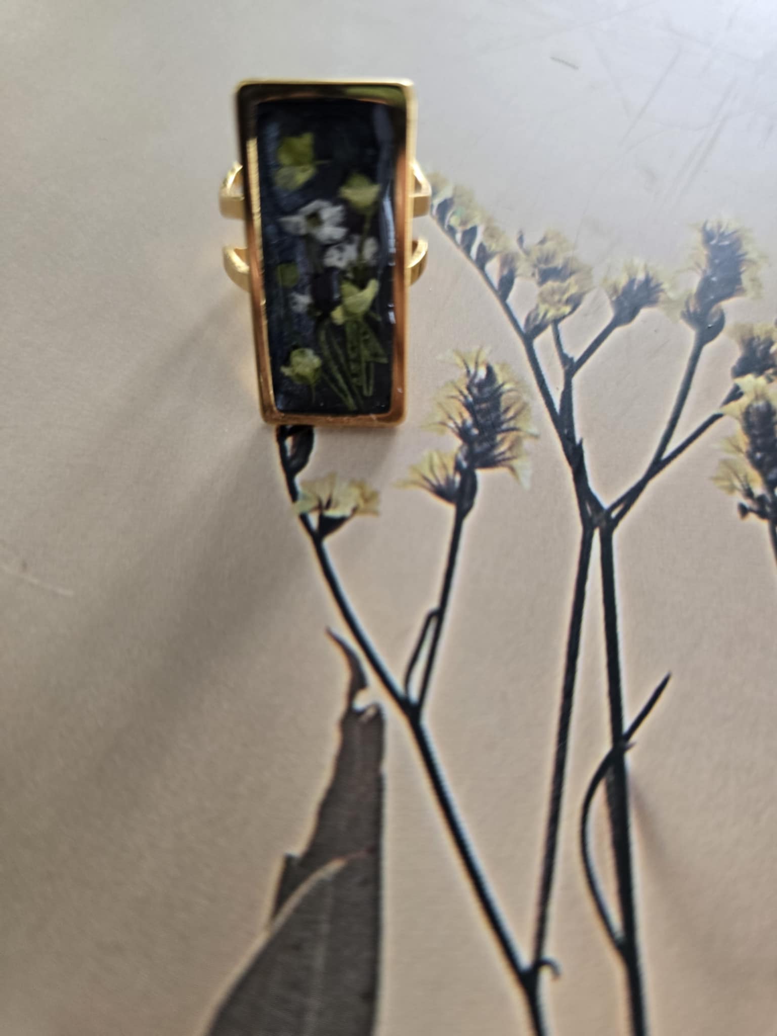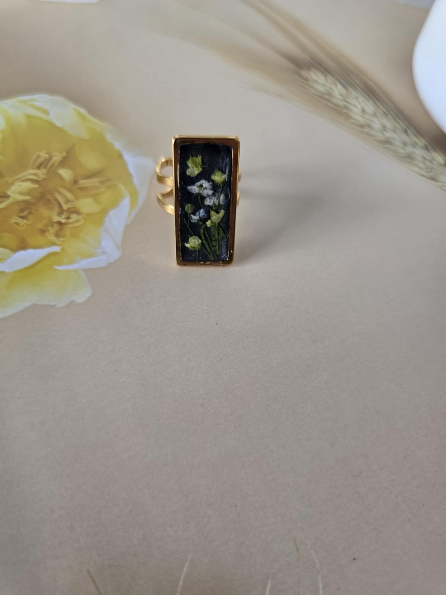 Une bague ajustable ornée de bijoux en résine avec des fleurs naturelles est un accessoire élégant et unique. La résine permet de préserver la beauté des fleurs tout en les mettant en valeur. Ce type de bijou est souvent apprécié pour son aspect artisanal et sa capacité à capturer la nature.