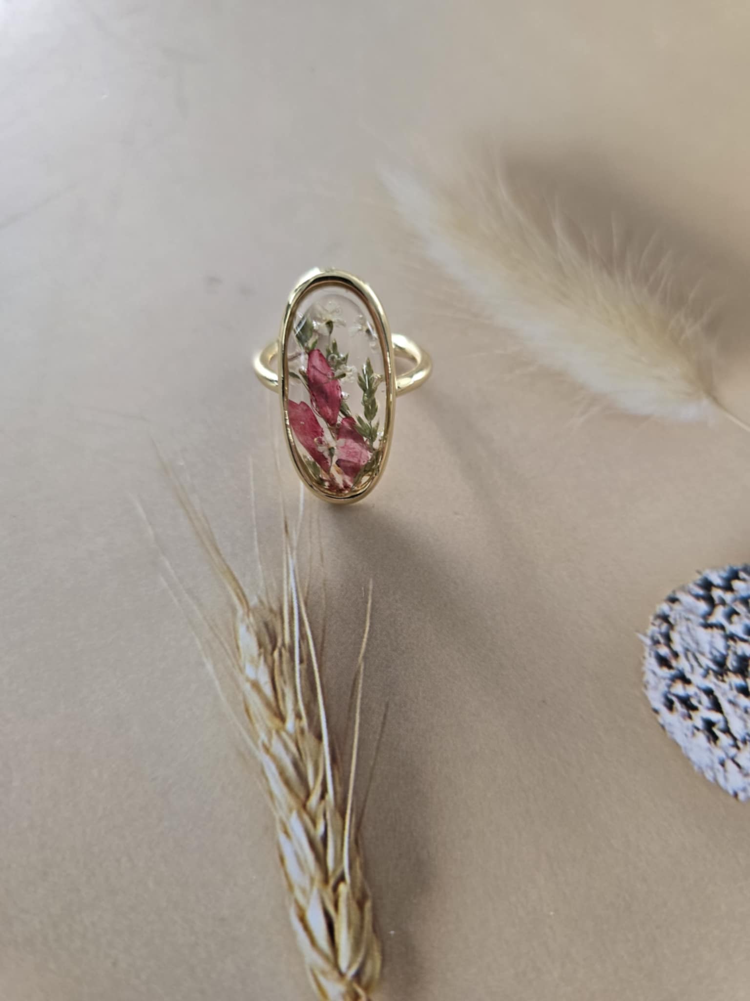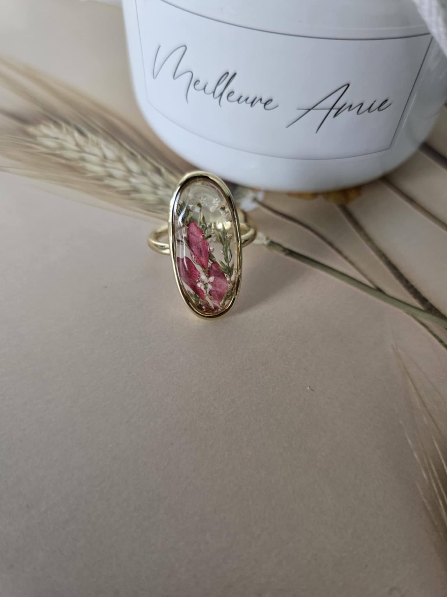 Caractéristiques : une bague plaquée 14 k, bijoux en résine avec des fleurs naturelles est un accessoire élégant et unique. La résine permet de préserver la beauté des fleurs tout en les mettant en valeur. Ce type de bijou est souvent apprécié pour son aspect artisanal et sa capacité à capturer la nature.