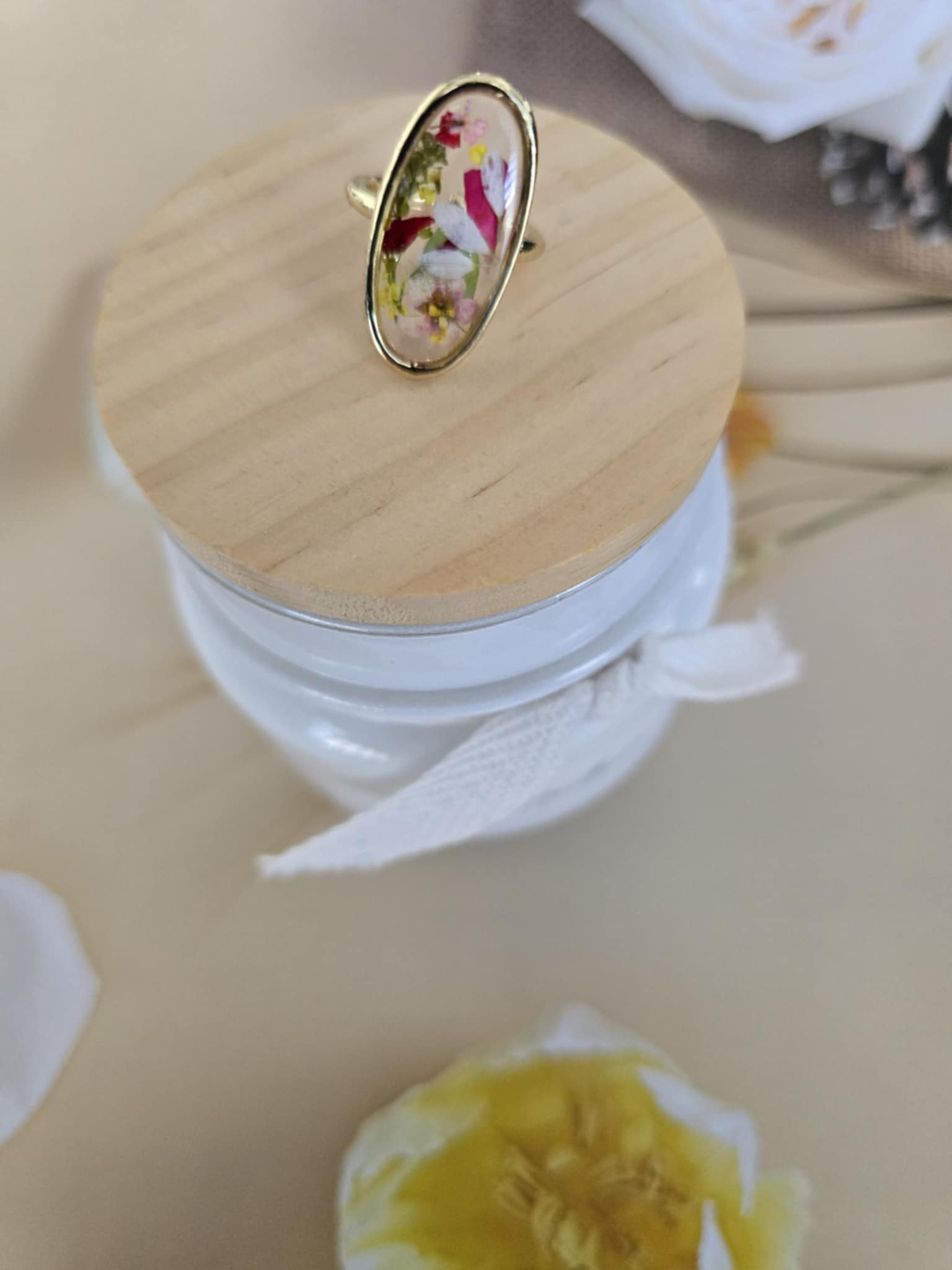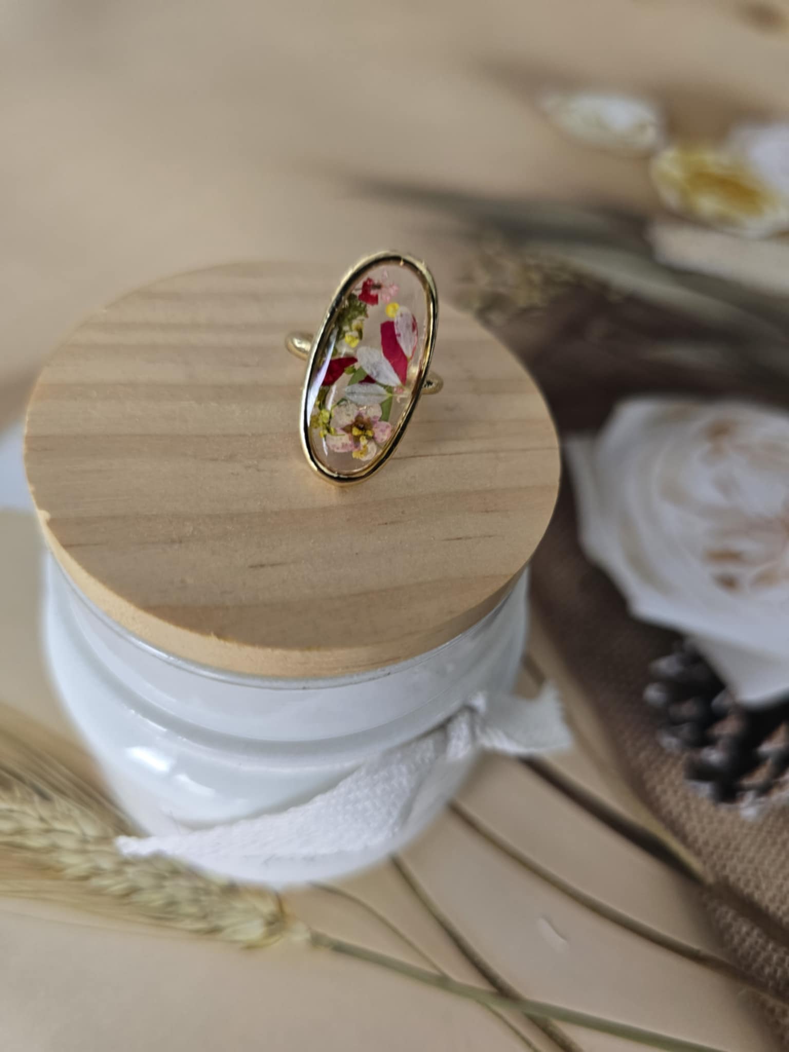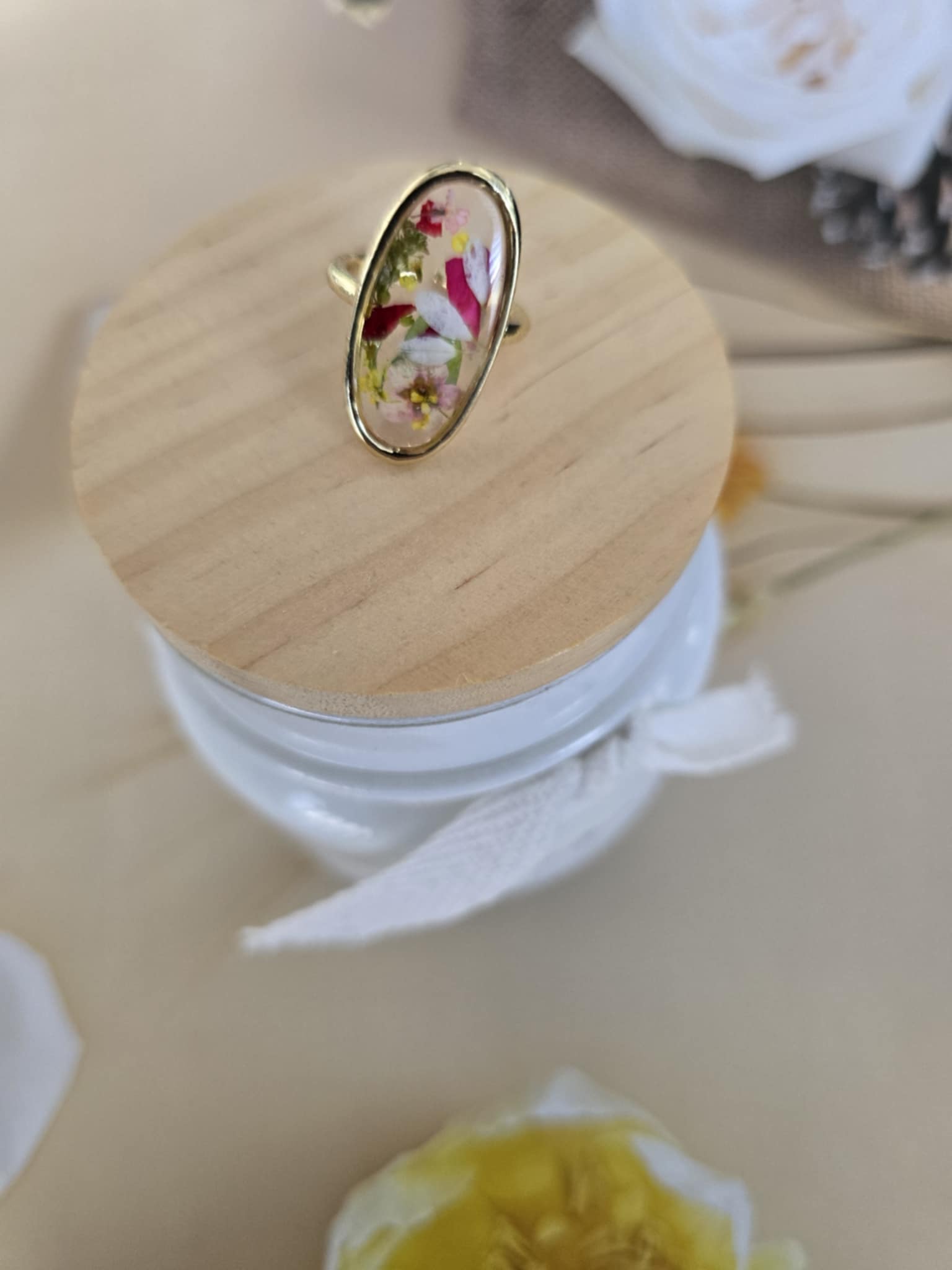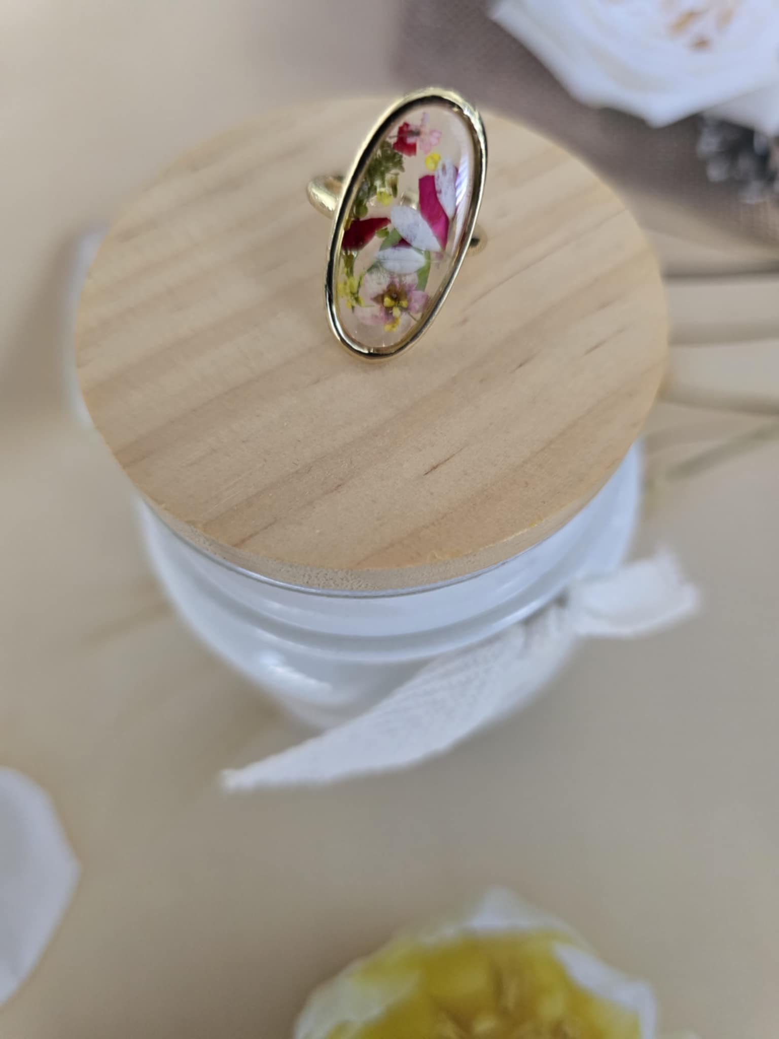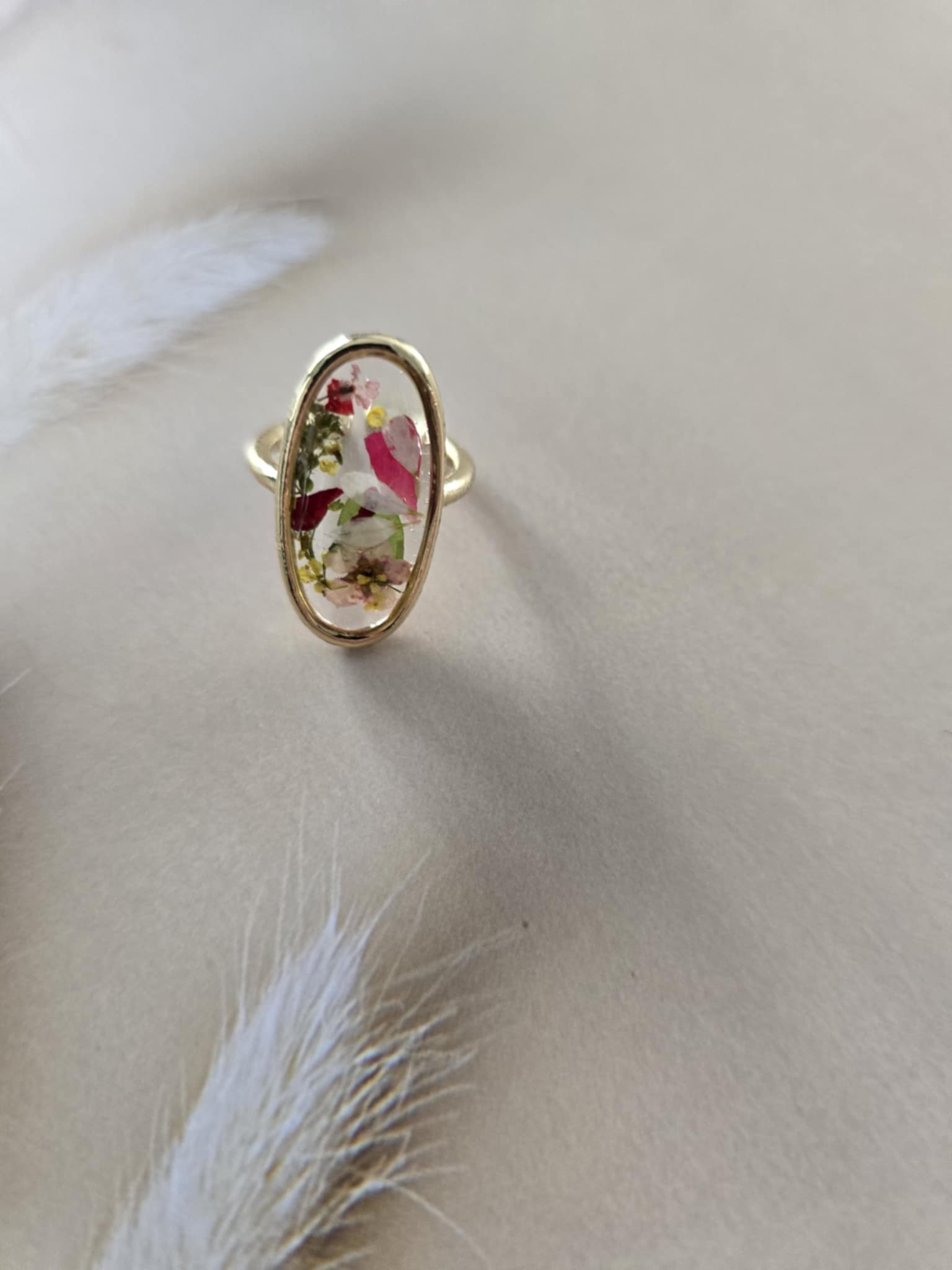 Caractéristiques : une bague plaquée or bijoux en résine avec des fleurs naturelles est un accessoire élégant et unique. La résine permet de préserver la beauté des fleurs tout en les mettant en valeur. Ce type de bijou est souvent apprécié pour son aspect artisanal et sa capacité à capturer la nature.