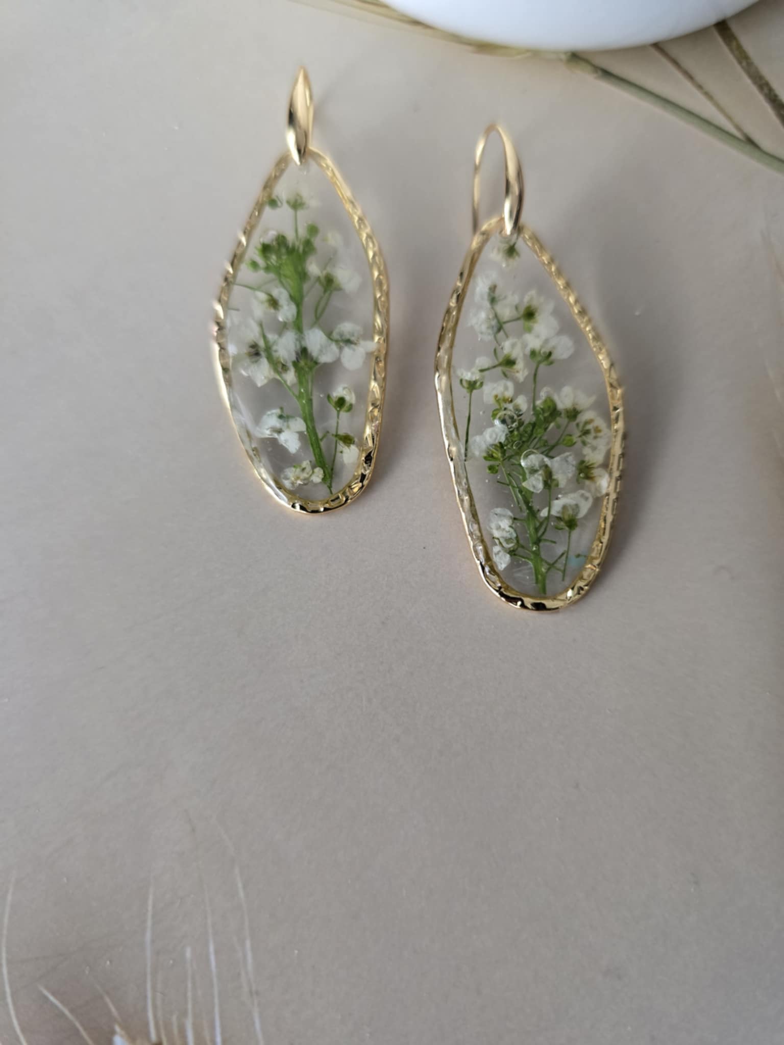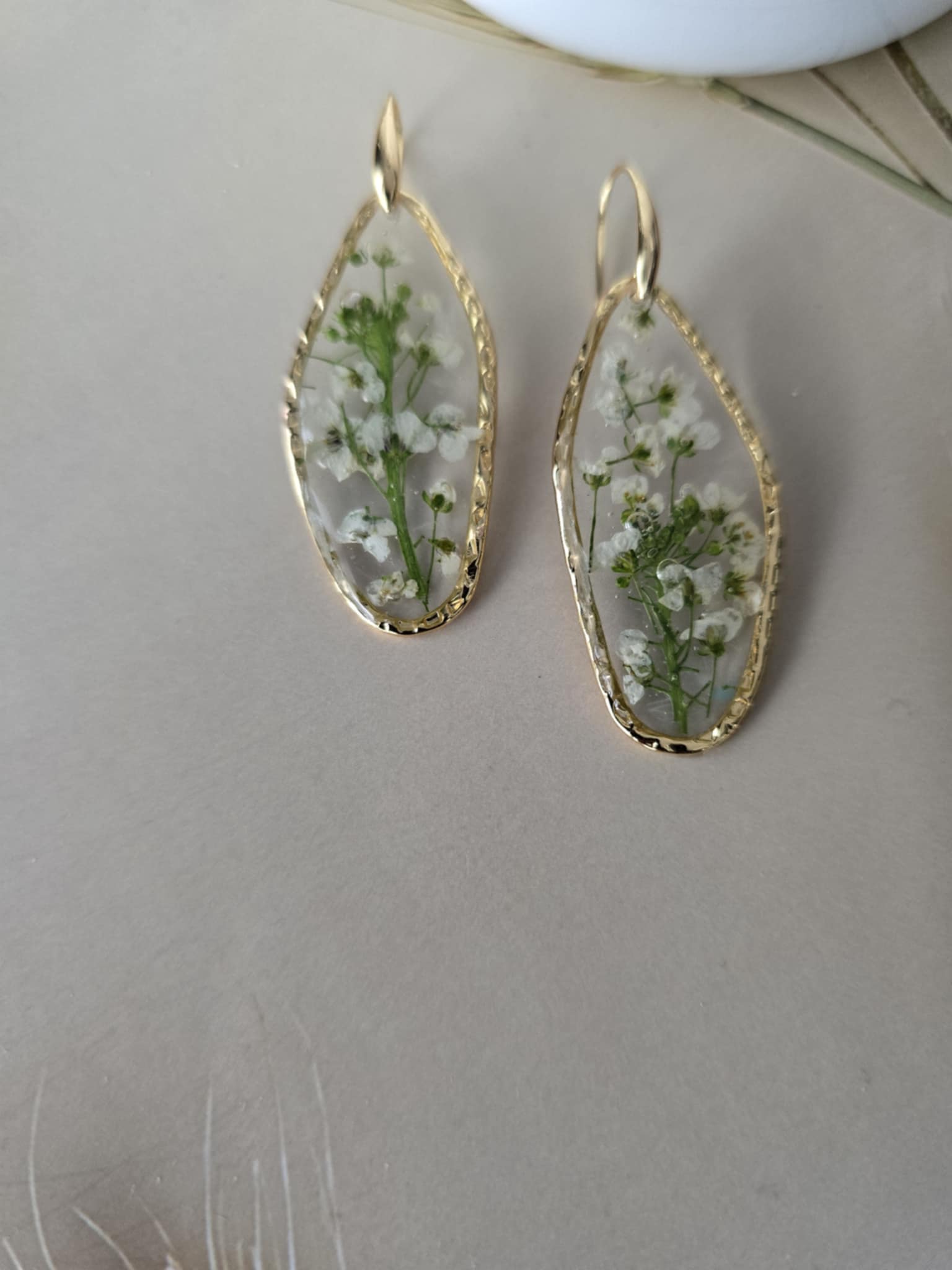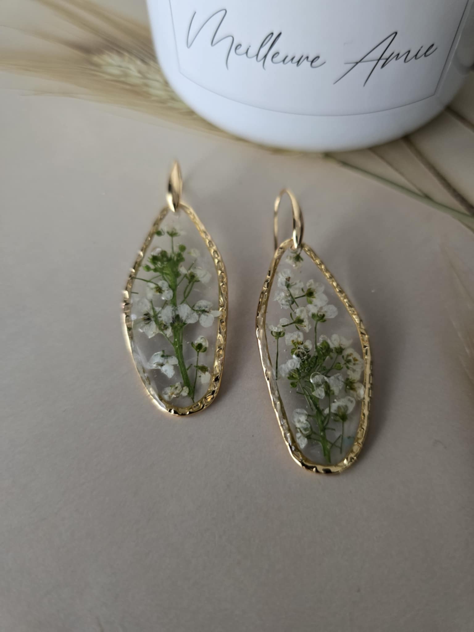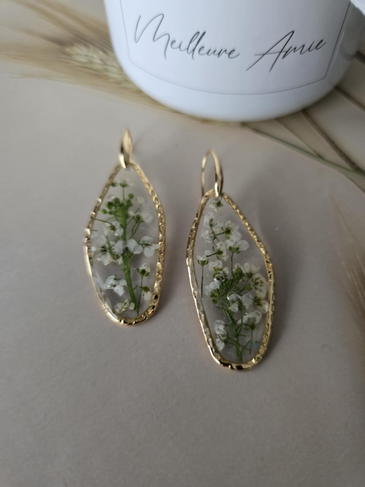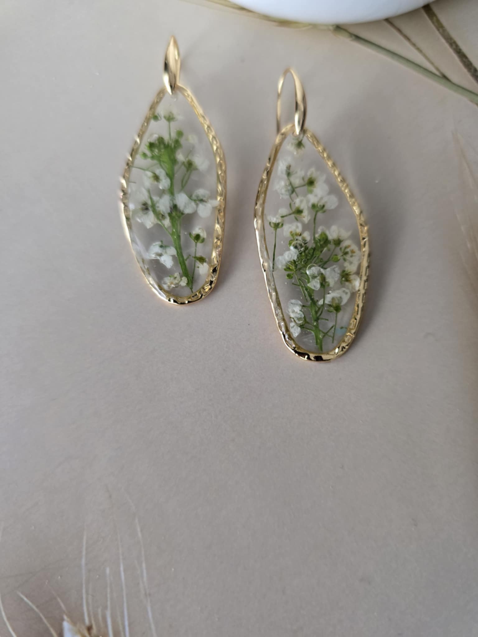 Entretien : bien qu'ils soient généralement durables, il est conseillé d'éviter un contact prolongé avec l'eau ou des produits chimiques pour préserver l'éclat des boucles d'oreilles et des fleurs.