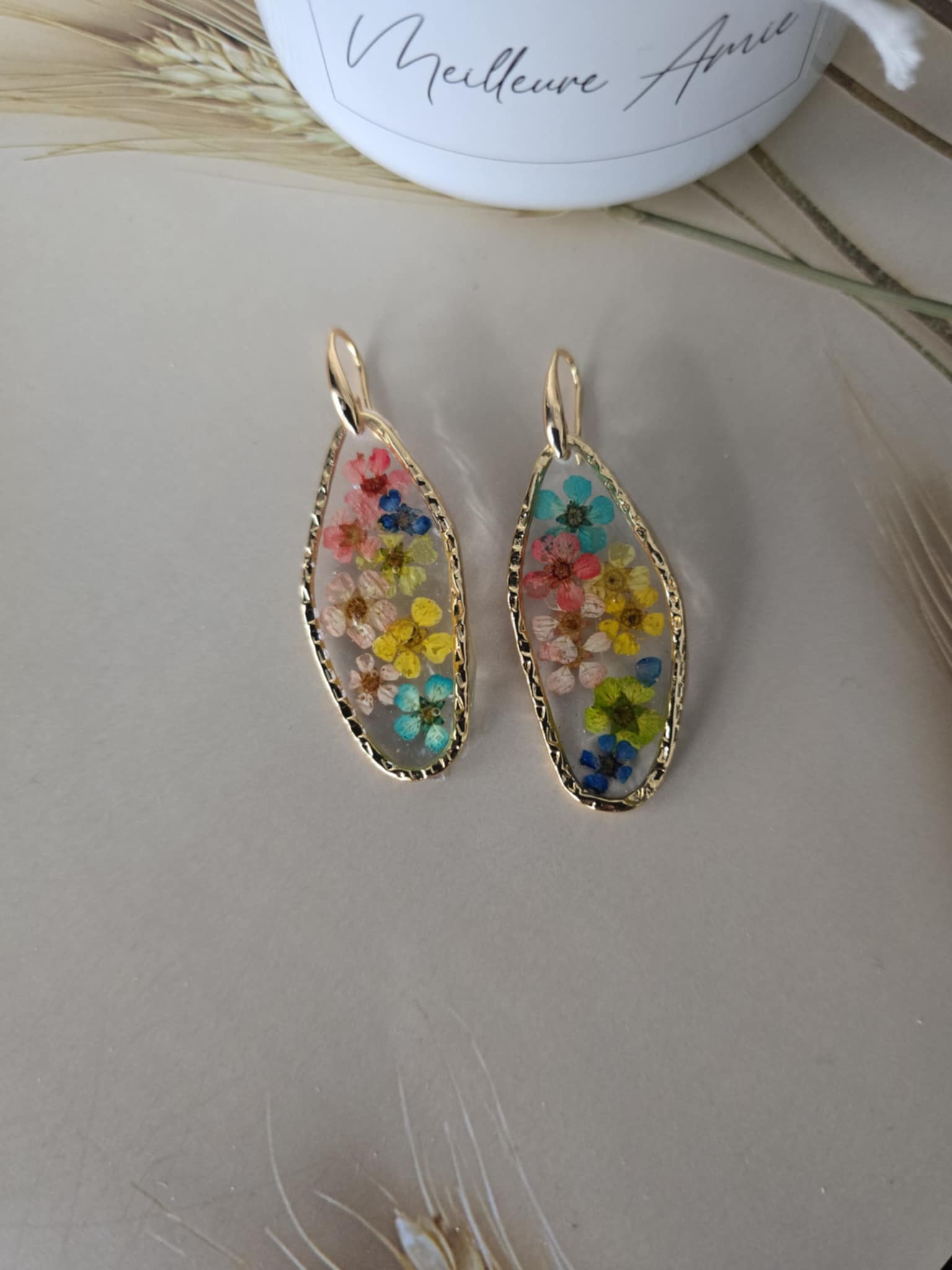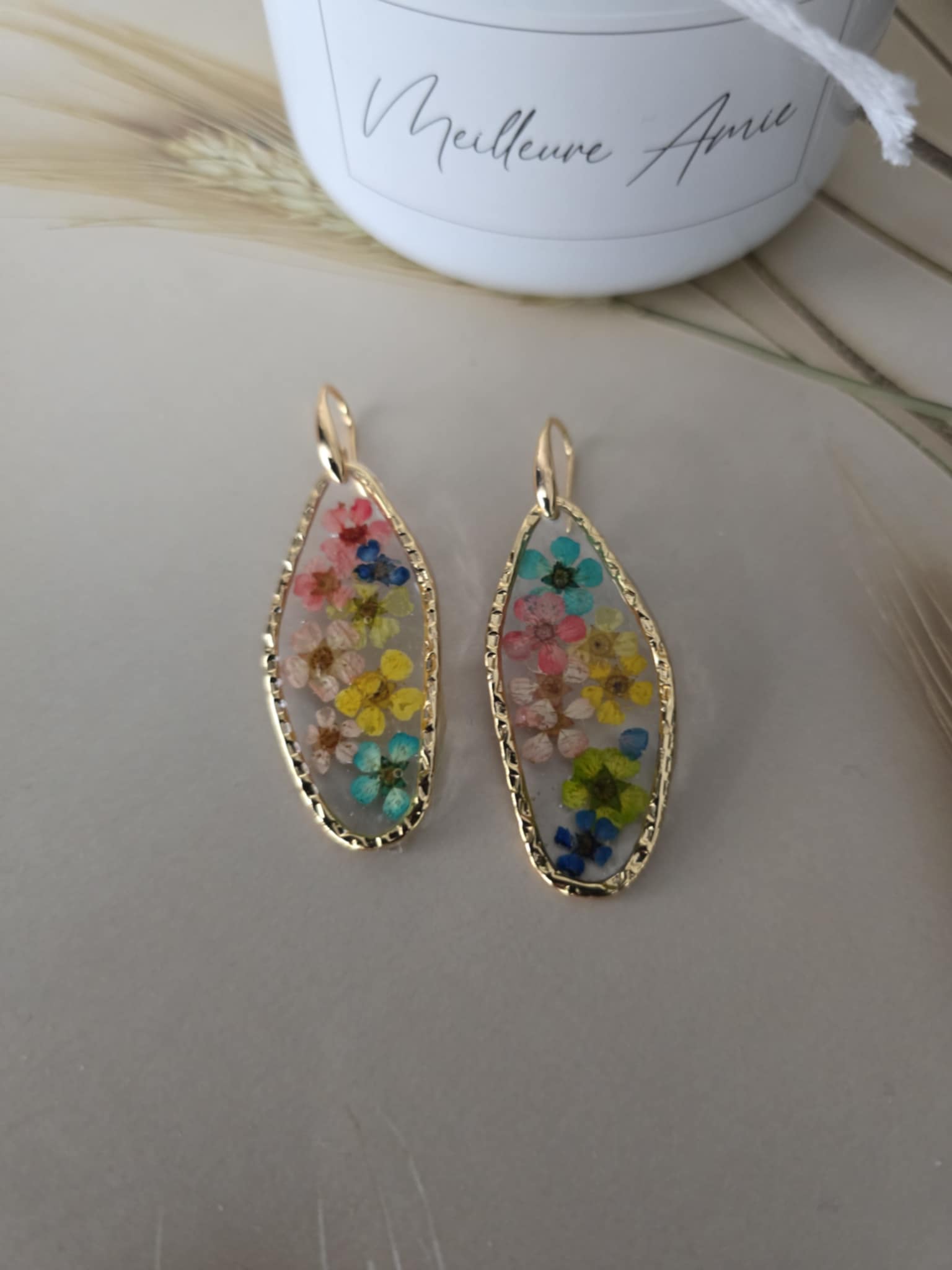 Caractéristiques : les boucles d'oreilles plaquées or ornées de bijoux en résine avec des fleurs naturelles sont un accessoire élégant et unique. La résine permet de préserver la beauté des fleurs tout en les mettant en valeur. Ce type de bijou est souvent apprécié pour son aspect artisanal et sa capacité à capturer la nature.