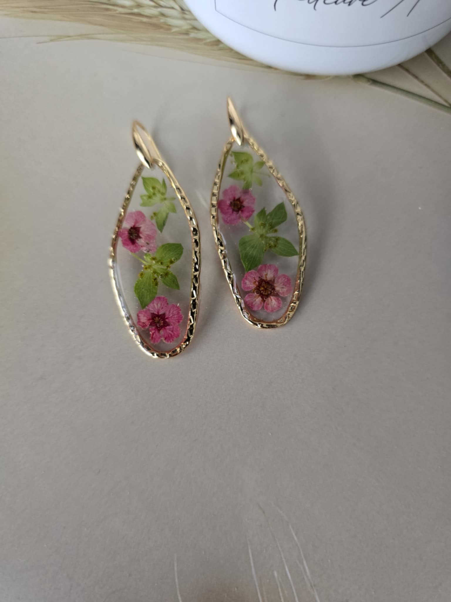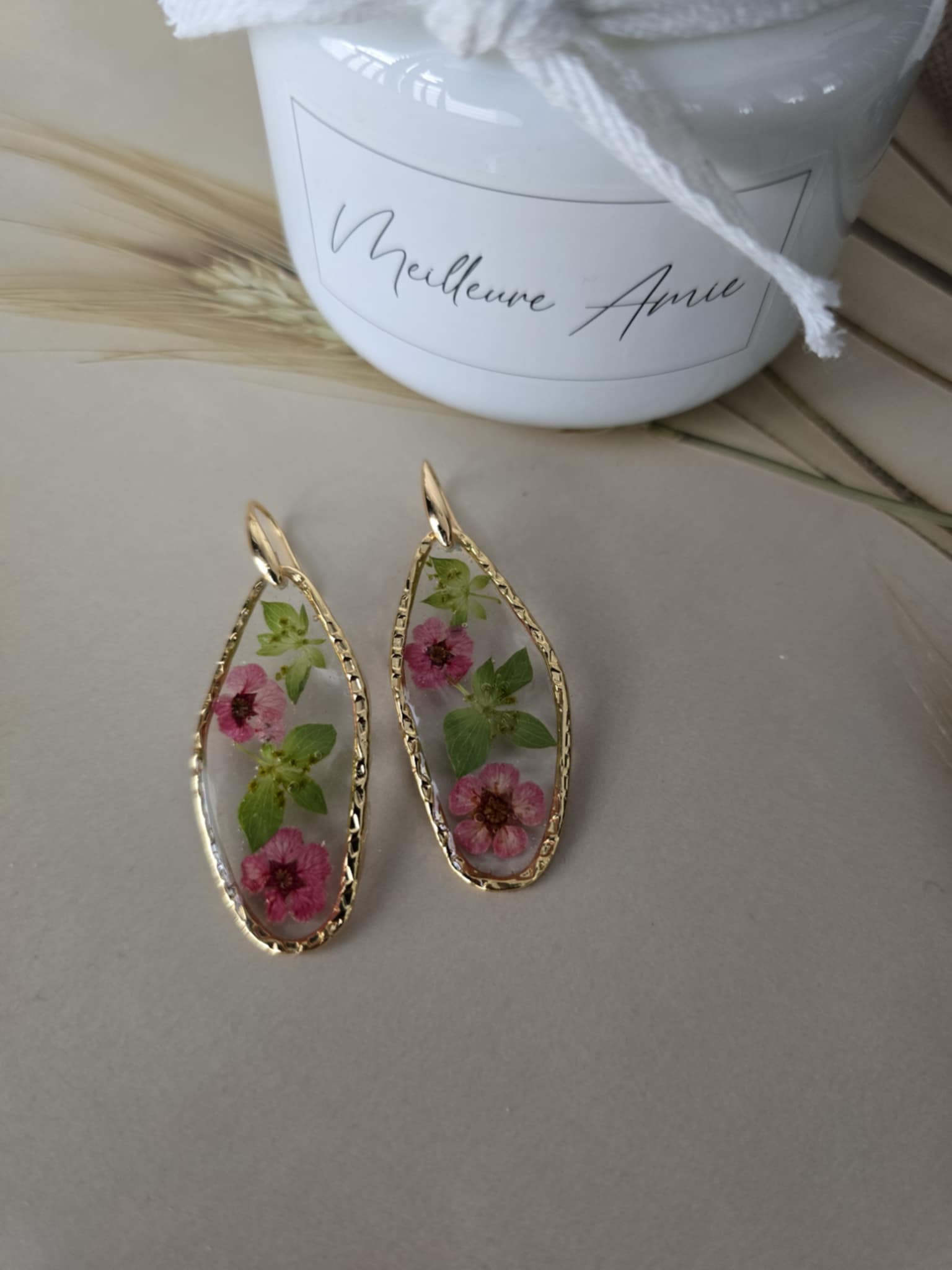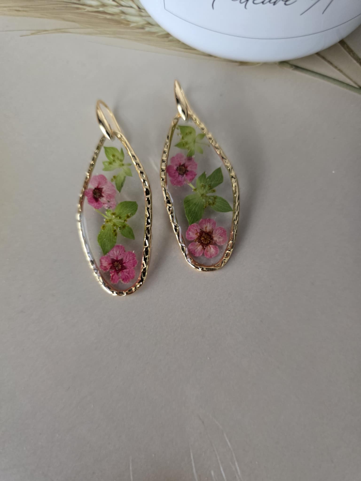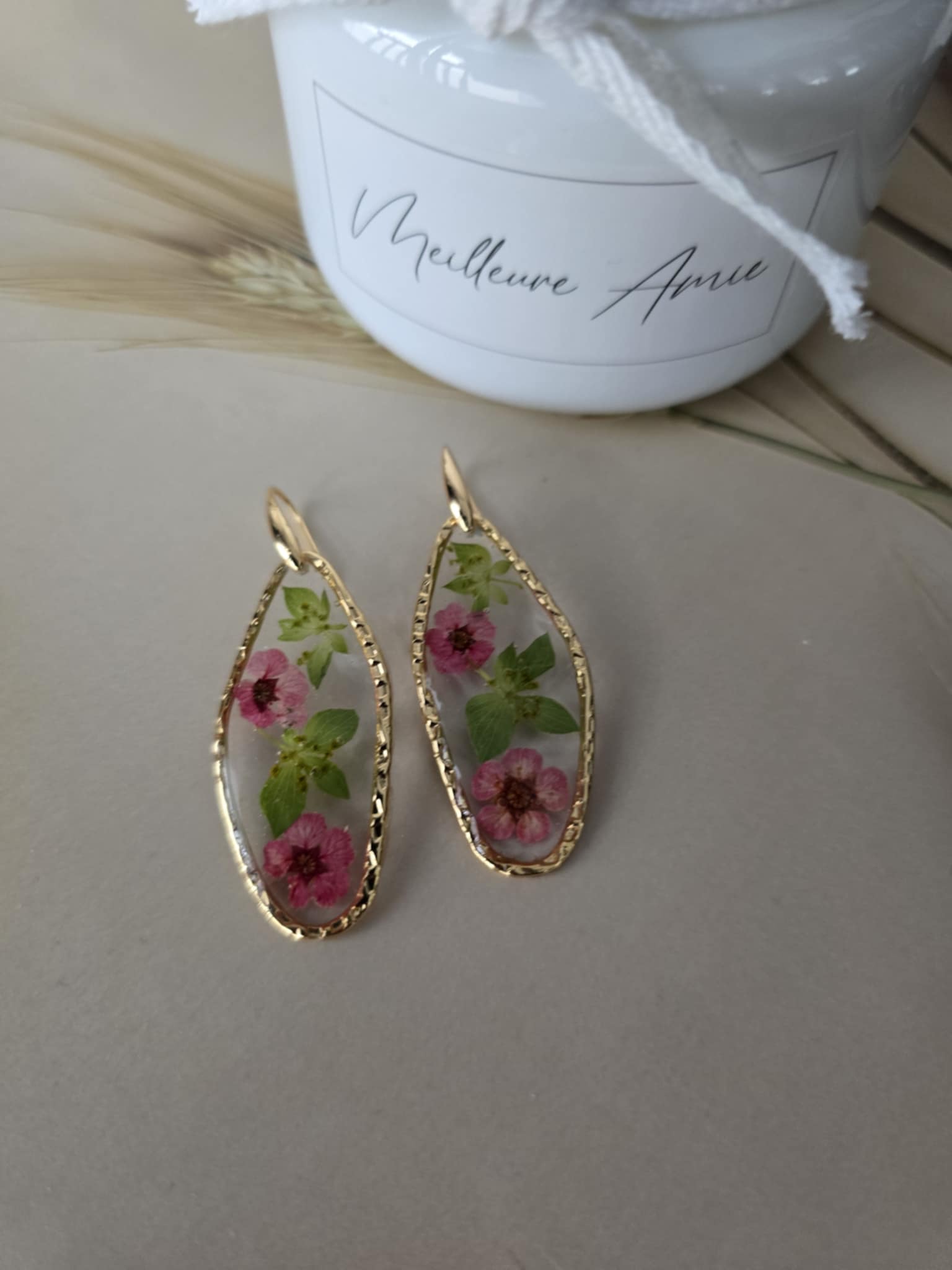 Caractéristiques : les boucles d'oreilles plaquées or, ornées de bijoux en résine avec des fleurs naturelles, sont un accessoire élégant et unique. La résine permet de préserver la beauté des fleurs tout en les mettant en valeur. Ce type de bijou est souvent apprécié pour son aspect artisanal et sa capacité à capturer la nature.
