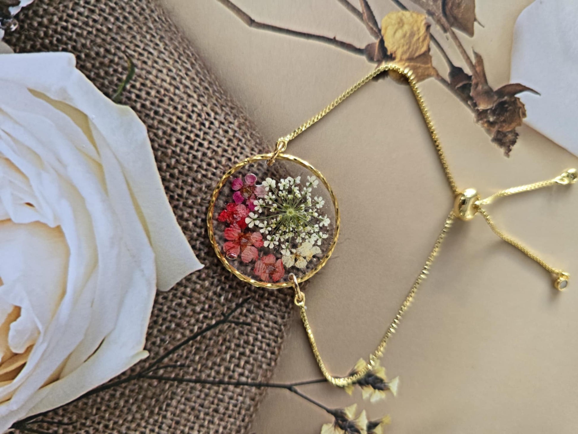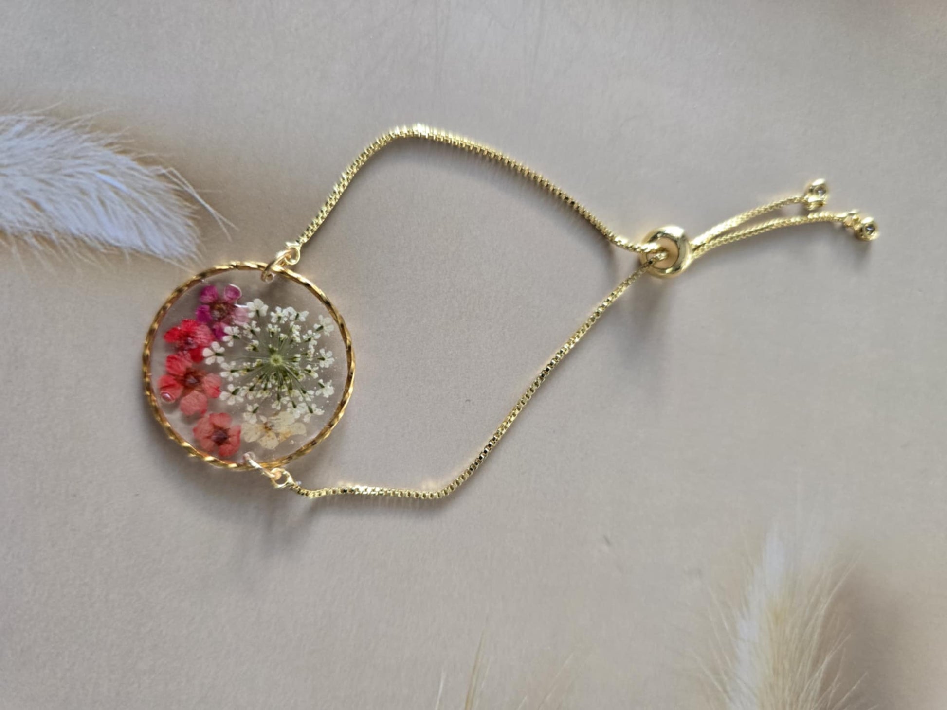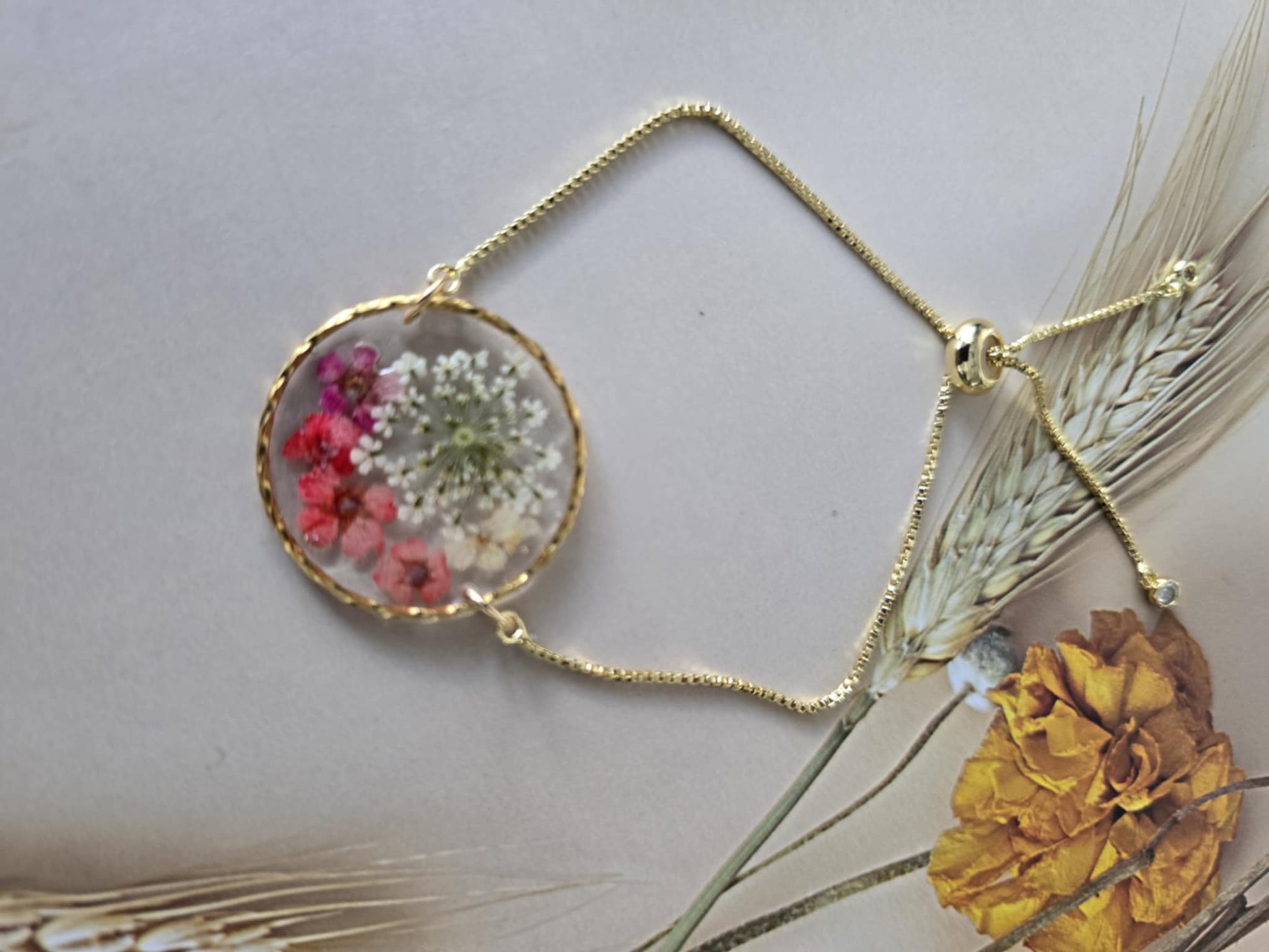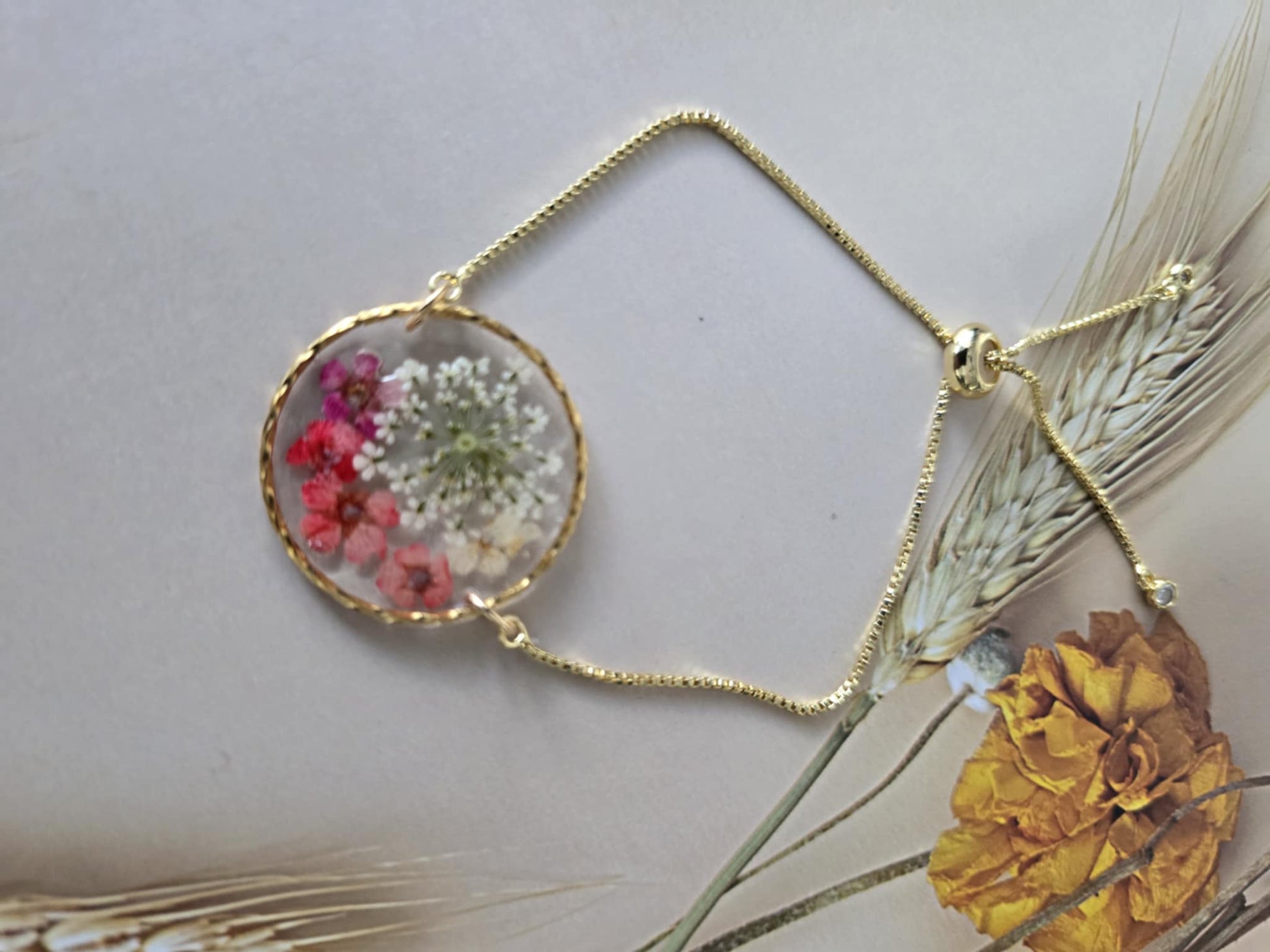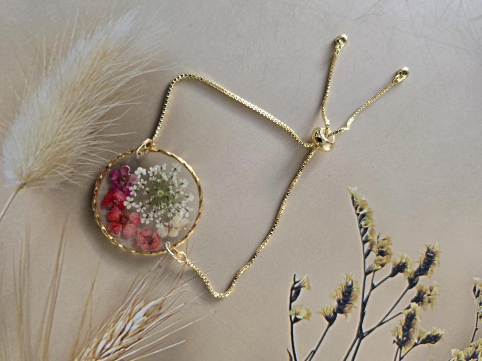 Caractéristiques : un bracelet ajustable plaqué or 14 carats orné de bijoux en résine avec des fleurs naturelles est un accessoire élégant et unique. La résine permet de préserver la beauté des fleurs tout en les mettant en valeur. Ce type de bijou est souvent apprécié pour son aspect artisanal et sa capacité à capturer la nature.