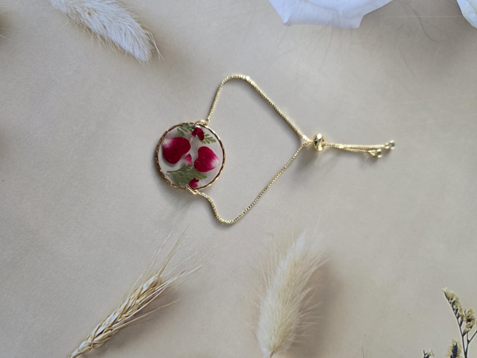 Entretien : bien qu'ils soient généralement durables, il est conseillé d'éviter un contact prolongé avec l'eau ou des produits chimiques pour préserver l'éclat de votre bracelet floral ajustable.