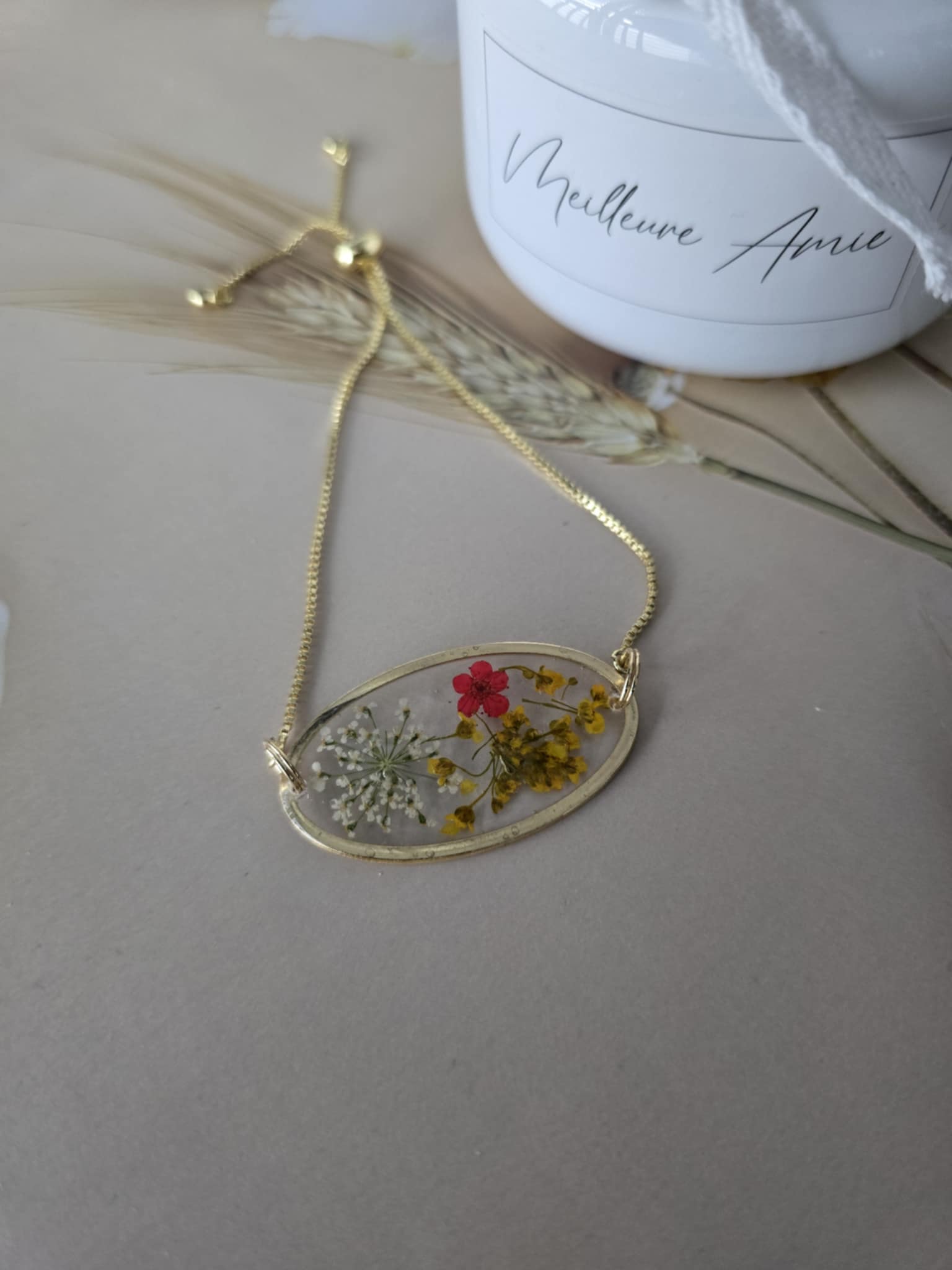 Caractéristiques : un bracelet plaqué or 14 carats orné de bijoux en résine avec des fleurs naturelles est un accessoire élégant et unique. La résine permet de préserver la beauté des fleurs tout en les mettant en valeur. Ce type de bijou est souvent apprécié pour son aspect artisanal et sa capacité à capturer la nature.