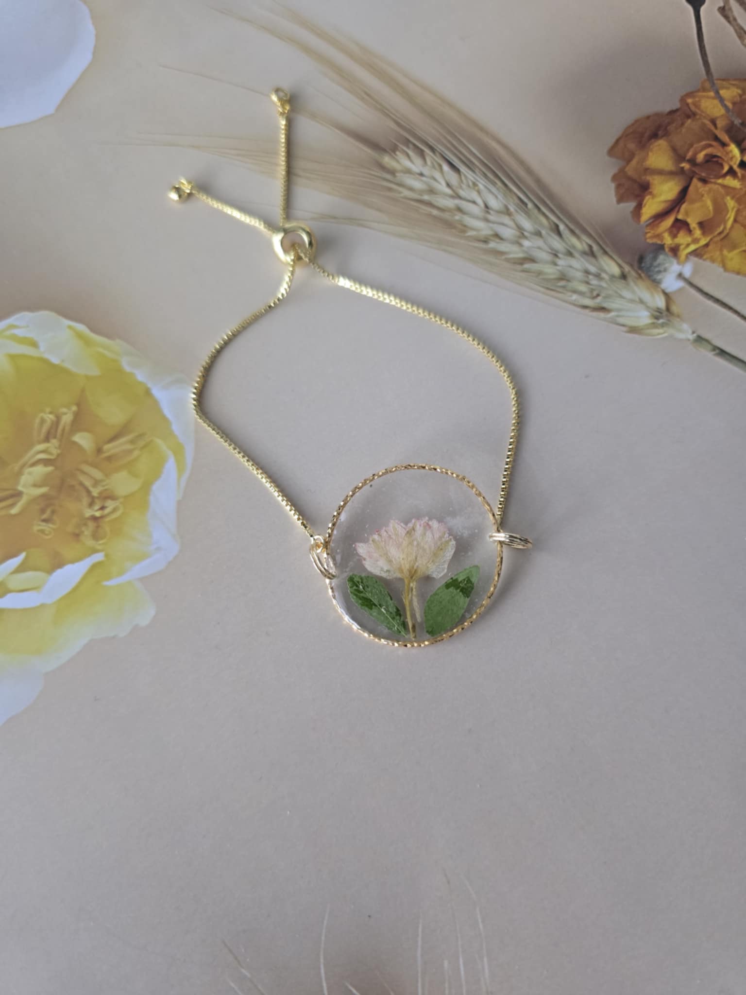 Caractéristiques : un bracelet plaqué or 14 carats orné de bijoux en résine avec des fleurs naturelles est un accessoire élégant et unique. La résine permet de préserver la beauté des fleurs tout en les mettant en valeur. Ce type de bijou est souvent apprécié pour son aspect artisanal et sa capacité à capturer la nature.