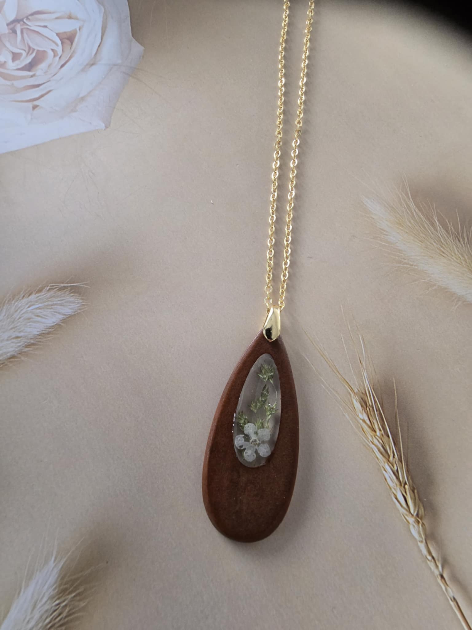 Caractéristiques : une chaîne plaquée or 14 carats ornée de bijoux en résine avec des fleurs naturelles est un accessoire élégant et unique. La résine permet de préserver la beauté des fleurs tout en les mettant en valeur. Ce type de bijou est souvent apprécié pour son aspect artisanal et sa capacité à capturer la nature.
