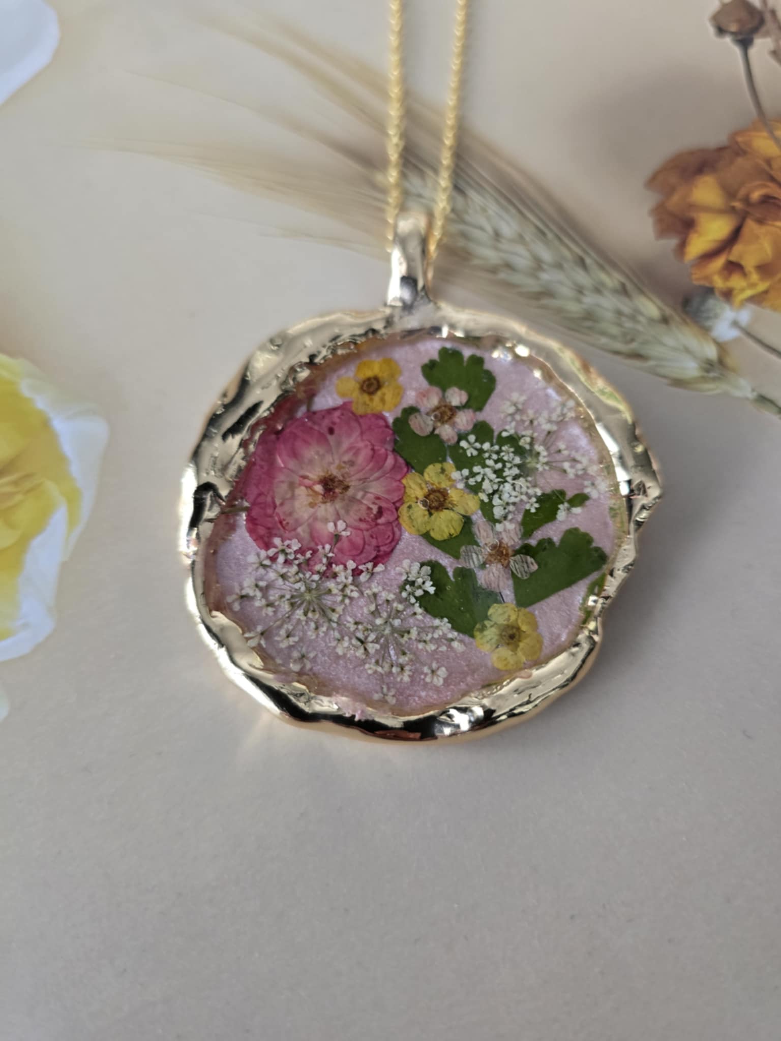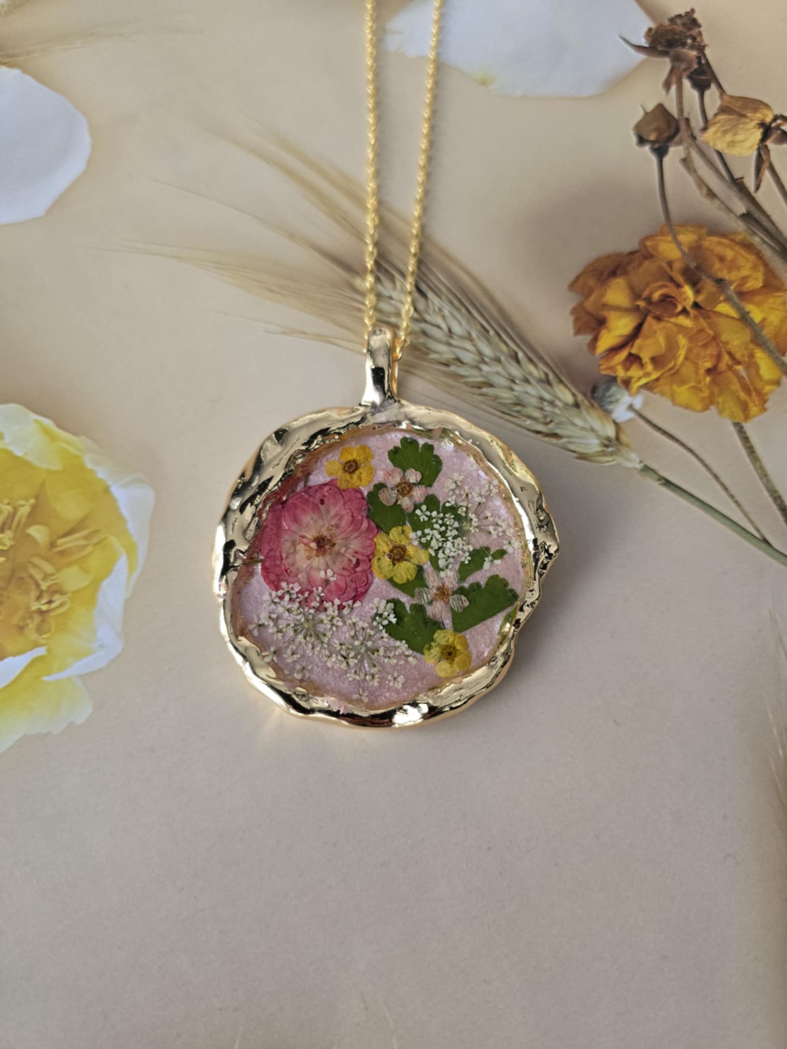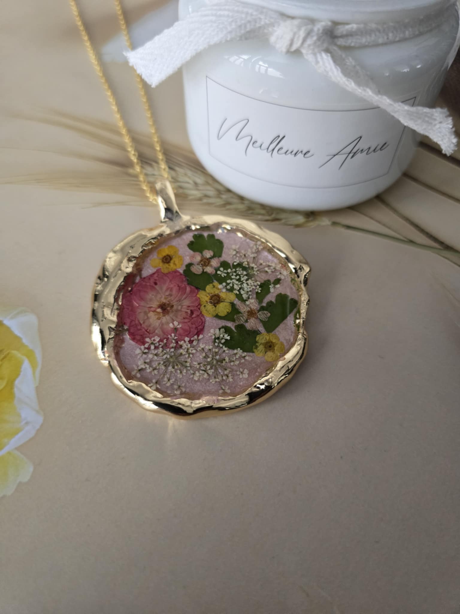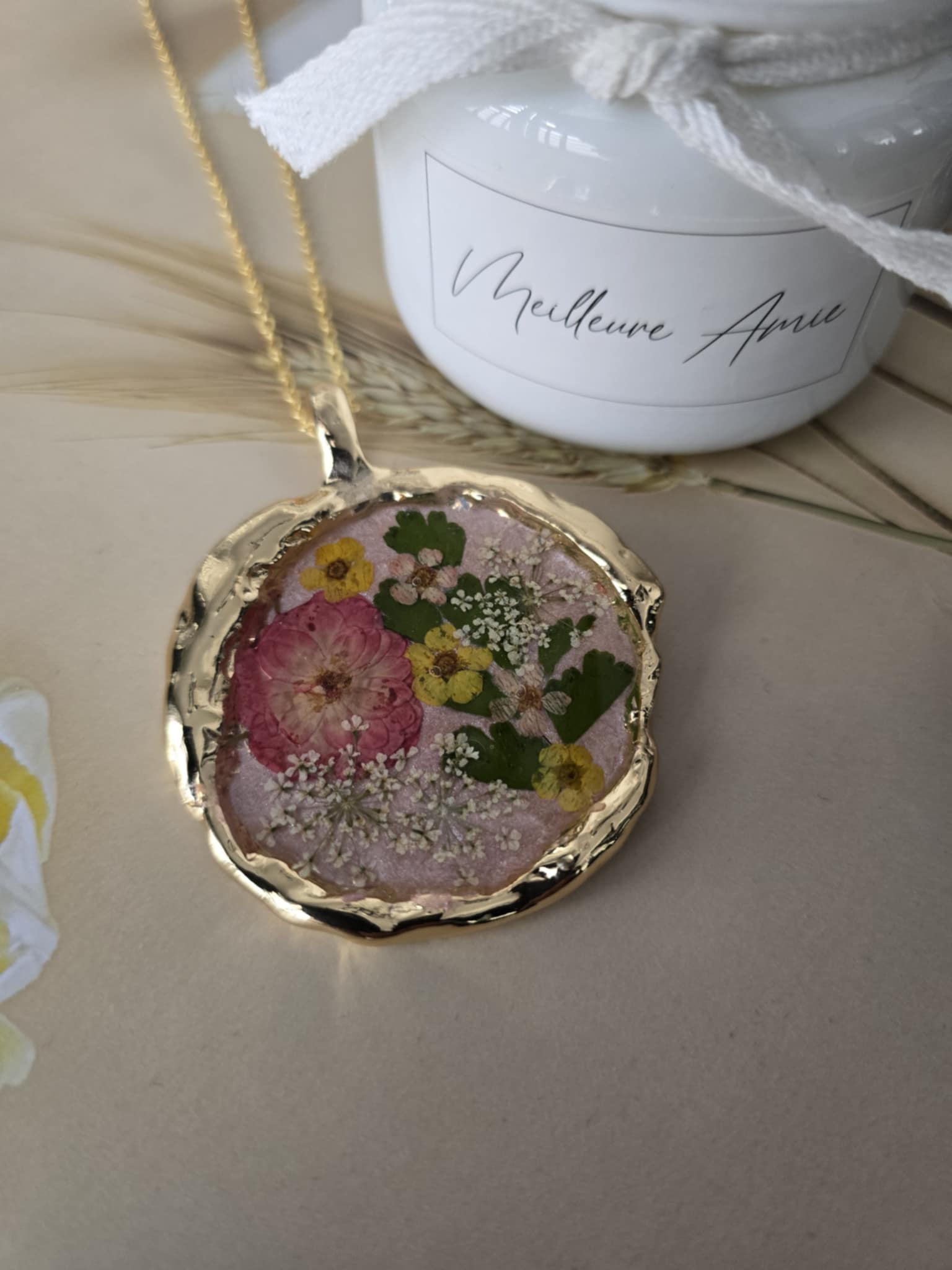 Caractéristiques : une chaîne plaquée or 14 carats ornée de bijoux en résine avec des fleurs naturelles est un accessoire élégant et unique. La résine permet de préserver la beauté des fleurs tout en les mettant en valeur. Ce type de bijou est souvent apprécié pour son aspect artisanal et sa capacité à capturer la nature.