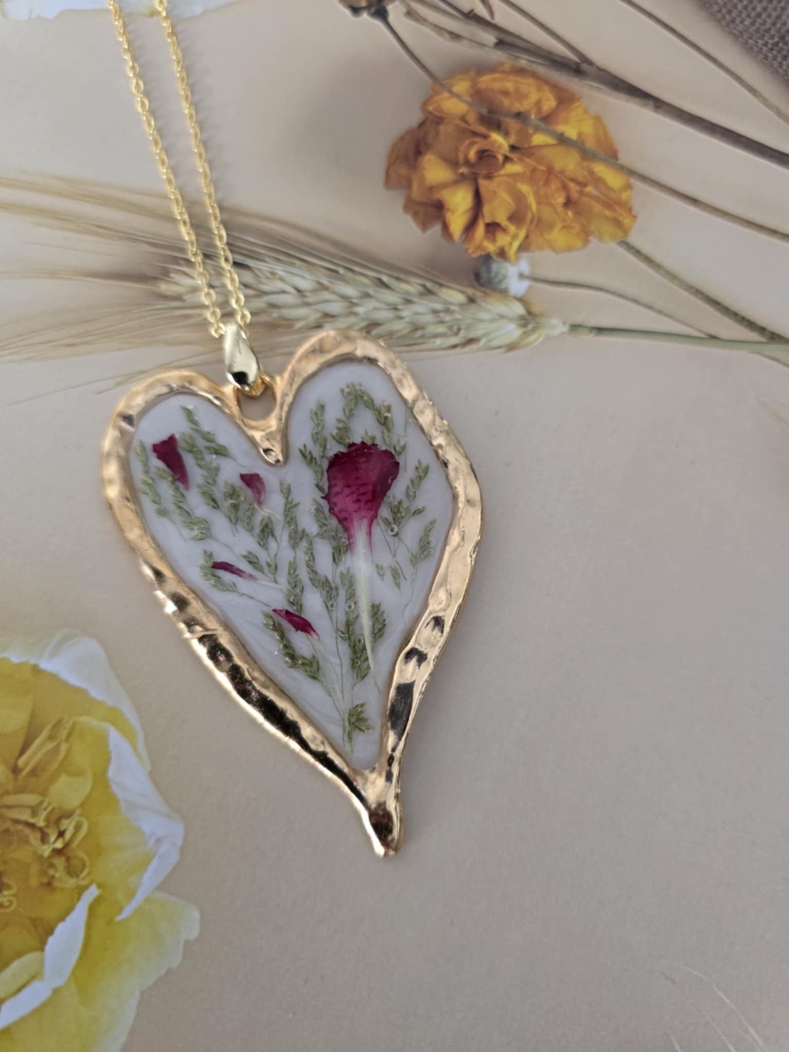 Caractéristiques : une chaîne plaquée or 14 carats ornée de bijoux en résine avec des fleurs naturelles est un accessoire élégant et unique. La résine permet de préserver la beauté des fleurs tout en les mettant en valeur. Ce type de bijou est souvent apprécié pour son aspect artisanal et sa capacité à capturer la nature.