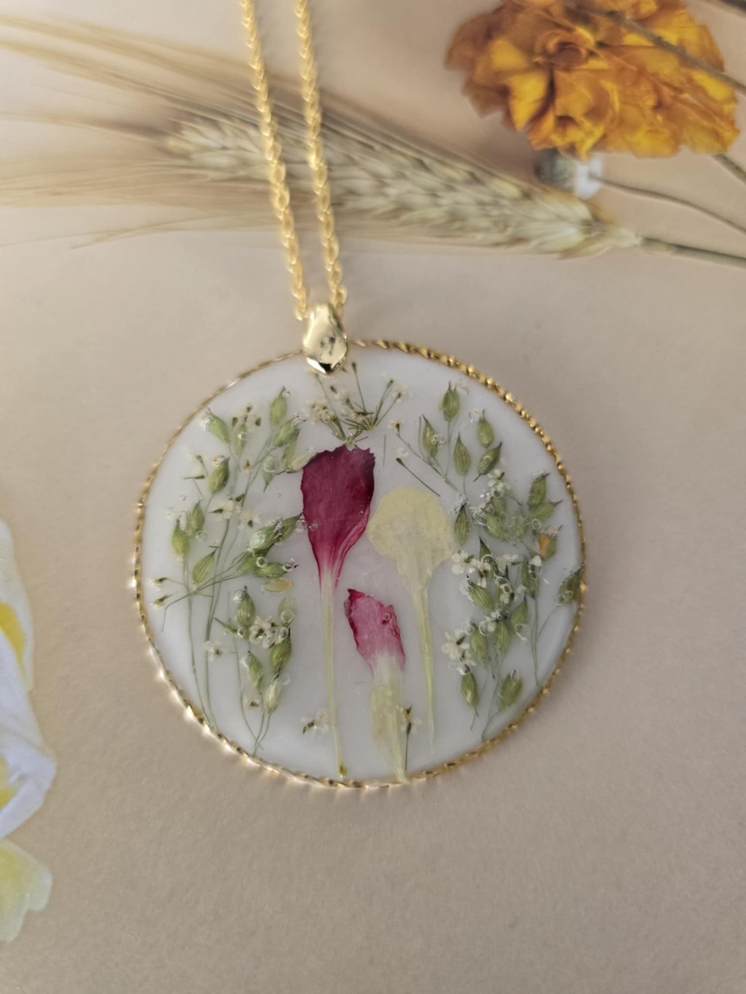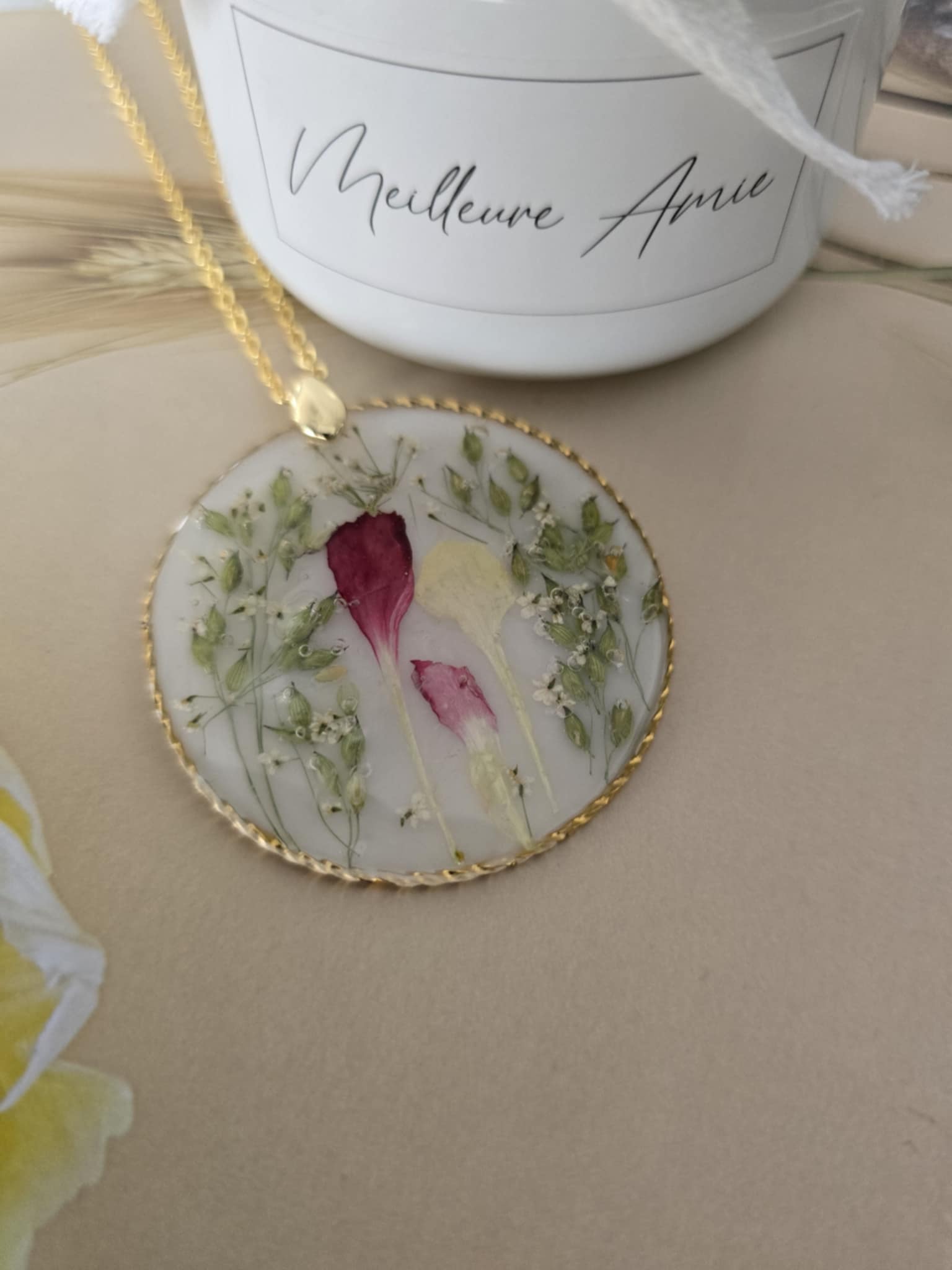 Caractéristique : une chaîne plaquée or 14 carats ornée de bijoux en résine avec des fleurs naturelles est un accessoire élégant et unique. La résine permet de préserver la beauté des fleurs tout en les mettant en valeur. Ce type de bijou est souvent apprécié pour son aspect artisanal et sa capacité à capturer la nature.