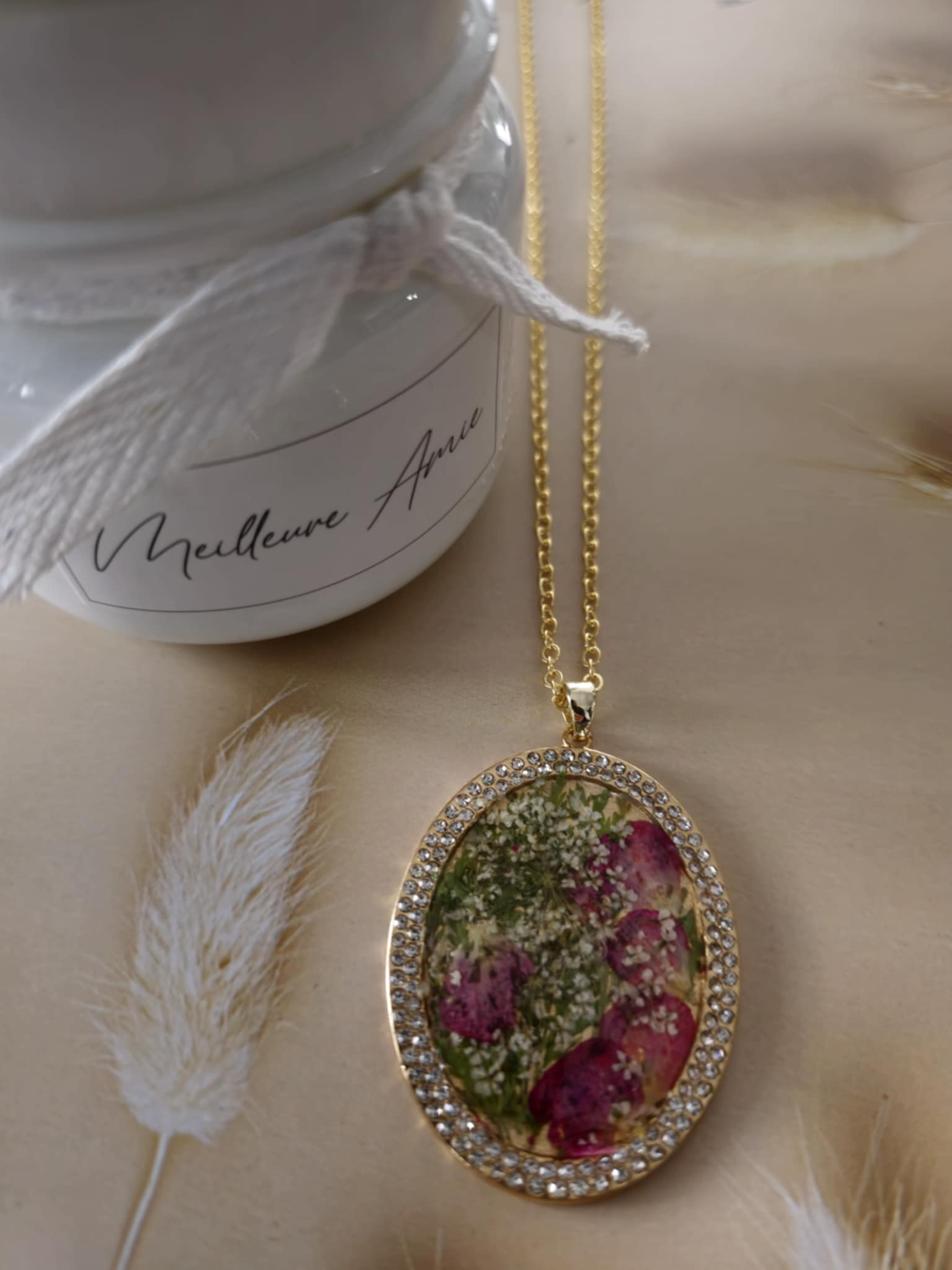 Caractéristiques : une chaîne plaquée or 14 carats ornée de bijoux en résine avec des fleurs naturelles est un accessoire élégant et unique. La résine permet de préserver la beauté des fleurs tout en les mettant en valeur. Ce type de bijou est souvent apprécié pour son aspect artisanal et sa capacité à capturer la nature.