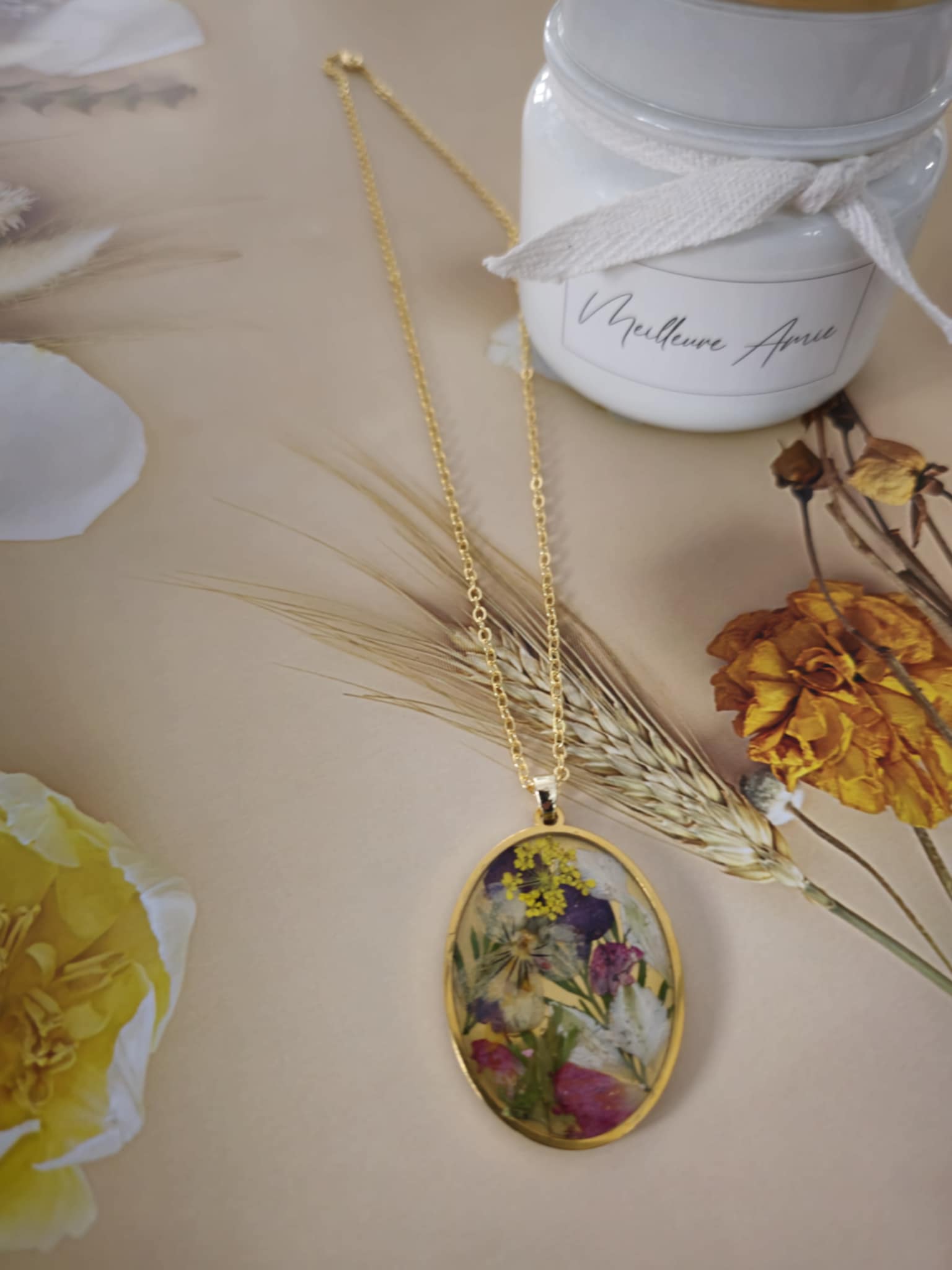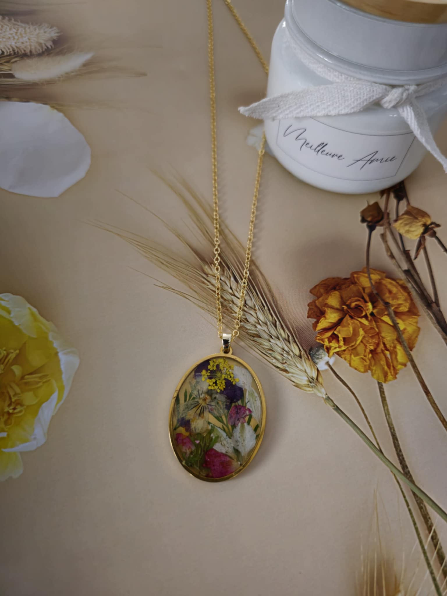 Caractéristiques : une chaîne plaquée or 14 carats ornée de bijoux en résine avec des fleurs naturelles est un accessoire élégant et unique. La résine permet de préserver la beauté des fleurs tout en les mettant en valeur. Ce type de bijou est souvent apprécié pour son aspect artisanal et sa capacité à capturer la nature.