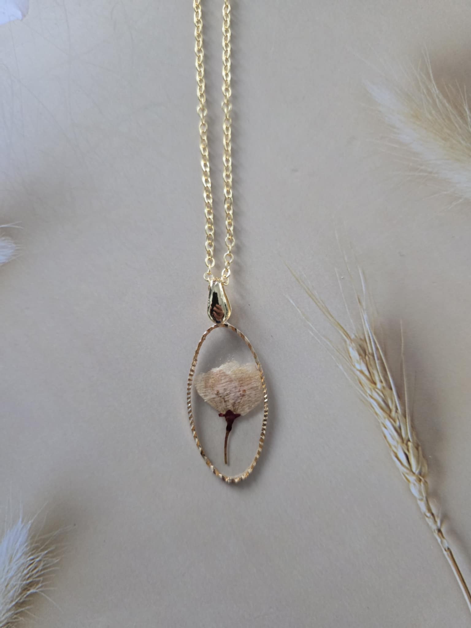 Caractéristiques : une chaîne plaquée or 14 carats ornée de bijoux en résine avec des fleurs naturelles est un accessoire élégant et unique. La résine permet de préserver la beauté des fleurs tout en les mettant en valeur. Ce type de bijou est souvent apprécié pour son aspect artisanal et sa capacité à capturer la nature.