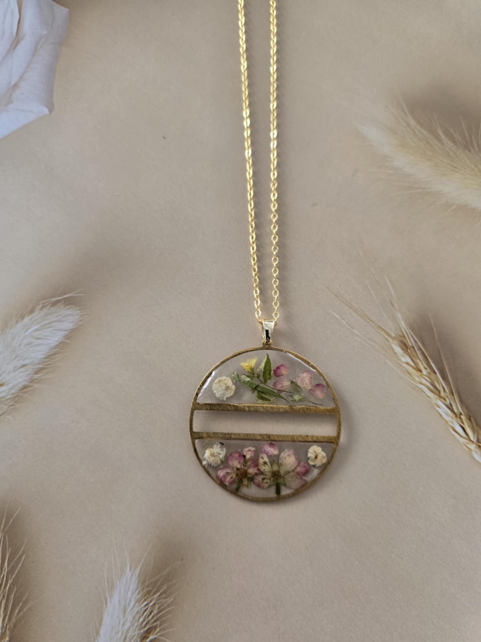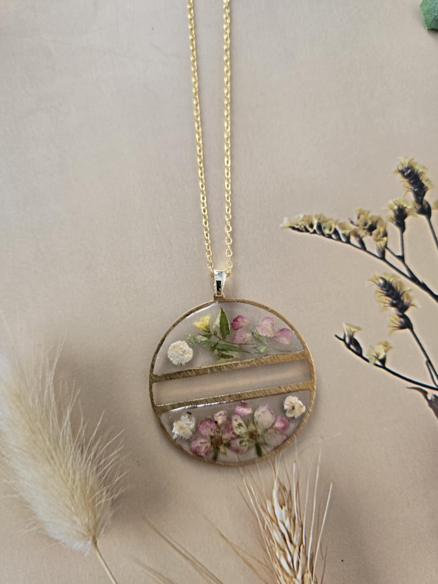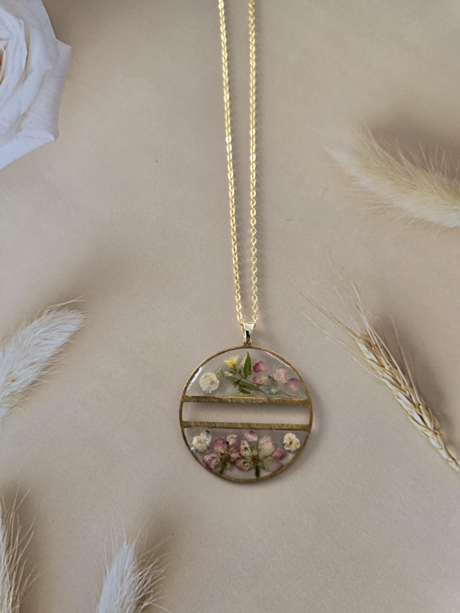 Caractéristiques : une chaîne plaquée or 14 carats ornée de bijoux en résine avec des fleurs naturelles est un accessoire élégant et unique. La résine permet de préserver la beauté des fleurs tout en les mettant en valeur. Ce type de bijou est souvent apprécié pour son aspect artisanal et sa capacité à capturer la nature.