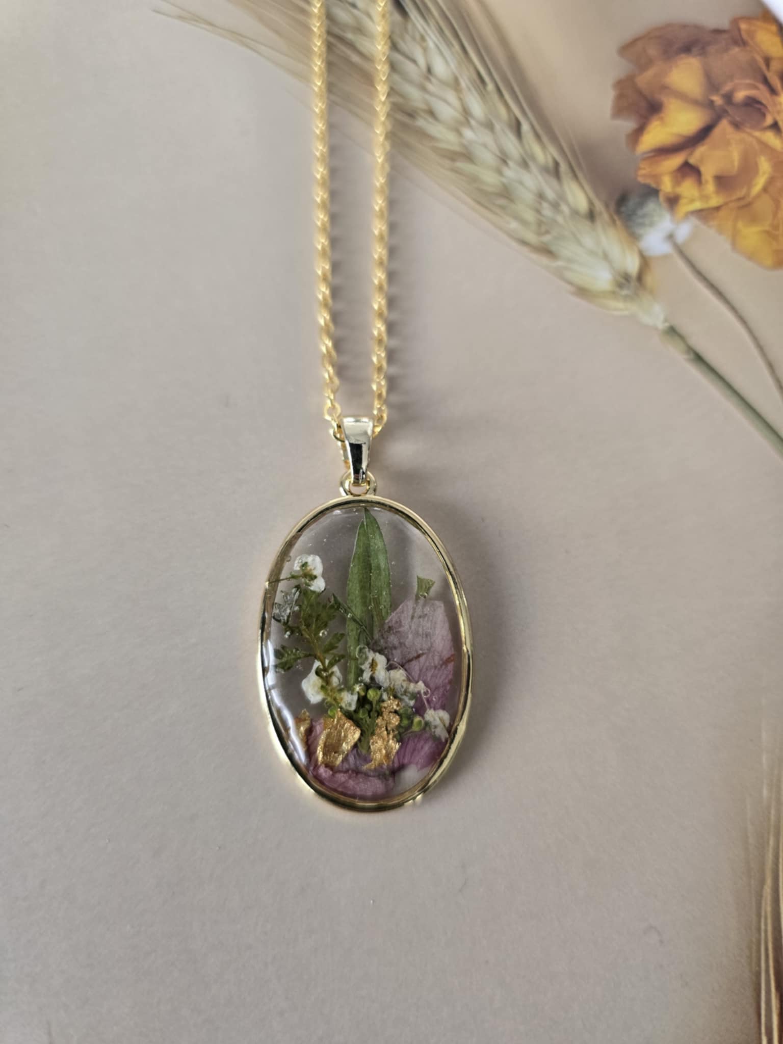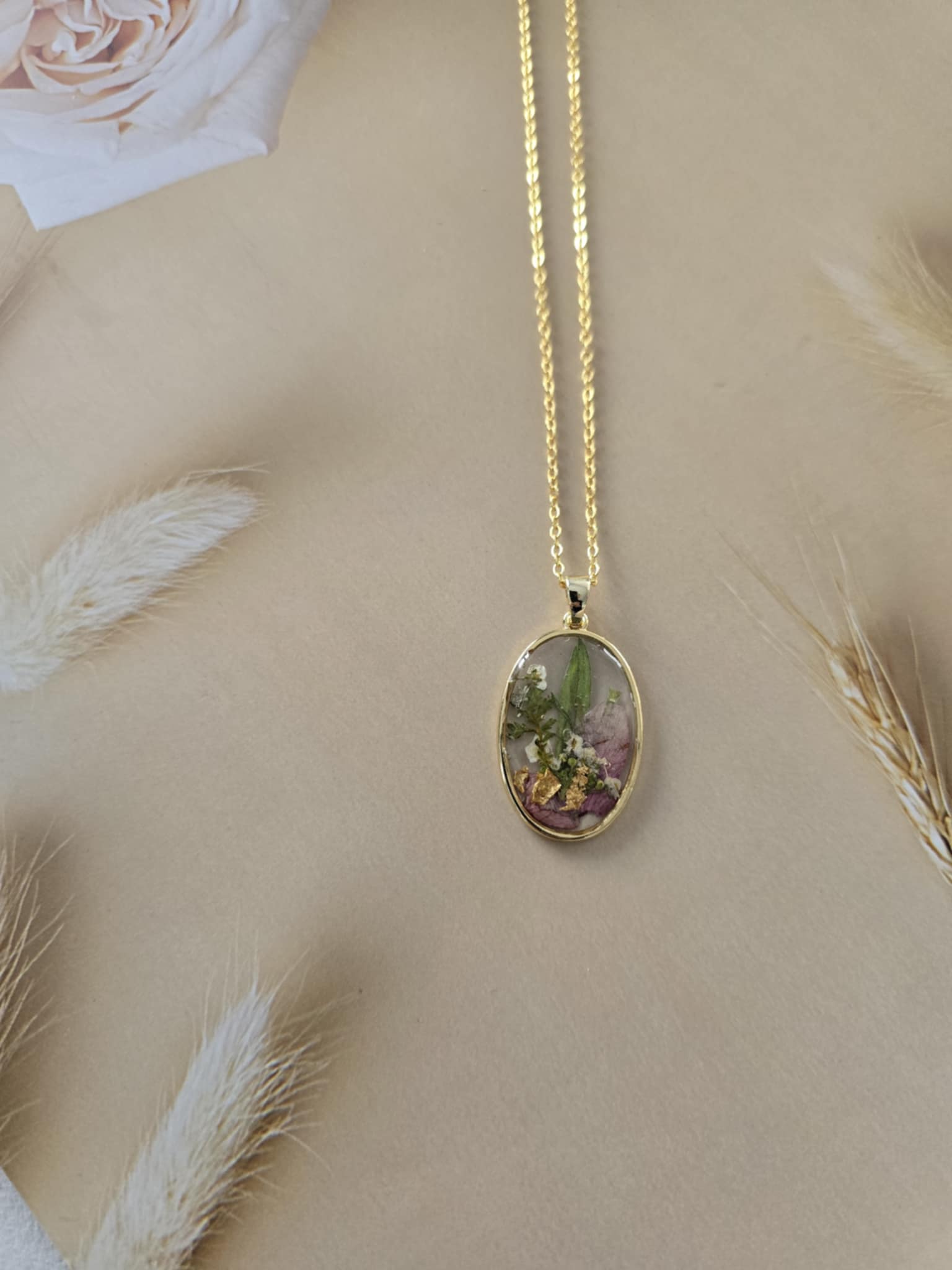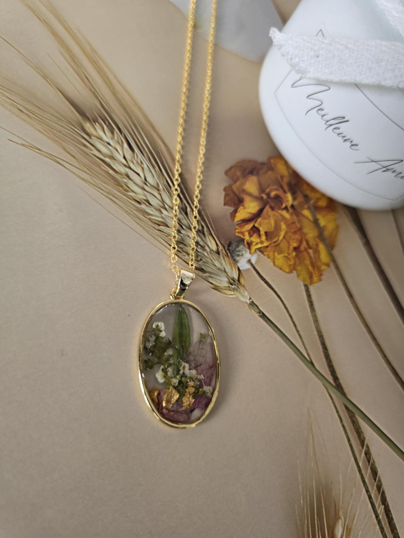Caractéristiques : une chaîne plaquée or 14 carats ornée de bijoux en résine avec des fleurs naturelles est un accessoire élégant et unique. La résine permet de préserver la beauté des fleurs tout en les mettant en valeur. Ce type de bijou est souvent apprécié pour son aspect artisanal et sa capacité à capturer la nature.