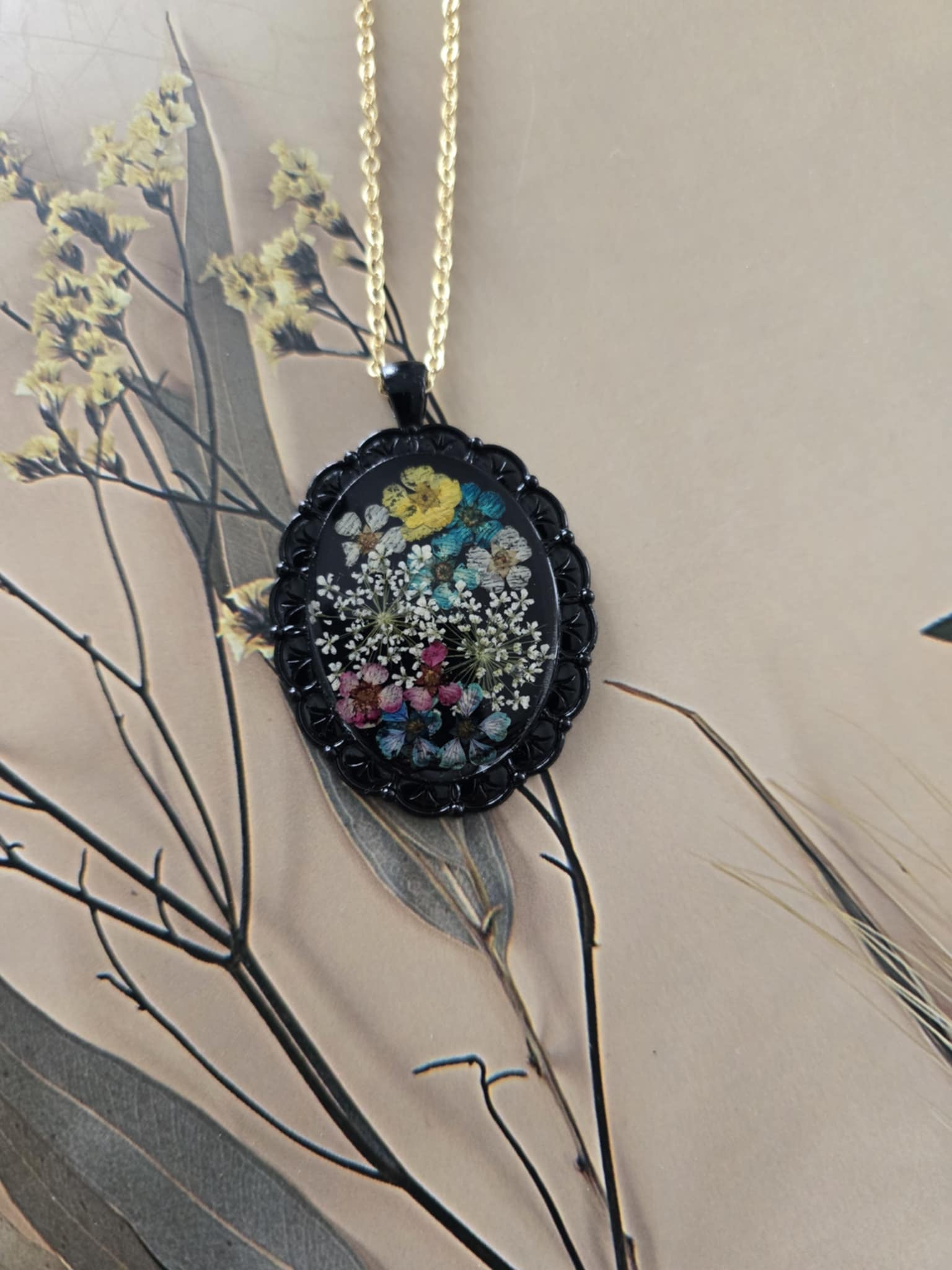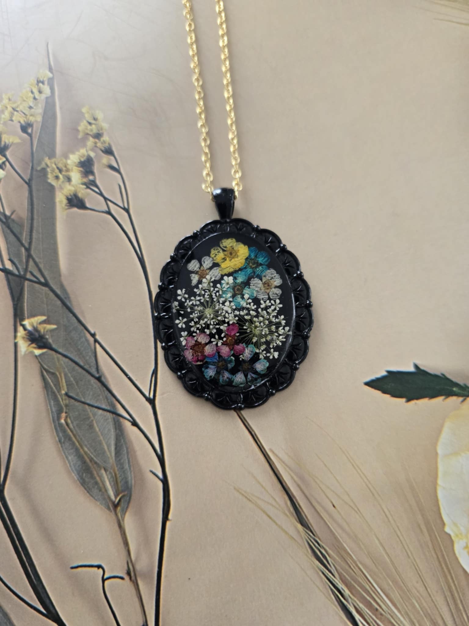 Caractéristiques : une chaîne plaquée or 14 carats ornée de bijoux en résine avec des fleurs naturelles est un accessoire élégant et unique. La résine permet de préserver la beauté des fleurs tout en les mettant en valeur. Ce type de bijou est souvent apprécié pour son aspect artisanal et sa capacité à capturer la nature.