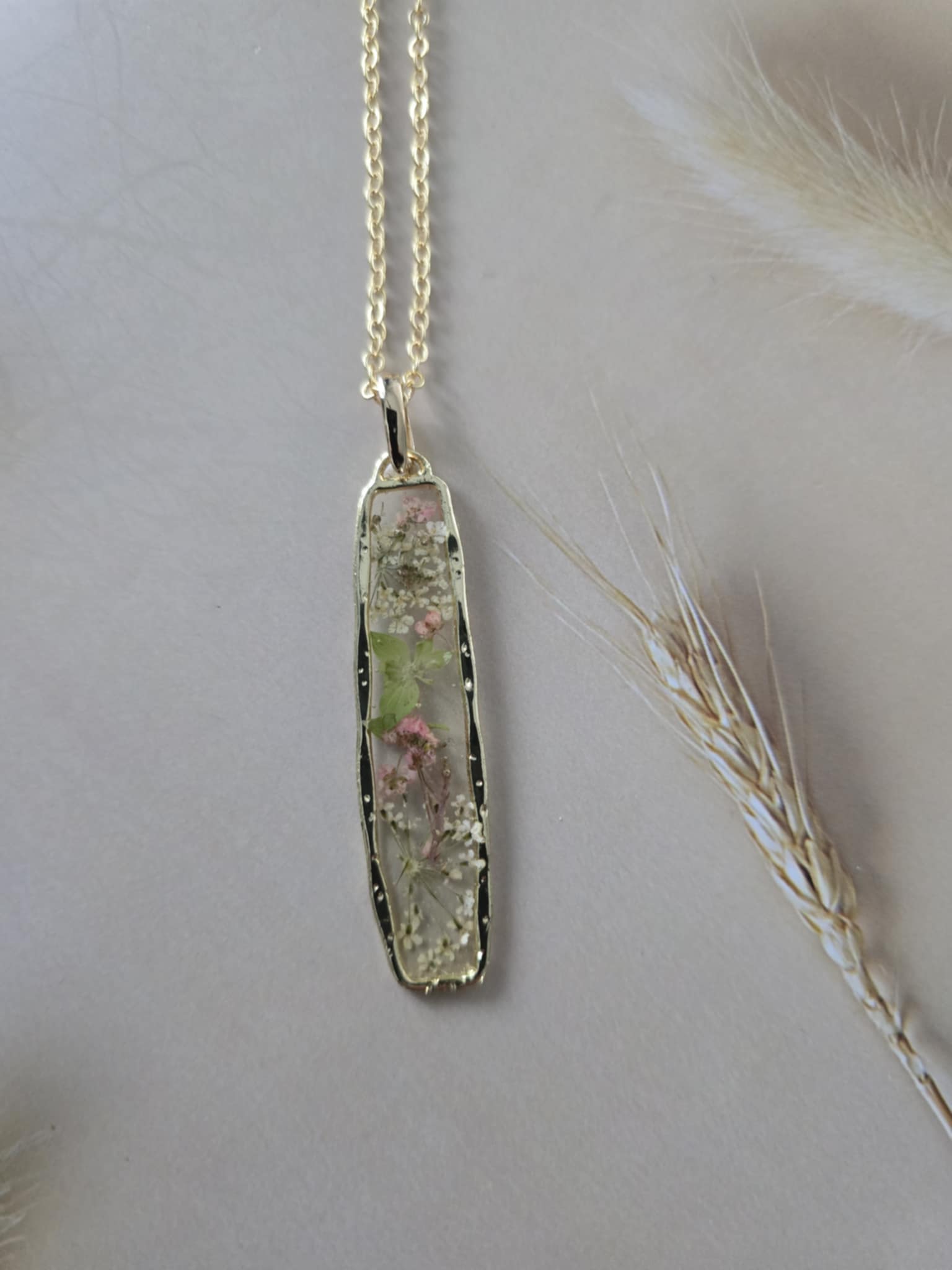 Caractéristiques : une chaîne plaquée or 14 carats ornée de bijoux en résine avec des fleurs naturelles est un accessoire élégant et unique. La résine permet de préserver la beauté des fleurs tout en les mettant en valeur. Ce type de bijou est souvent apprécié pour son aspect artisanal et sa capacité à capturer la nature.