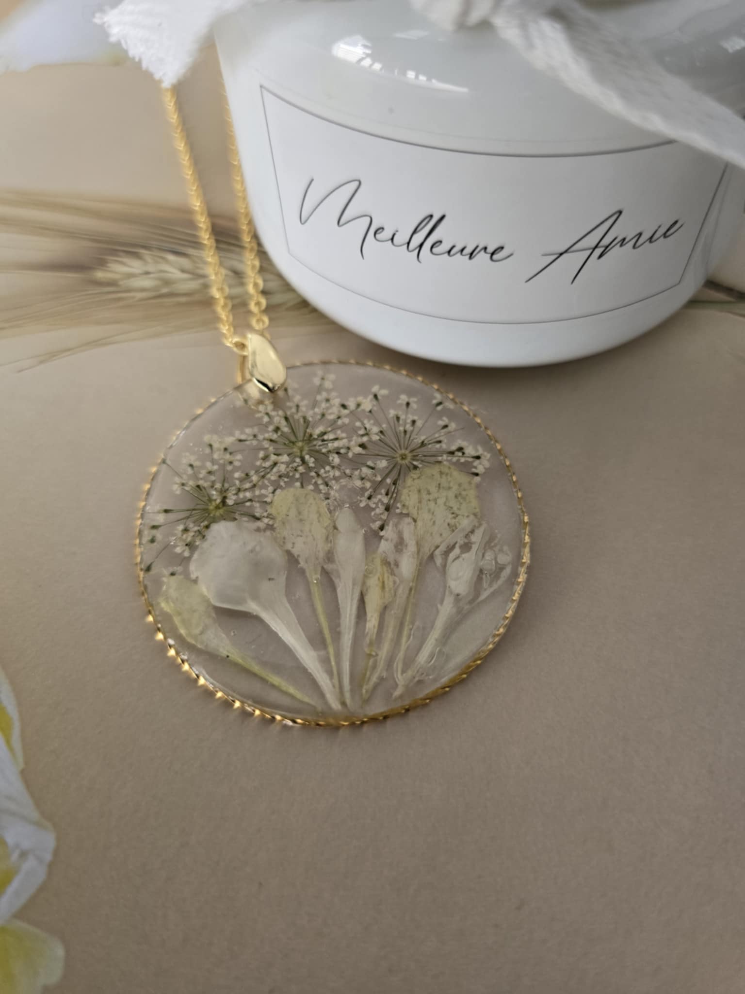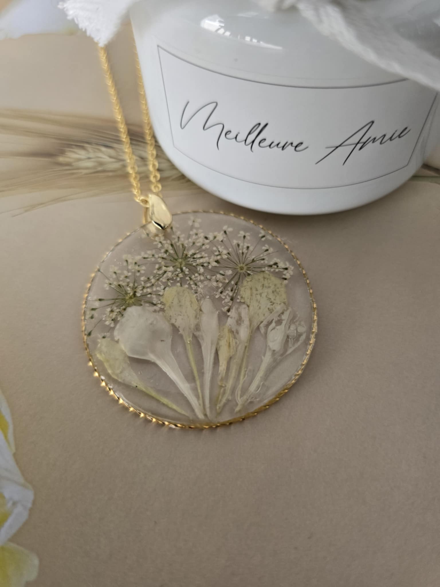 Caractéristique : une chaîne plaquée or 14 carats ornée de bijoux en résine avec des fleurs naturelles est un accessoire élégant et unique. La résine permet de préserver la beauté des fleurs tout en les mettant en valeur. Ce type de bijou est souvent apprécié pour son aspect artisanal et sa capacité à capturer la nature.