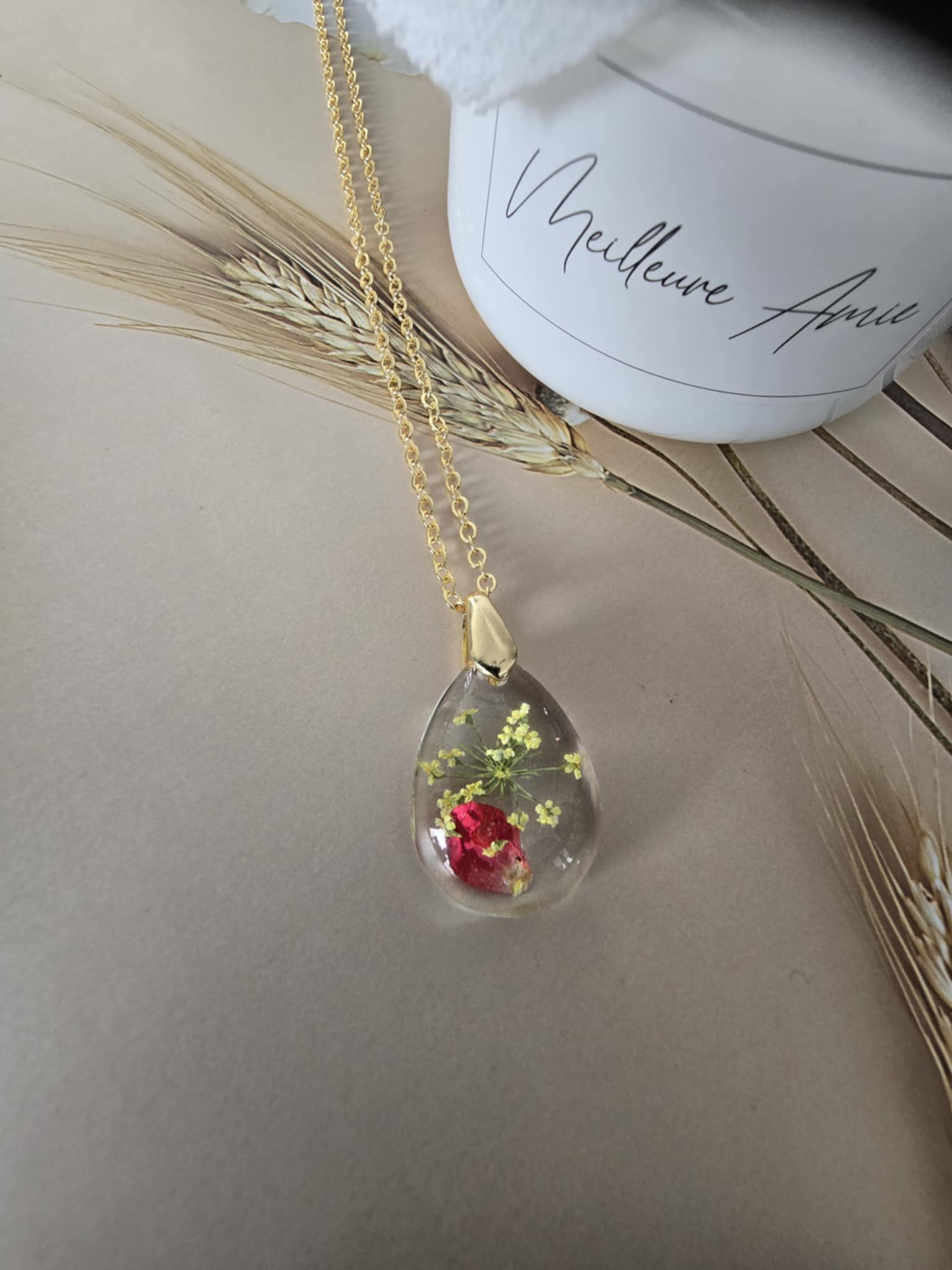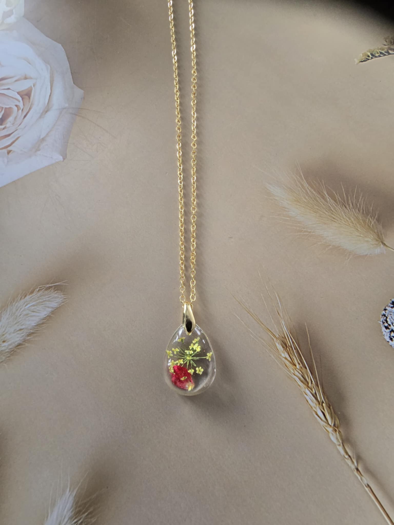 Caractéristiques : une chaîne plaquée or 14 carats ornée de bijoux en résine avec des fleurs naturelles est un accessoire élégant et unique. La résine permet de préserver la beauté des fleurs tout en les mettant en valeur. Ce type de bijou est souvent apprécié pour son aspect artisanal et sa capacité à capturer la nature.