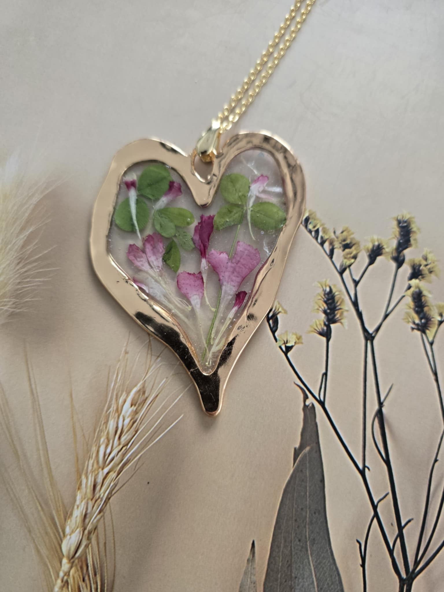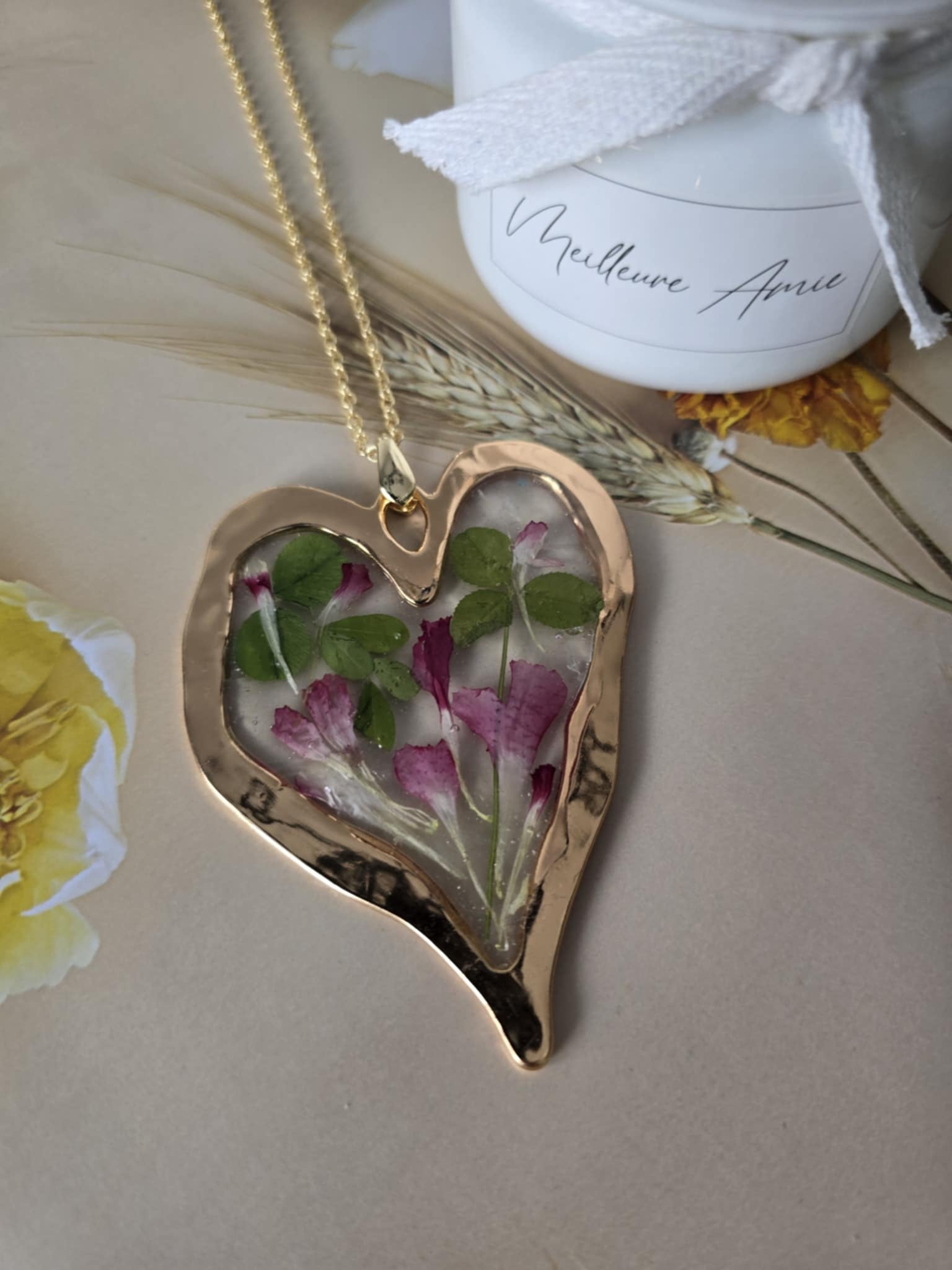 Découvrez votre grand amour avec ce pendentif floral unique ! Portez-le pour une touche de romance et exprimez votre côté audacieux en empruntant le chemin de la passion. Un symbole de votre amour sans fin, ce pendentif ajoute une touche de courage et d'aventure à votre garde-robe. Une chaîne plaquée or 14 carats ornée de bijoux en résine avec des fleurs naturelles est un accessoire élégant et unique. La résine permet de préserver la beauté des fleurs tout en les mettant en valeur. Ce type de bijou est souvent apprécié pour son aspect artisanal et sa capacité à capturer la nature.