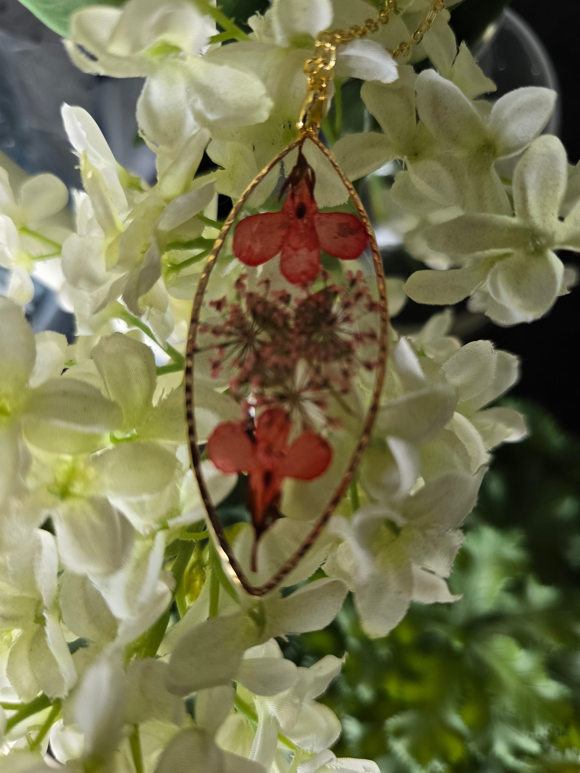 Spécifications : une chaîne plaquée or 14 k avec des bijoux contenant des fleurs naturelles est un accessoire élégant et unique. Ces bijoux sont fabriqués avec de véritables fleurs ce qui leur confère une apparence délicate et artistique.