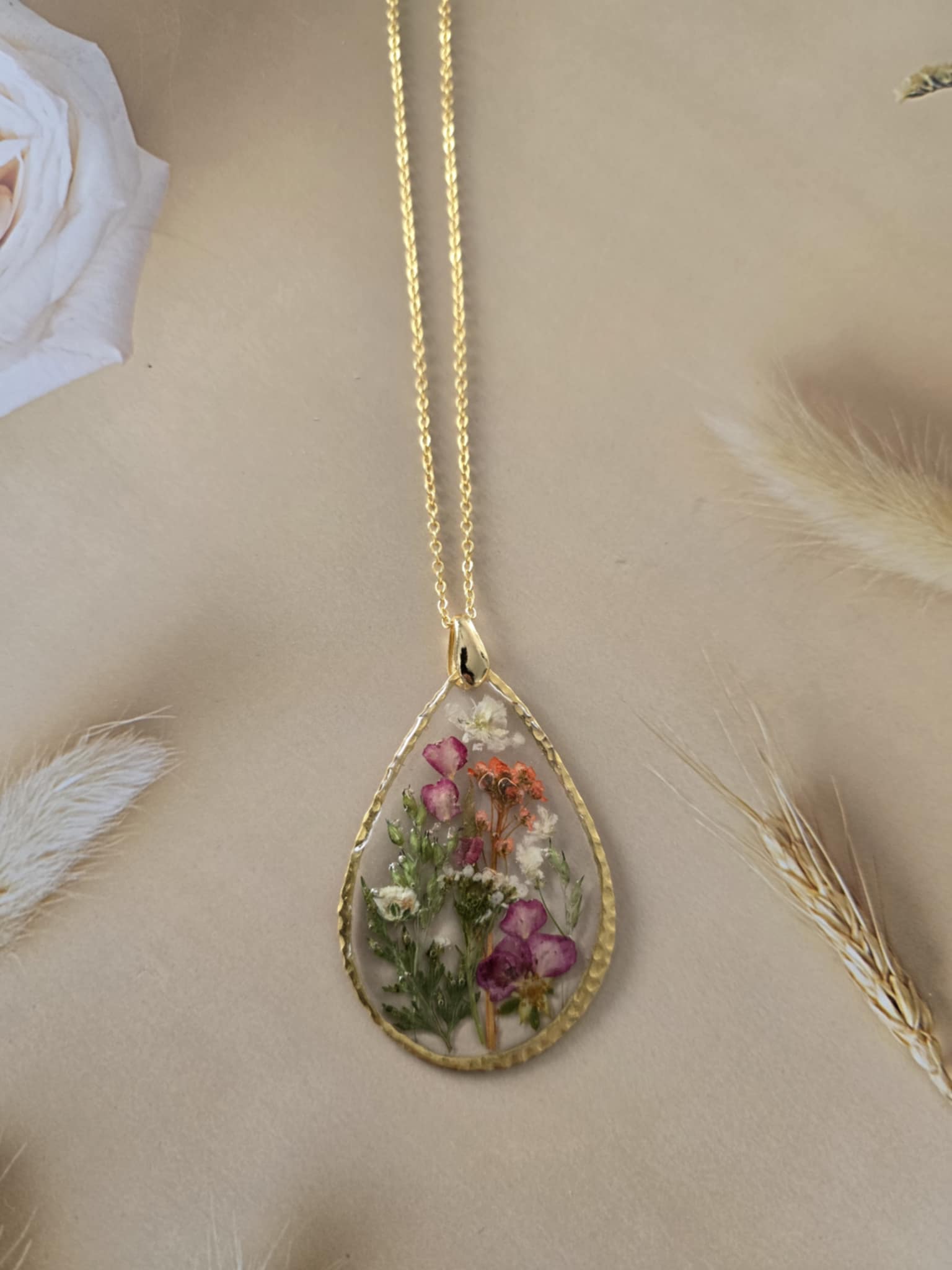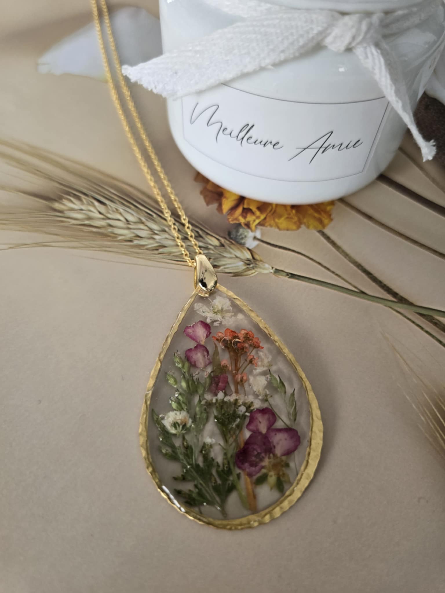Caractéristiques : une chaîne plaquée or 14 carats ornée de bijoux en résine avec des fleurs naturelles est un accessoire élégant et unique. La résine permet de préserver la beauté des fleurs tout en les mettant en valeur. Ce type de bijou est souvent apprécié pour son aspect artisanal et sa capacité à capturer la nature.