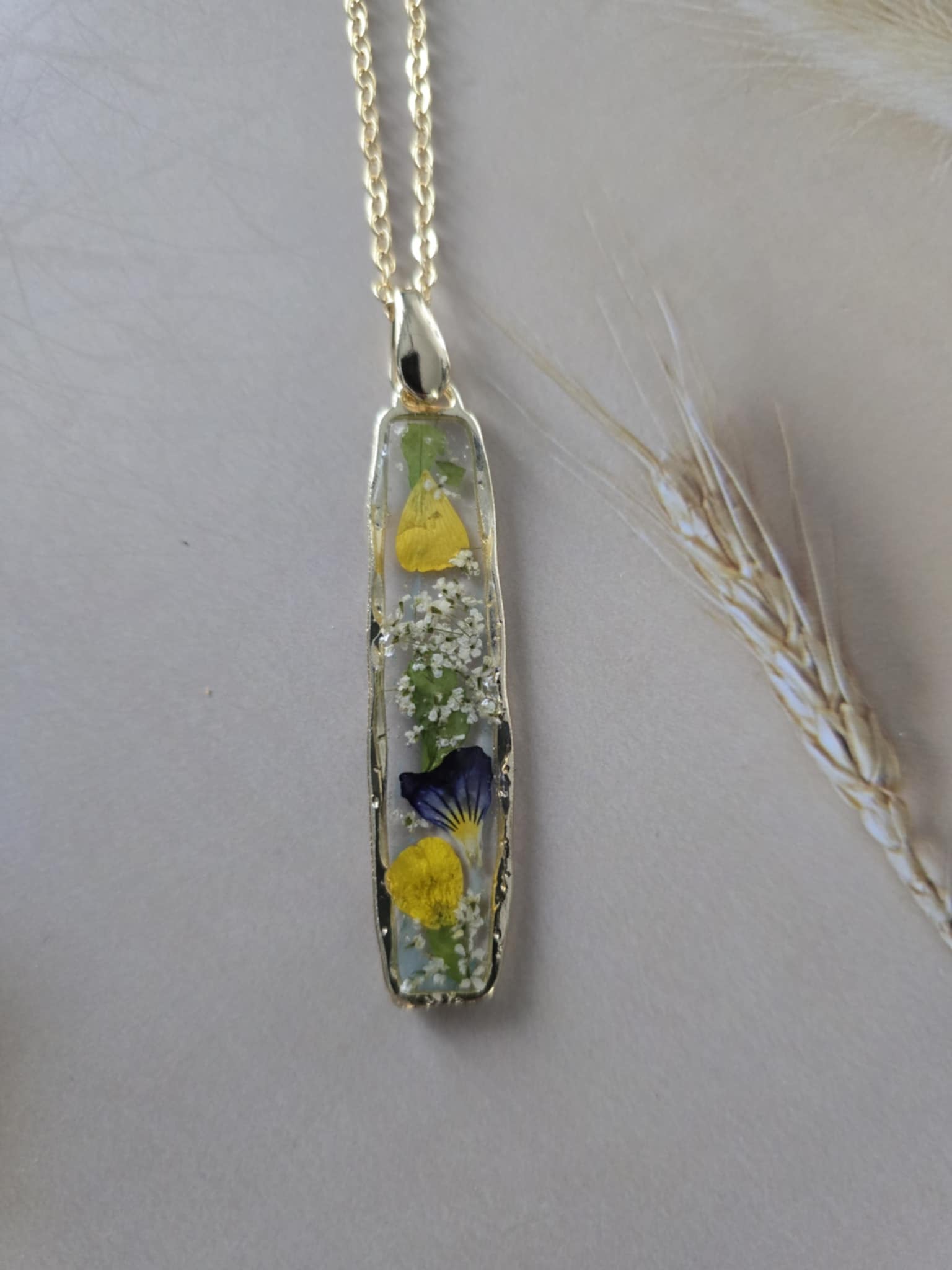 Caractéristiques : une chaîne plaquée or 14 carats ornée de bijoux en résine avec des fleurs naturelles est un accessoire élégant et unique. La résine permet de préserver la beauté des fleurs tout en les mettant en valeur. Ce type de bijou est souvent apprécié pour son aspect artisanal et sa capacité à capturer la nature
