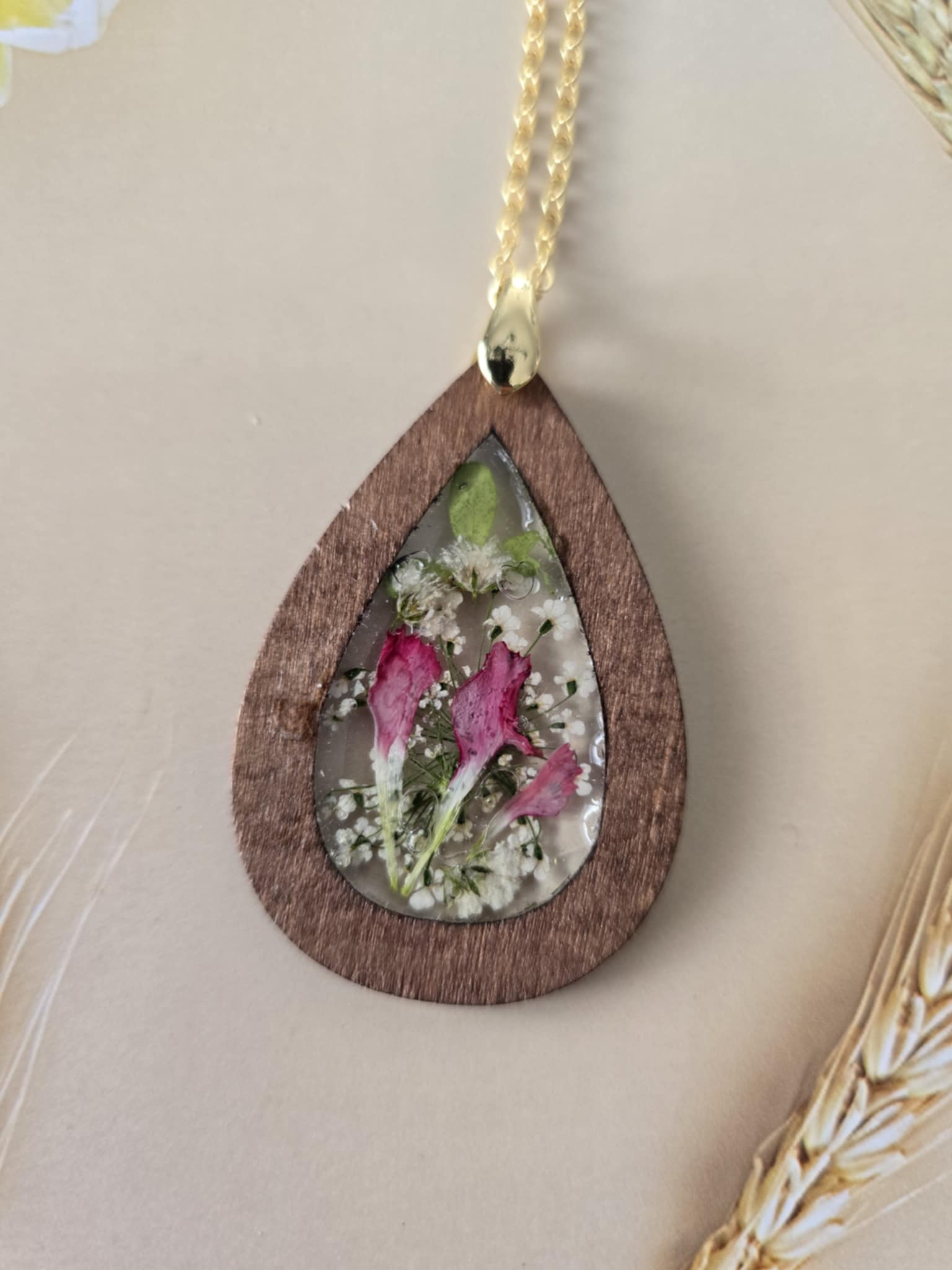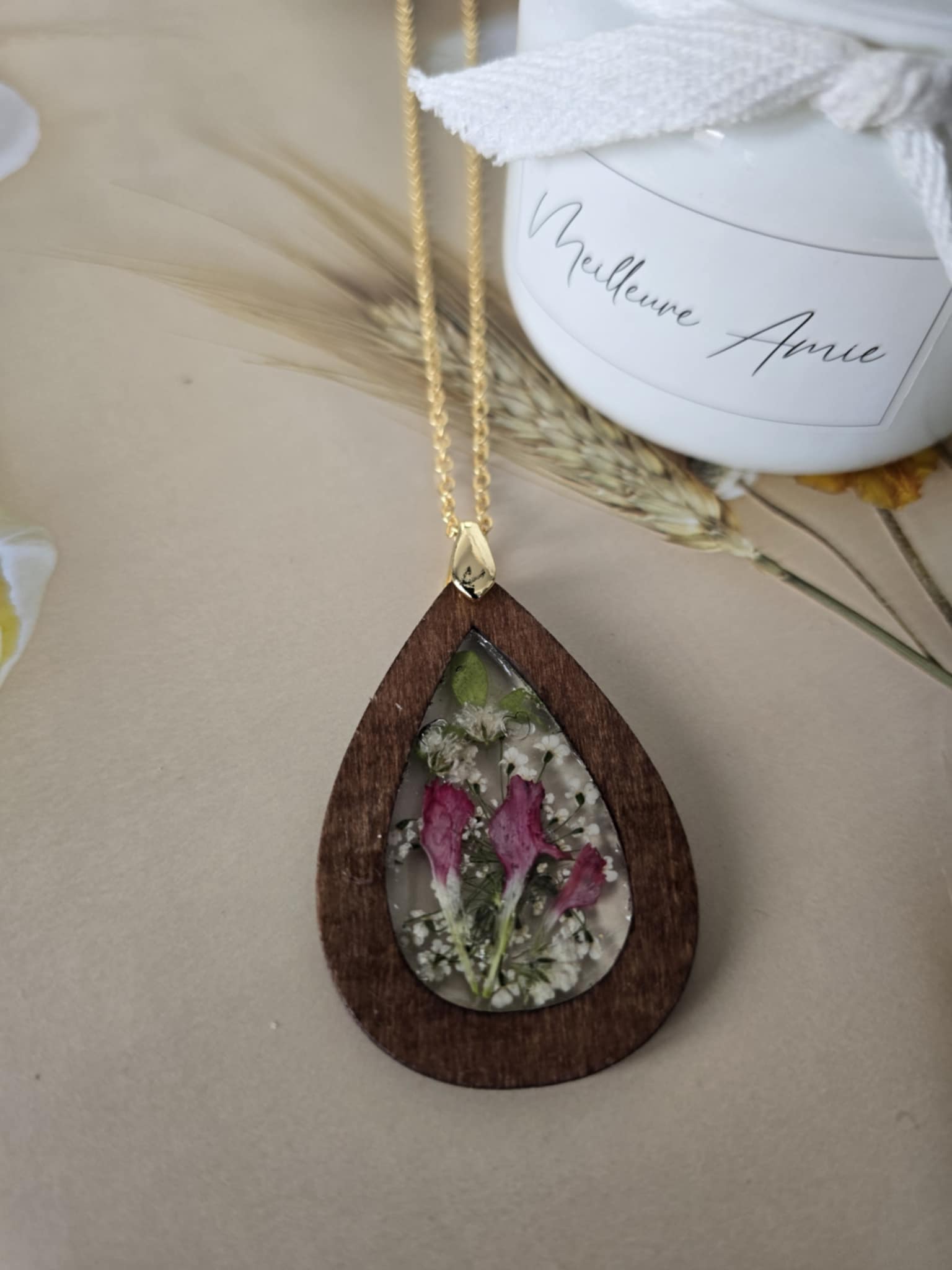 Caractéristiques : une chaîne plaquée or 14 carats ornée de bijoux en résine avec des fleurs naturelles est un accessoire élégant et unique. La résine permet de préserver la beauté des fleurs tout en les mettant en valeur. Ce type de bijou est souvent apprécié pour son aspect artisanal et sa capacité à capturer la nature.