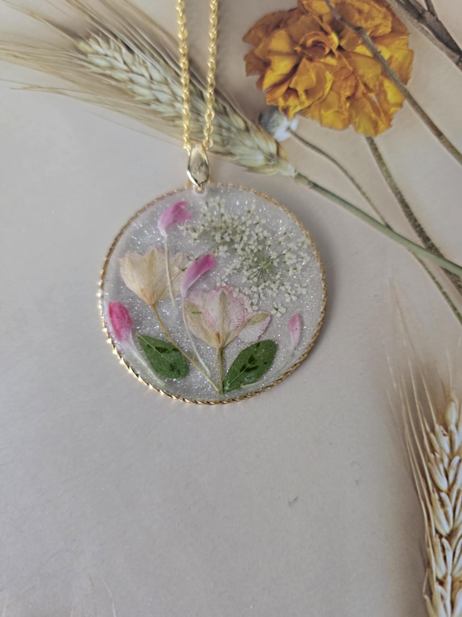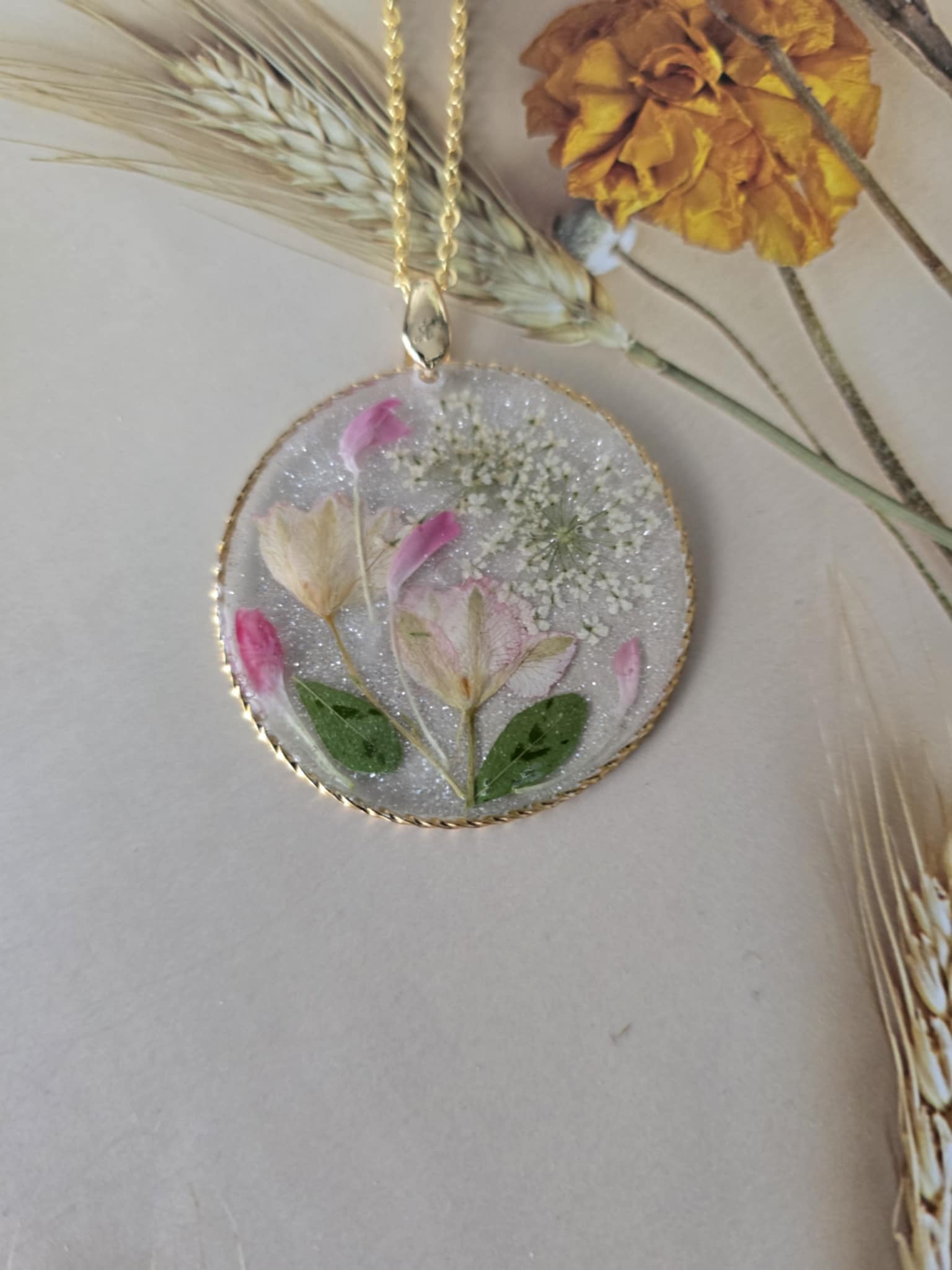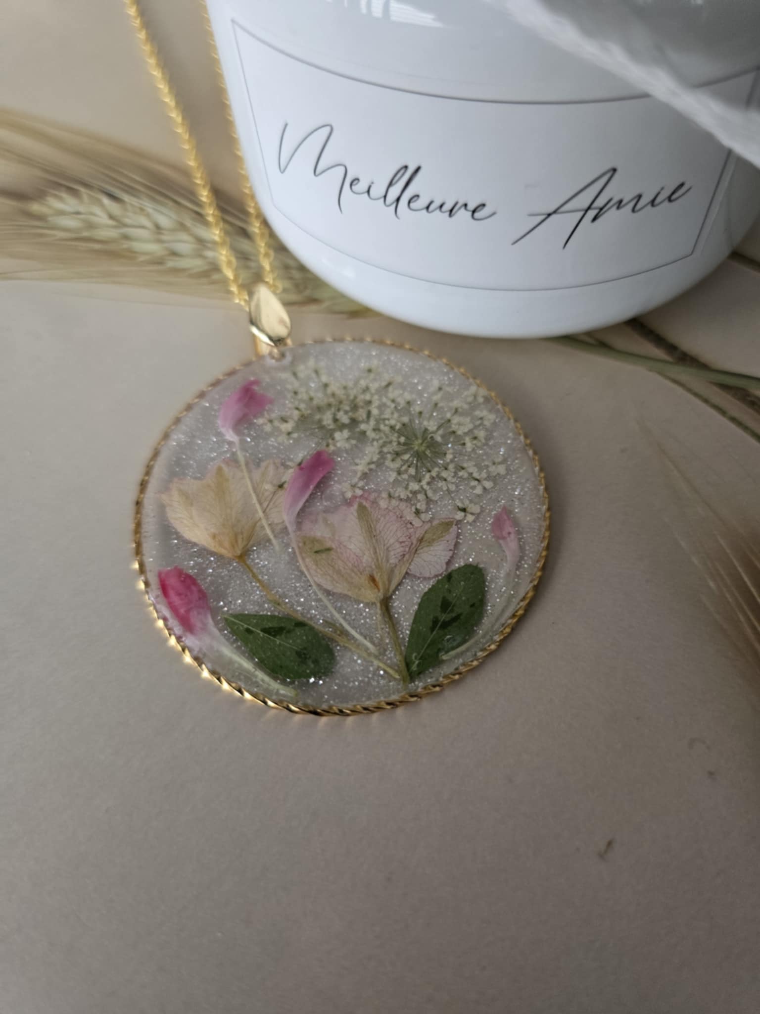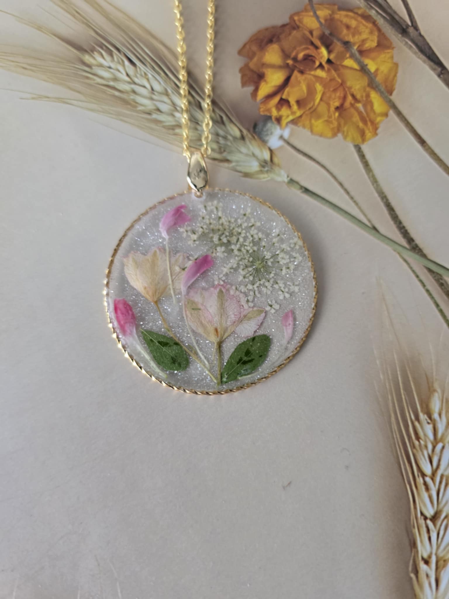 Caractéristiques : une chaîne plaquée or 14 carats ornée de bijoux en résine avec des fleurs naturelles est un accessoire élégant et unique. La résine permet de préserver la beauté des fleurs tout en les mettant en valeur. Ce type de bijou est souvent apprécié pour son aspect artisanal et sa capacité à capturer la nature.