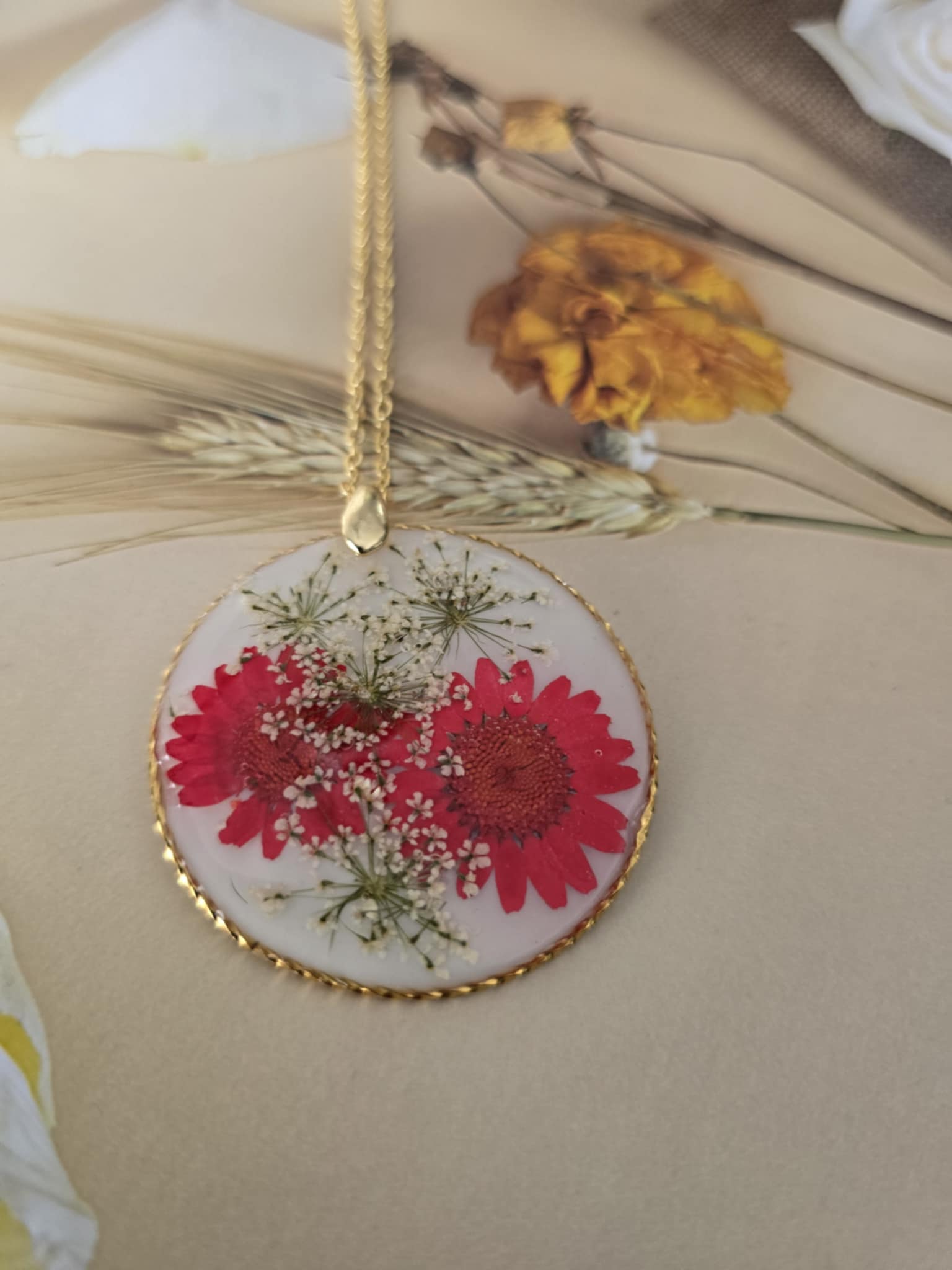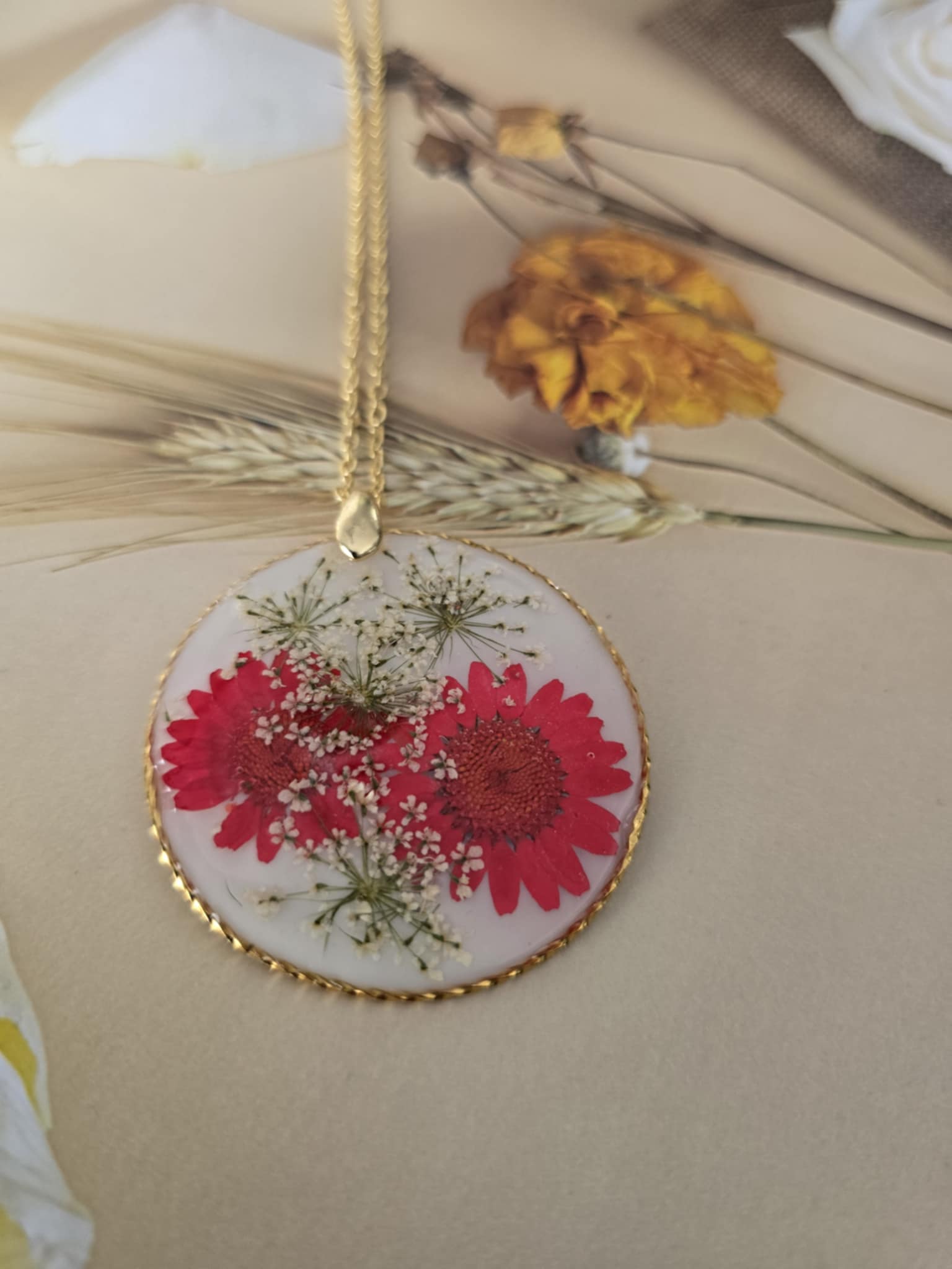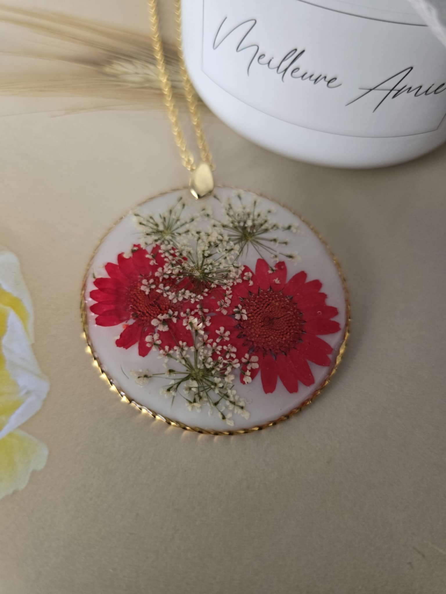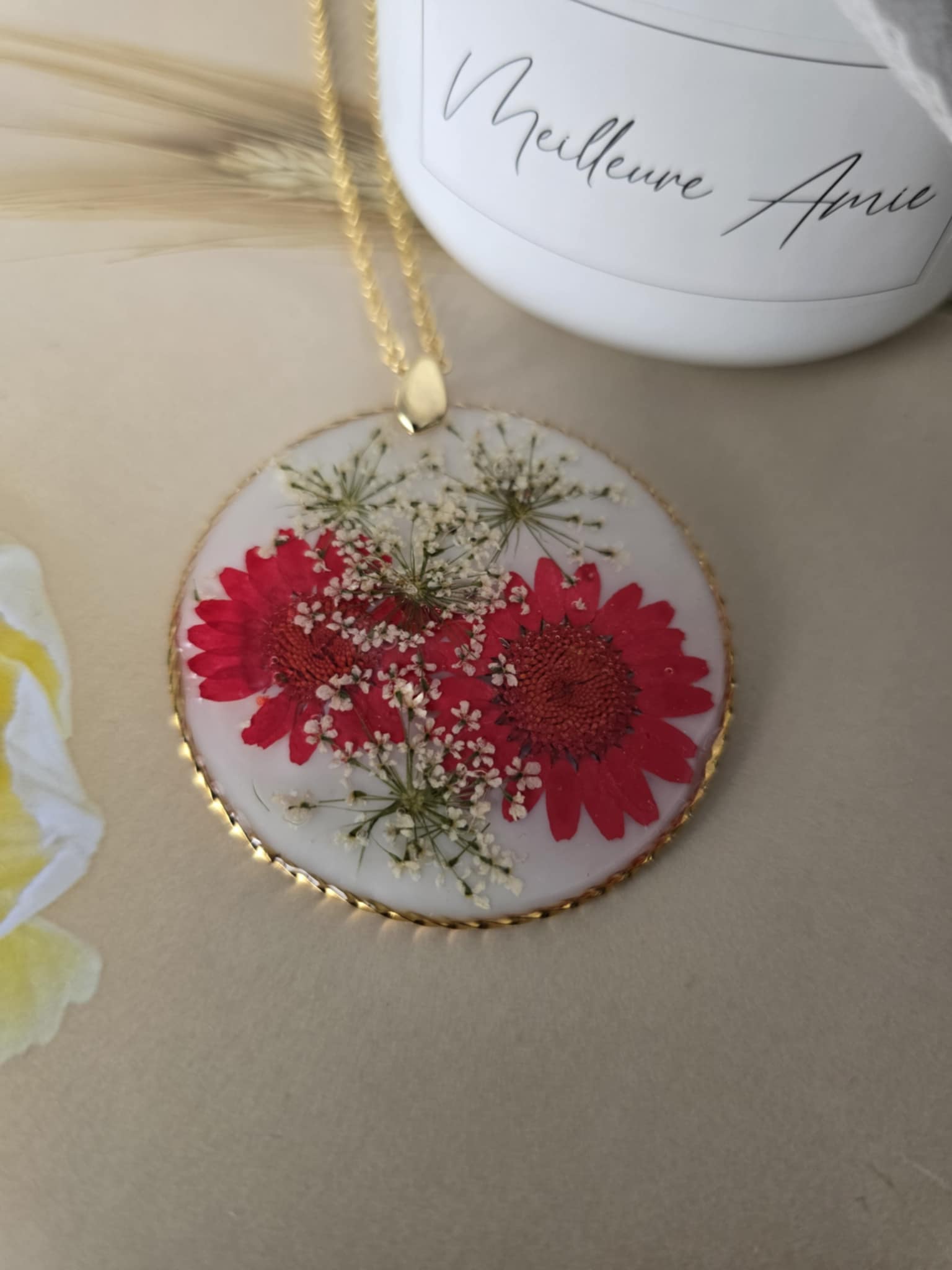 Caractéristique : une chaîne plaquée or 14 carats ornée de bijoux en résine avec des fleurs naturelles est un accessoire élégant et unique. La résine permet de préserver la beauté des fleurs tout en les mettant en valeur. Ce type de bijou est souvent apprécié pour son aspect artisanal et sa capacité à capturer la nature.