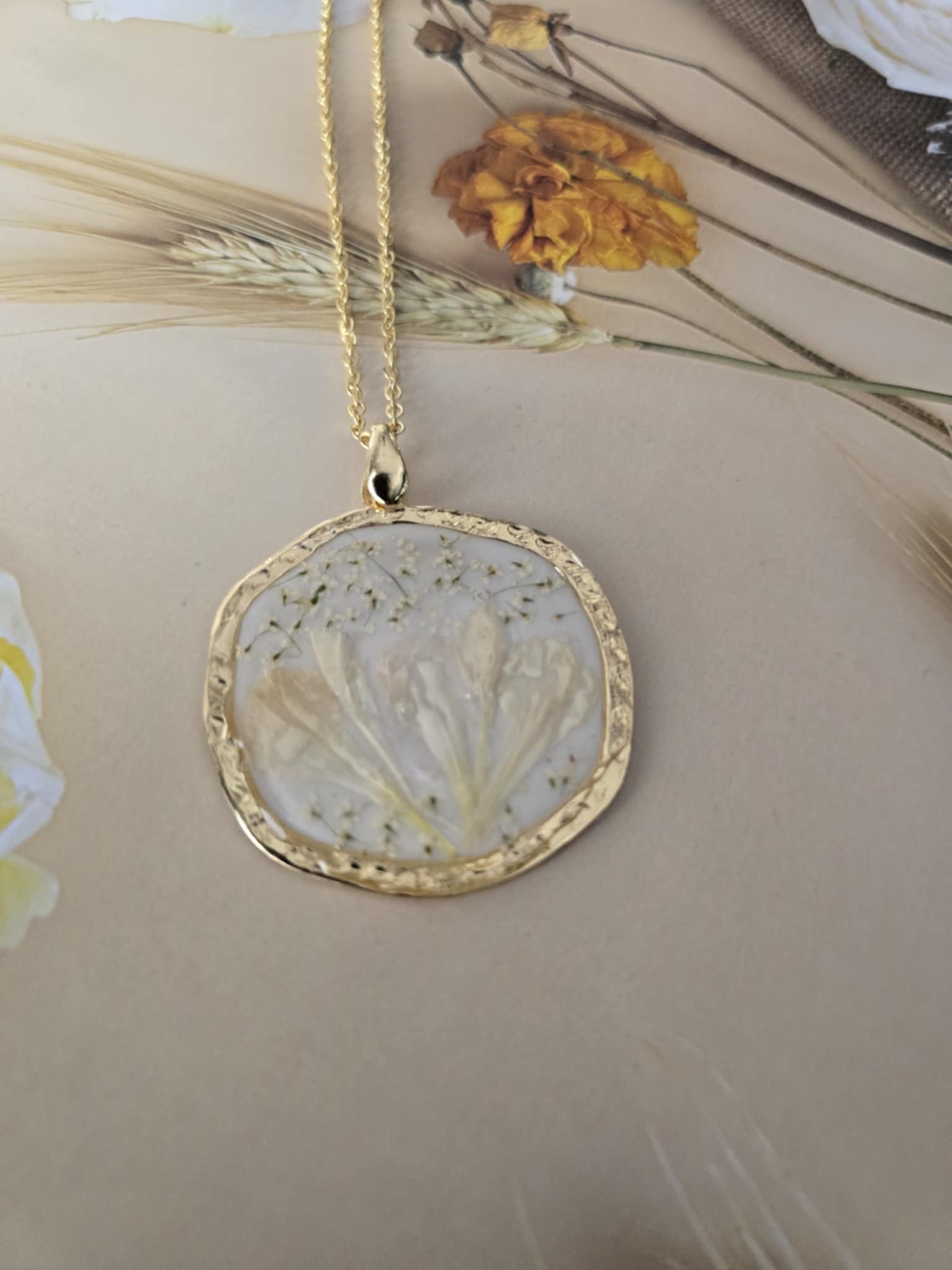 Caractéristiques : une chaîne plaquée or 14 carats ornée de bijoux en résine avec des fleurs naturelles est un accessoire élégant et unique. La résine permet de préserver la beauté des fleurs tout en les mettant en valeur. Ce type de bijou est souvent apprécié pour son aspect artisanal et sa capacité à capturer la nature.
