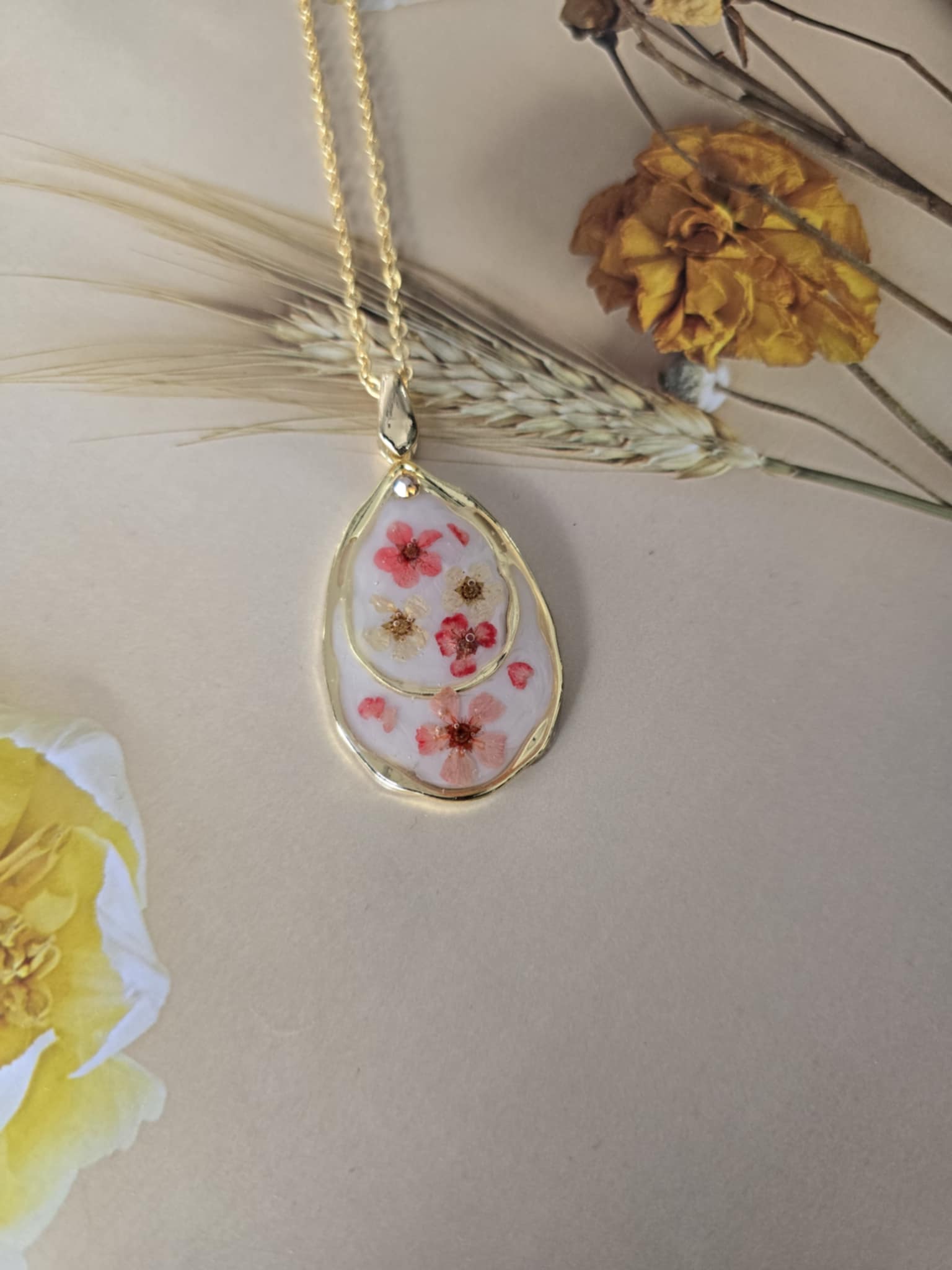 Caractéristiques : une chaîne plaquée or 14 carats ornée de bijoux en résine avec des fleurs naturelles est un accessoire élégant et unique. La résine permet de préserver la beauté des fleurs tout en les mettant en valeur. Ce type de bijou est souvent apprécié pour son aspect artisanal et sa capacité à capturer la nature.