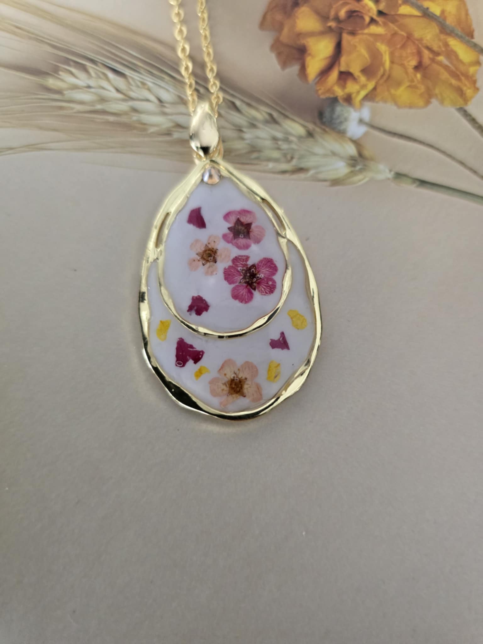Caractéristiques : une chaîne plaquée or 14 carats ornée de bijoux en résine avec des fleurs naturelles est un accessoire élégant et unique. La résine permet de préserver la beauté des fleurs tout en les mettant en valeur. Ce type de bijou est souvent apprécié pour son aspect artisanal et sa capacité à capturer la nature.