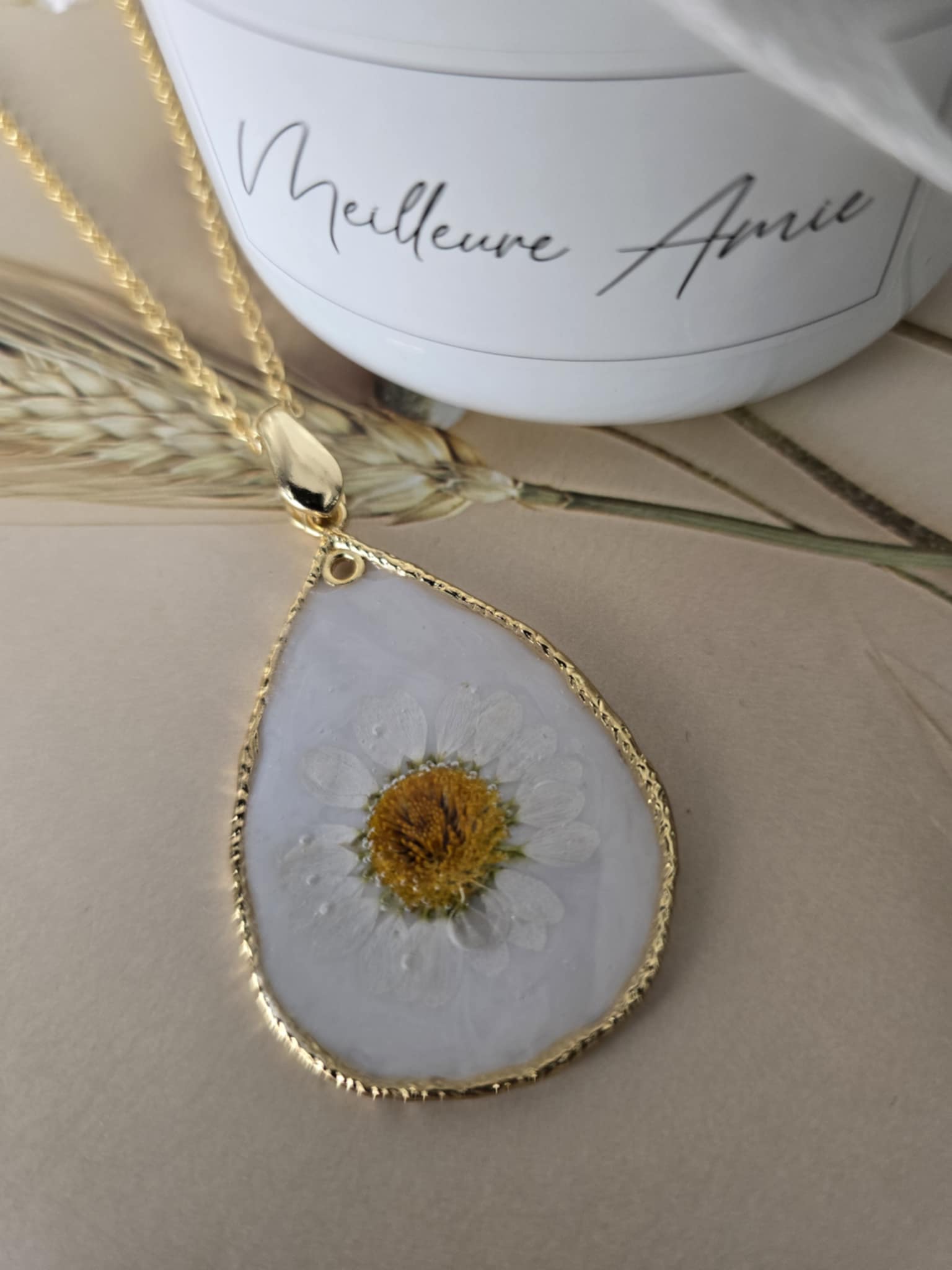 Caractéristiques : une chaîne plaquée or 14 carats ornée de bijoux en résine avec des fleurs naturelles est un accessoire élégant et unique. La résine permet de préserver la beauté des fleurs tout en les mettant en valeur. Ce type de bijou est souvent apprécié pour son aspect artisanal et sa capacité à capturer la nature.