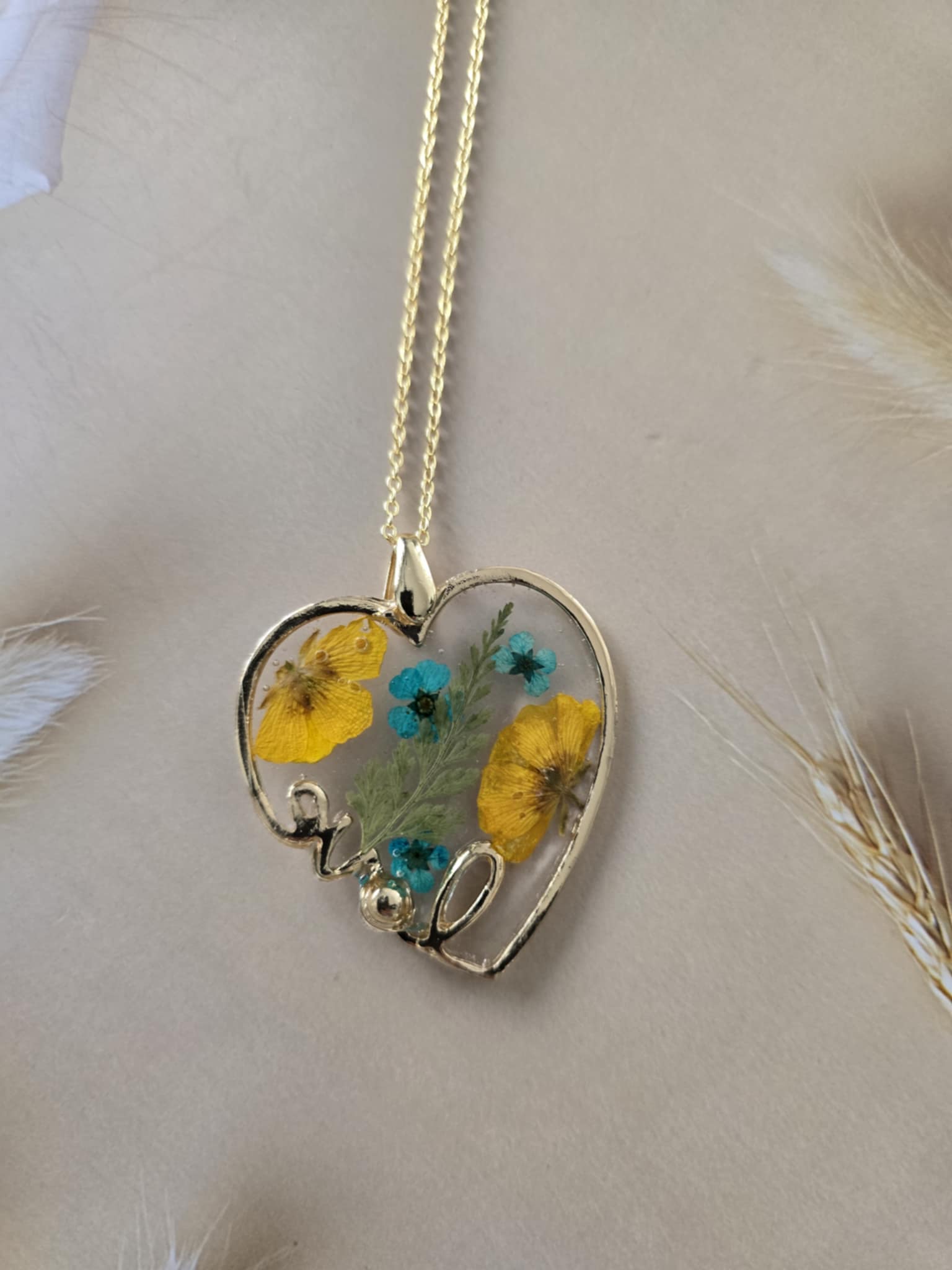 Caractéristiques : une chaîne plaquée or 14 carats ornée de bijoux en résine avec des fleurs naturelles est un accessoire élégant et unique. La résine permet de préserver la beauté des fleurs tout en les mettant en valeur. Ce type de bijou est souvent apprécié pour son aspect artisanal et sa capacité à capturer la nature.