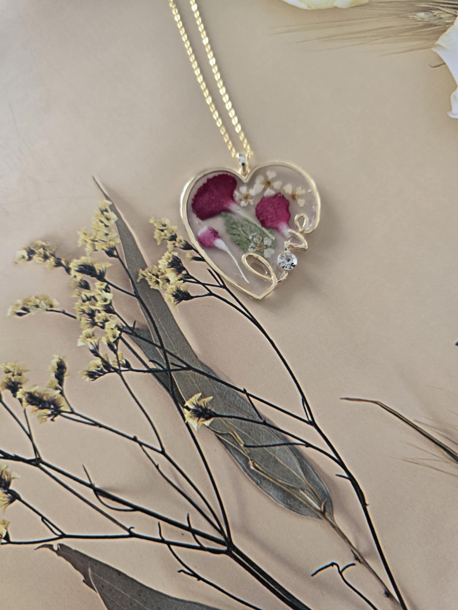 Caractéristiques : une chaîne plaquée or 14 carats ornée de bijoux en résine avec des fleurs naturelles est un accessoire élégant et unique. La résine permet de préserver la beauté des fleurs tout en les mettant en valeur. Ce type de bijou est souvent apprécié pour son aspect artisanal et sa capacité à capturer la nature.