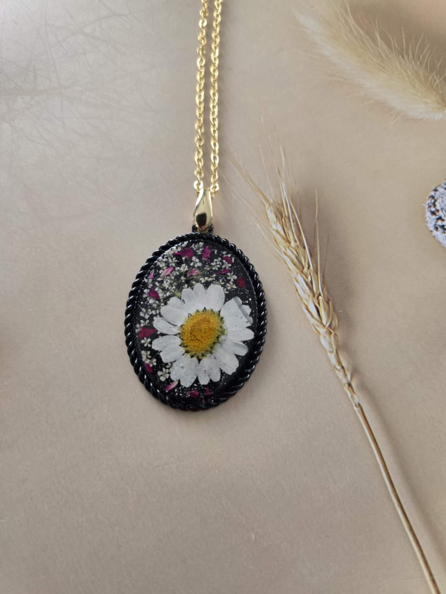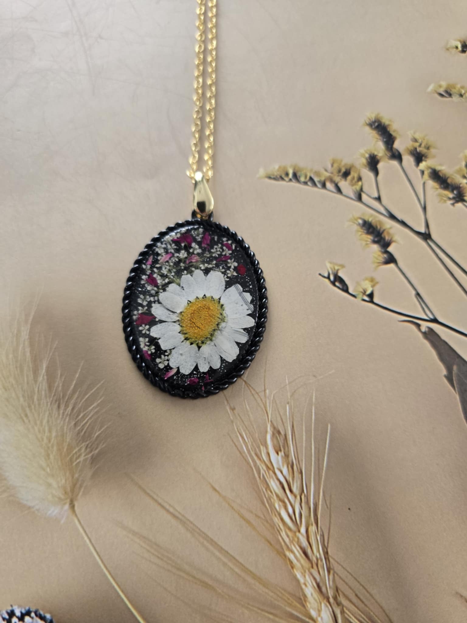 Caractéristiques : une chaîne plaquée or 14 carats ornée de bijoux en résine avec des fleurs naturelles est un accessoire élégant et unique. La résine permet de préserver la beauté des fleurs tout en les mettant en valeur. Ce type de bijou est souvent apprécié pour son aspect artisanal et sa capacité à capturer la nature.