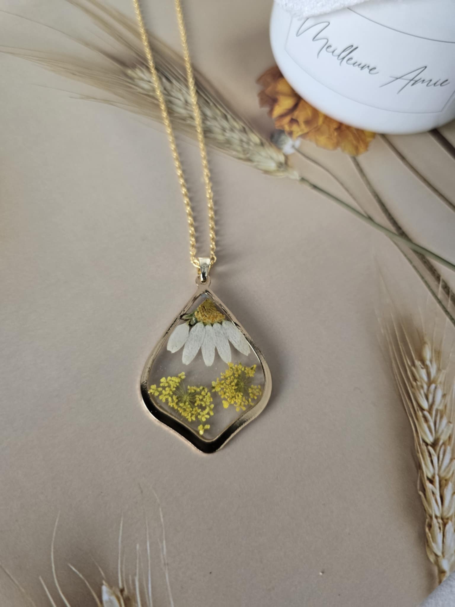 Caractéristiques : une chaîne plaquée or 14 carats ornée de bijoux en résine avec des fleurs naturelles est un accessoire élégant et unique. La résine permet de préserver la beauté des fleurs tout en les mettant en valeur. Ce type de bijou est souvent apprécié pour son aspect artisanal et sa capacité à capturer la nature.