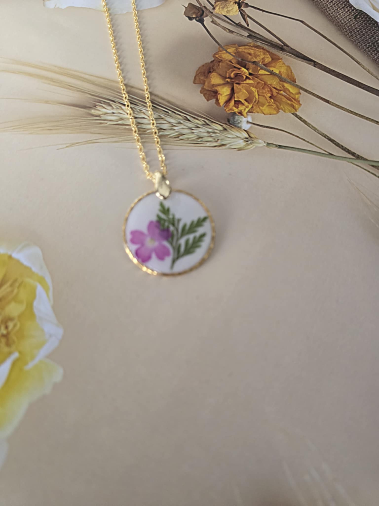 Caractéristiques : une chaîne plaquée or 14 carats ornée de bijoux en résine avec des fleurs naturelles est un accessoire élégant et unique. La résine permet de préserver la beauté des fleurs tout en les mettant en valeur. Ce type de bijou est souvent apprécié pour son aspect artisanal et sa capacité à capturer la nature.