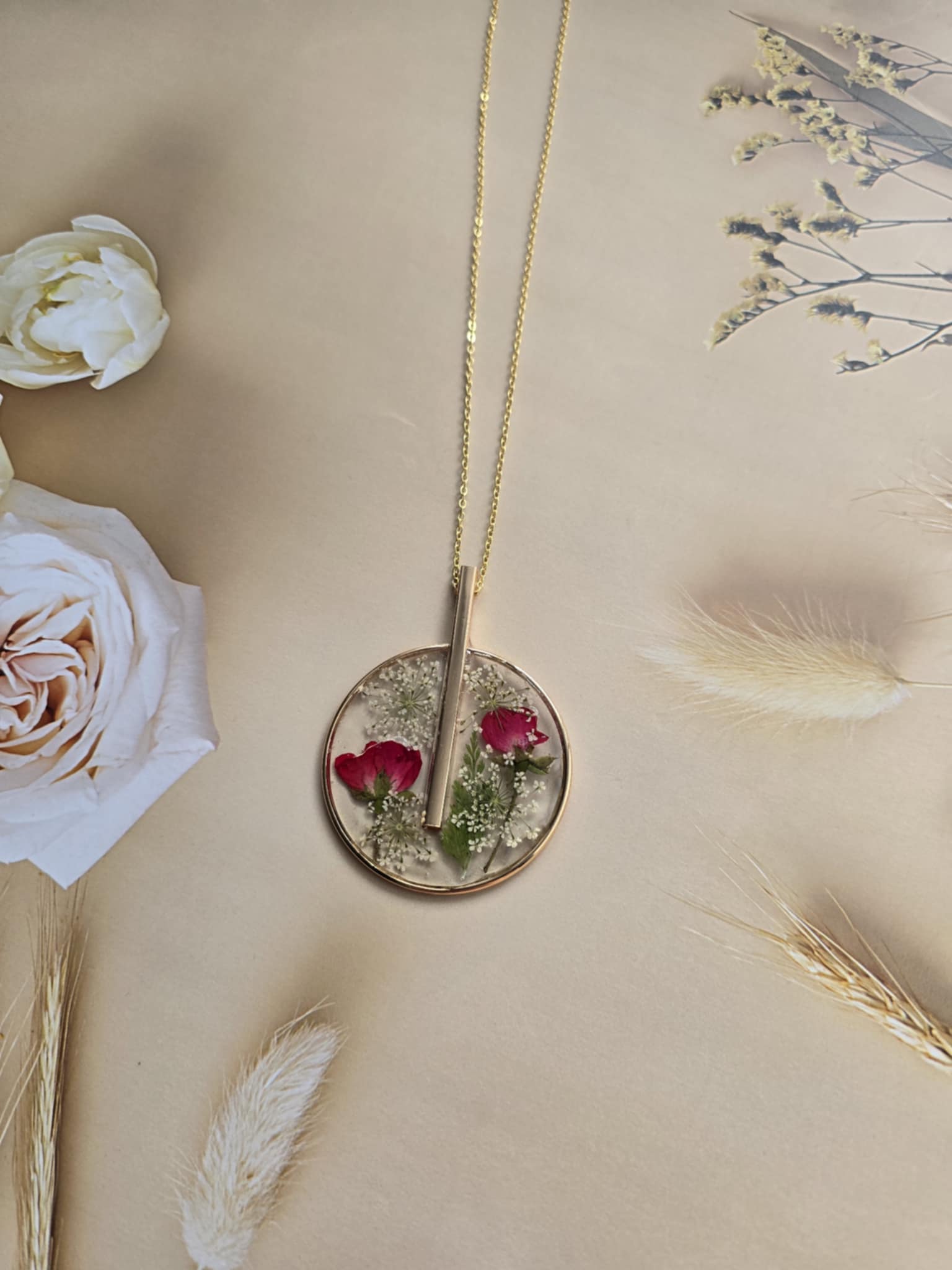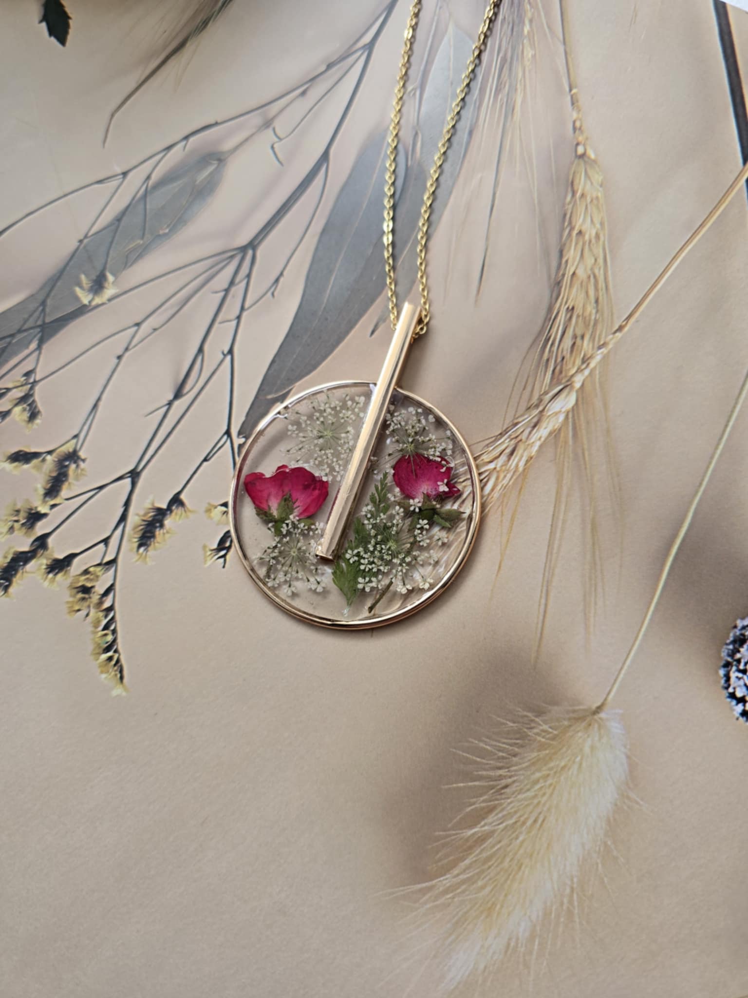 Caractéristiques : une chaîne plaquée or 14 carats ornée de bijoux en résine avec des fleurs naturelles est un accessoire élégant et unique. La résine permet de préserver la beauté des fleurs tout en les mettant en valeur. Ce type de bijou est souvent apprécié pour son aspect artisanal et sa capacité à capturer la nature.
