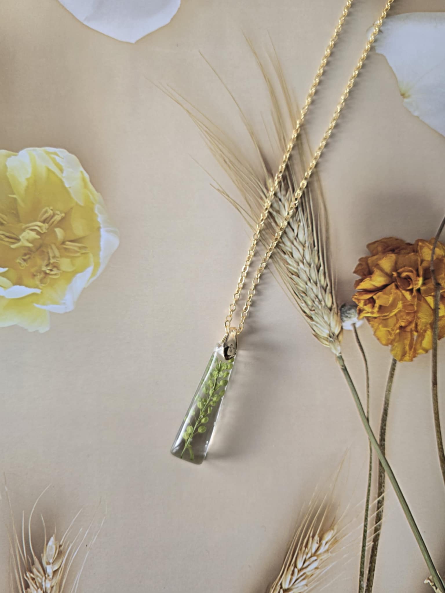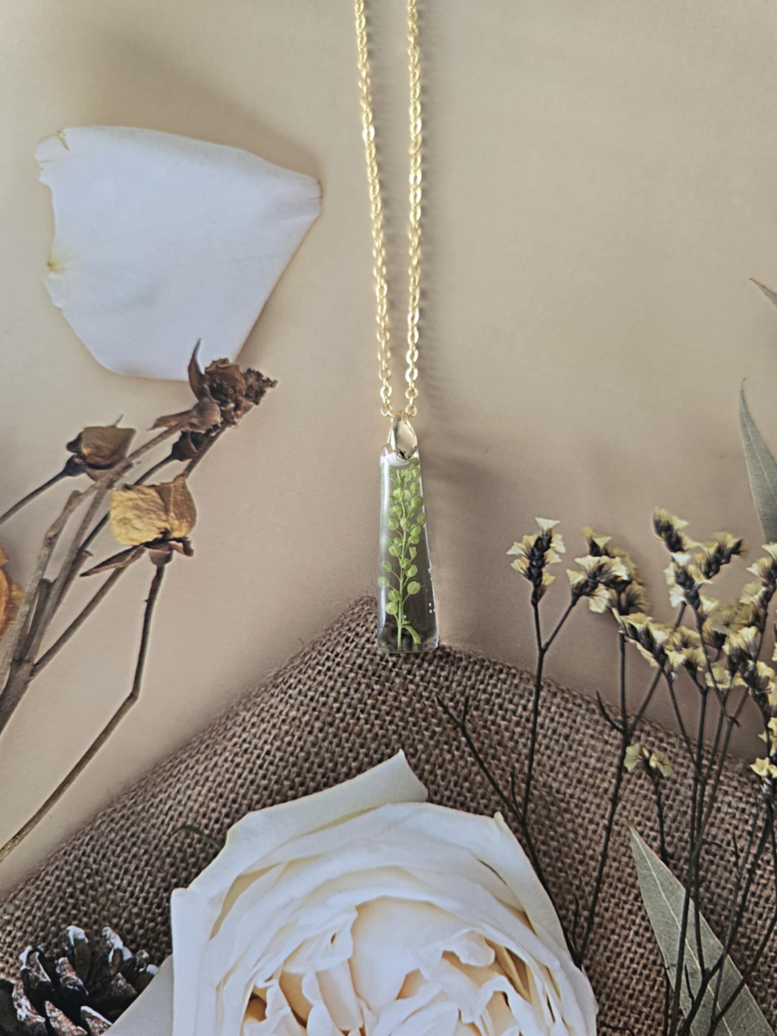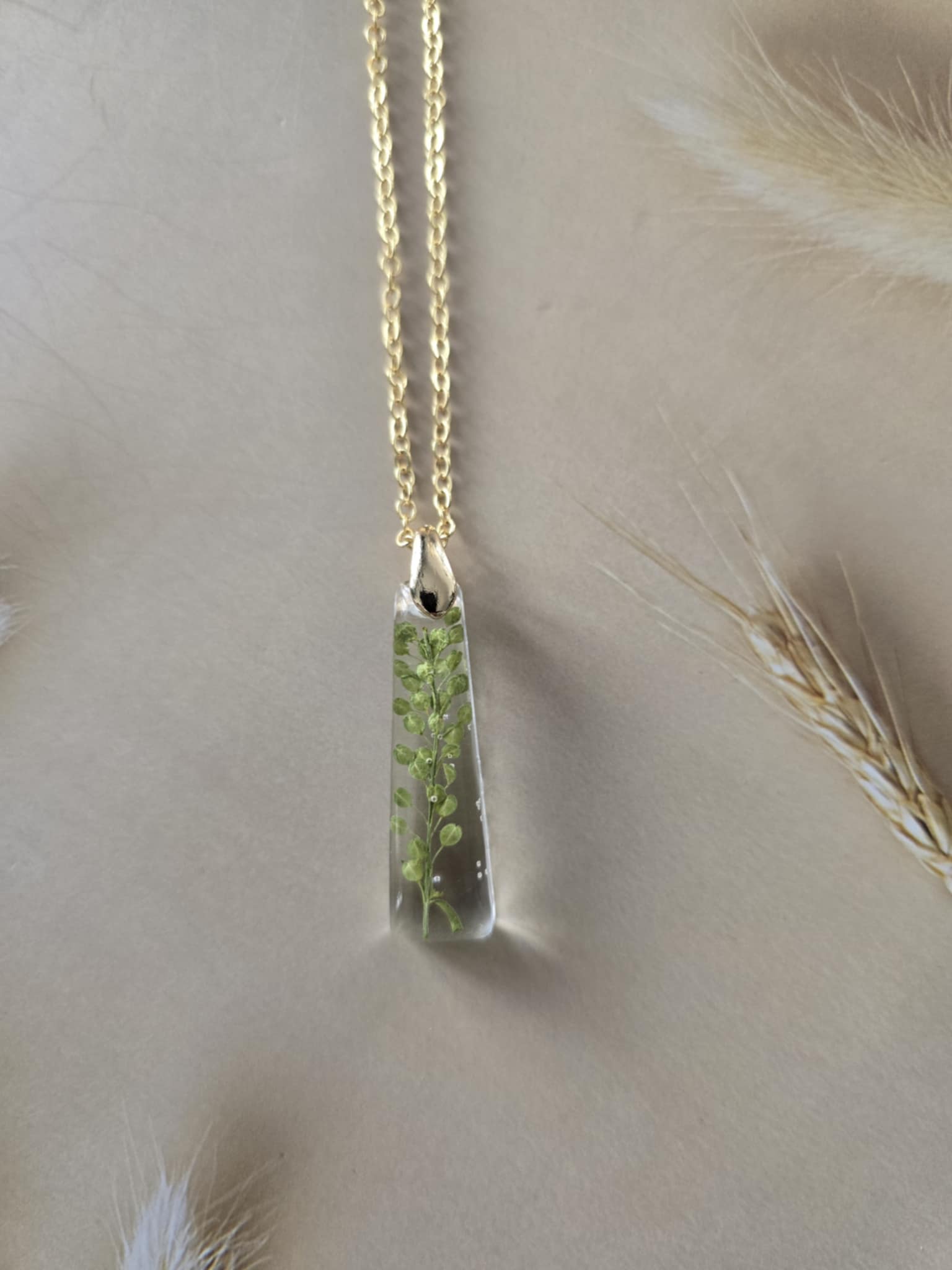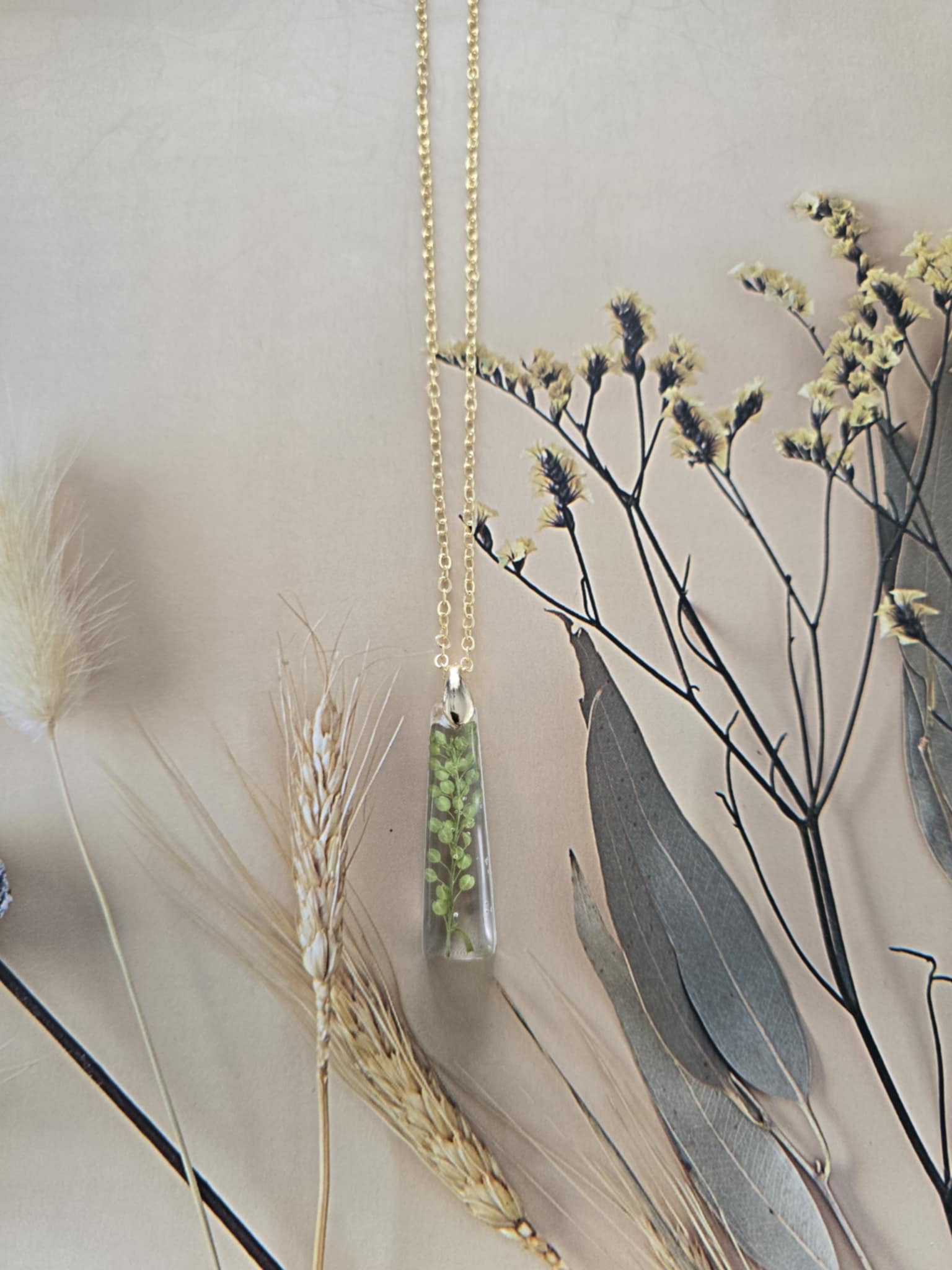 Caractéristiques : une chaîne plaquée or 14 carats ornée de bijoux en résine avec des fleurs naturelles est un accessoire élégant et unique. La résine permet de préserver la beauté des fleurs tout en les mettant en valeur. Ce type de bijou est souvent apprécié pour son aspect artisanal et sa capacité à capturer la nature.