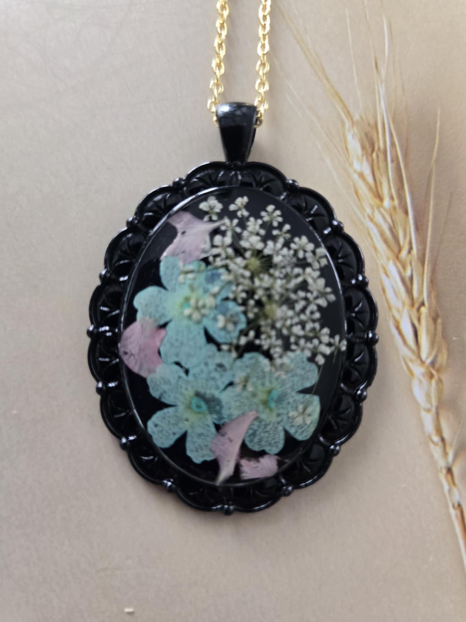 Caractéristiques : une chaîne plaquée or 14 carats ornée de bijoux en résine avec des fleurs naturelles est un accessoire élégant et unique. La résine permet de préserver la beauté des fleurs tout en les mettant en valeur. Ce type de bijou est souvent apprécié pour son aspect artisanal et sa capacité à capturer la nature.