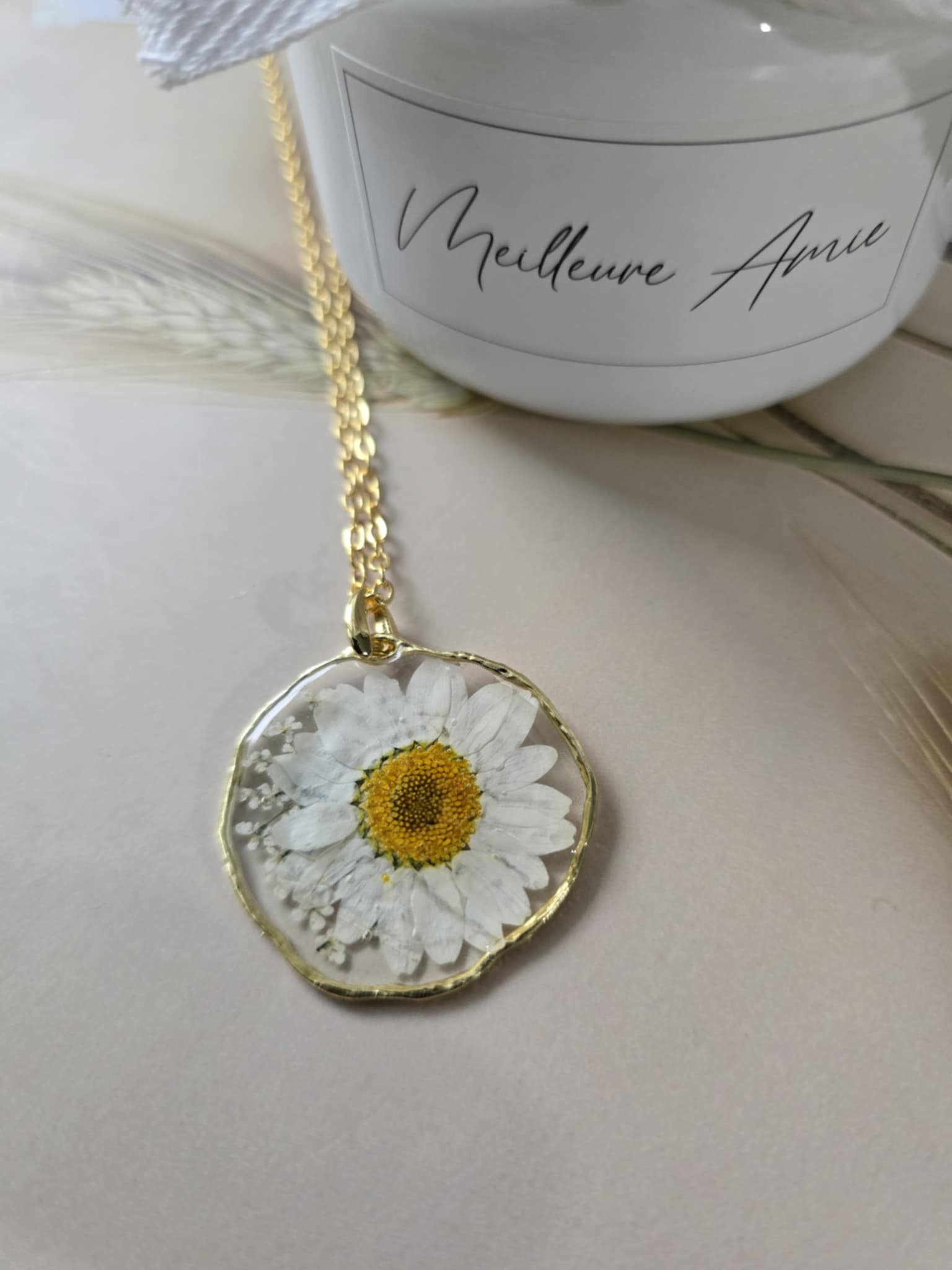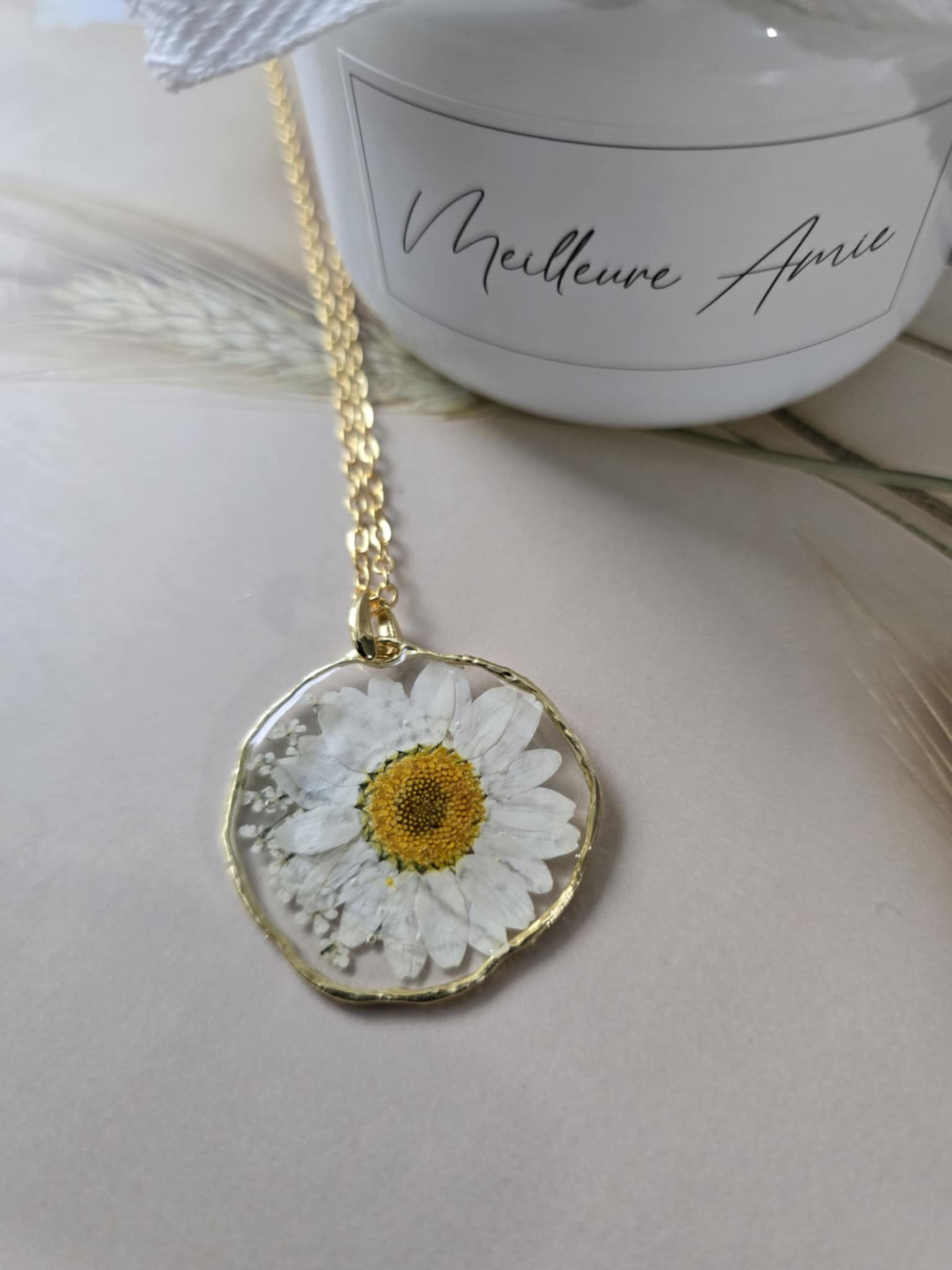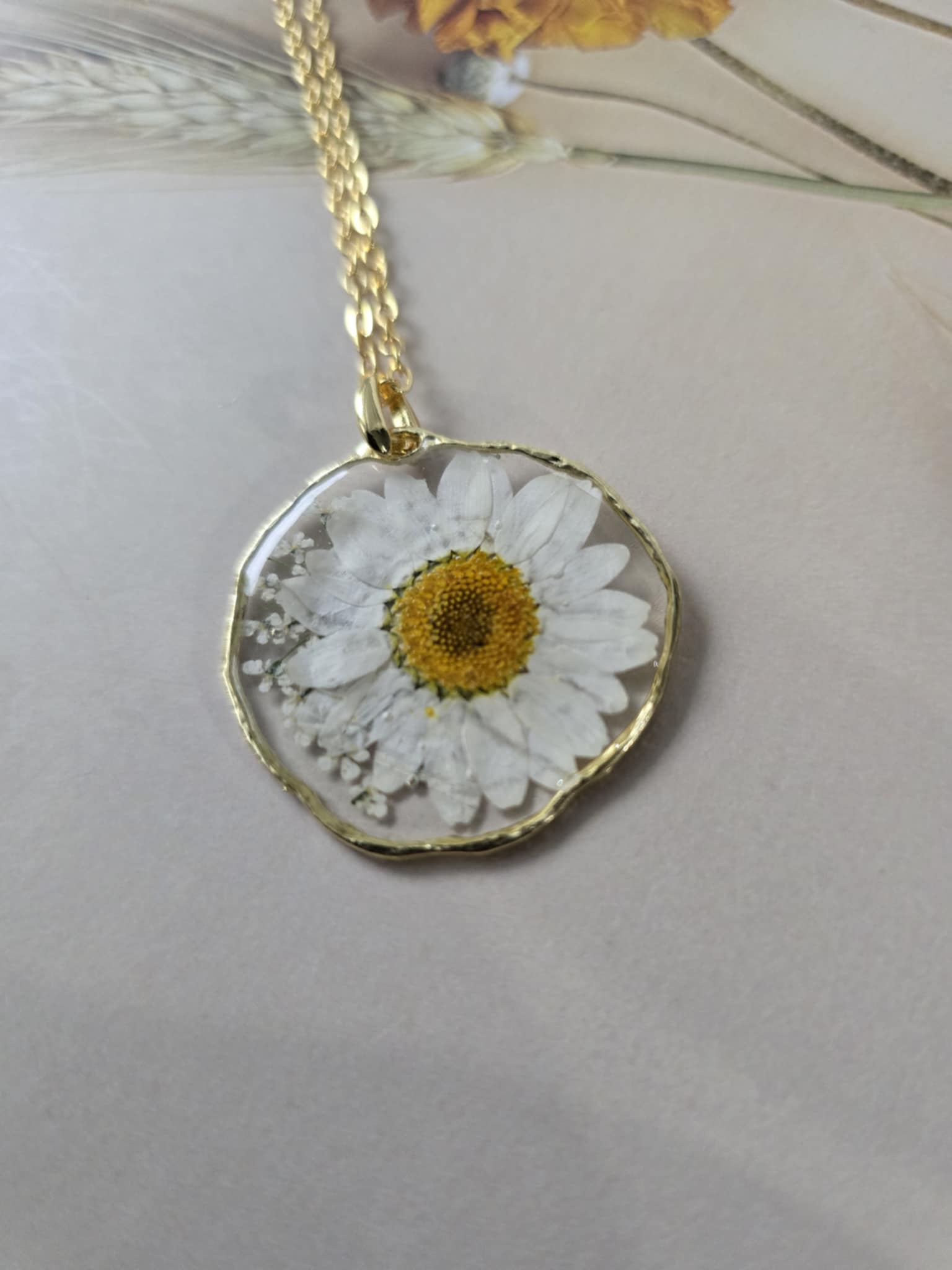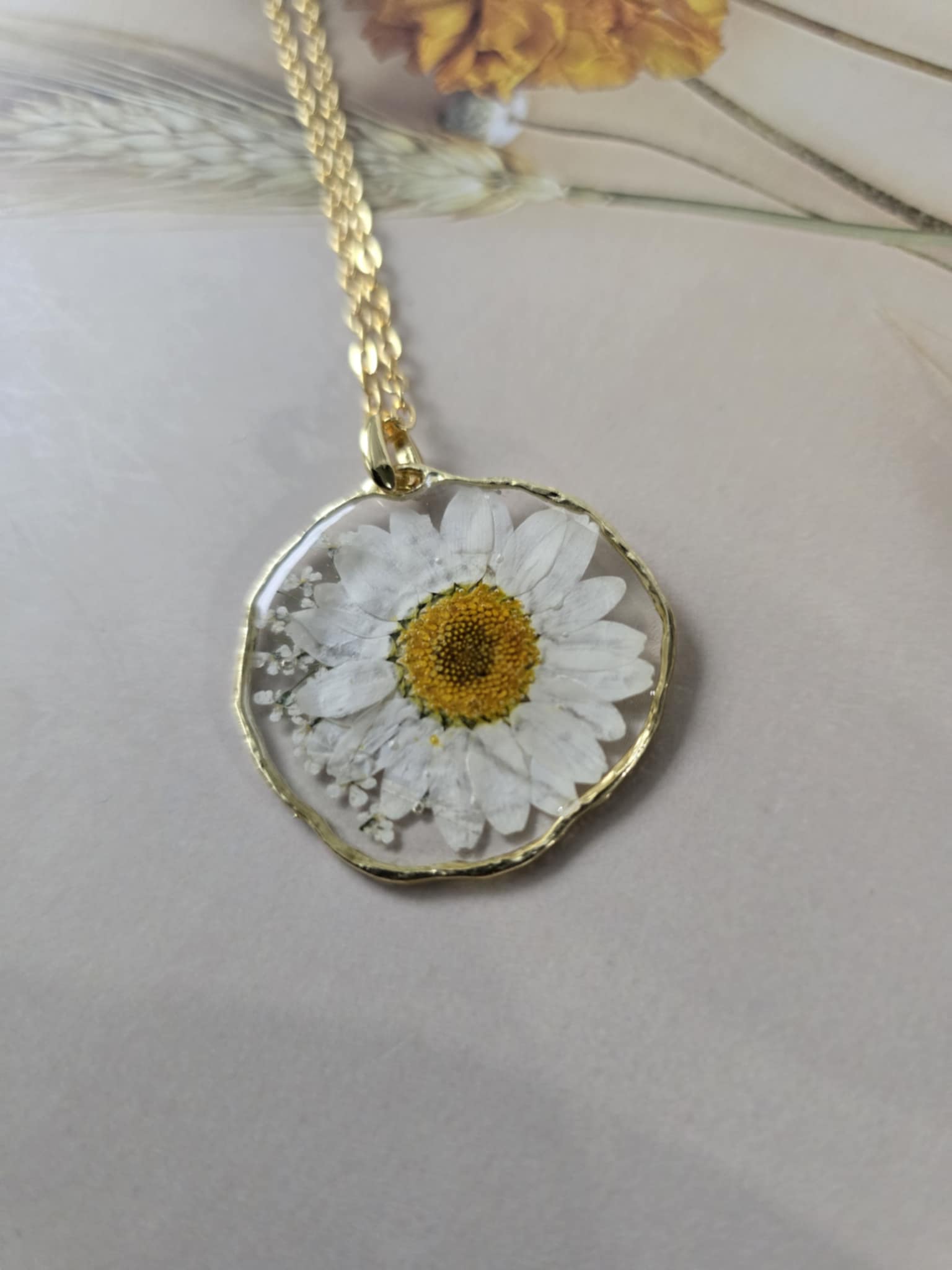 Caractéristiques : une chaîne plaquée or 14 carats ornée de bijoux en résine avec des fleurs naturelles est un accessoire élégant et unique. La résine permet de préserver la beauté des fleurs tout en les mettant en valeur. Ce type de bijou est souvent apprécié pour son aspect artisanal et sa capacité à capturer la nature.