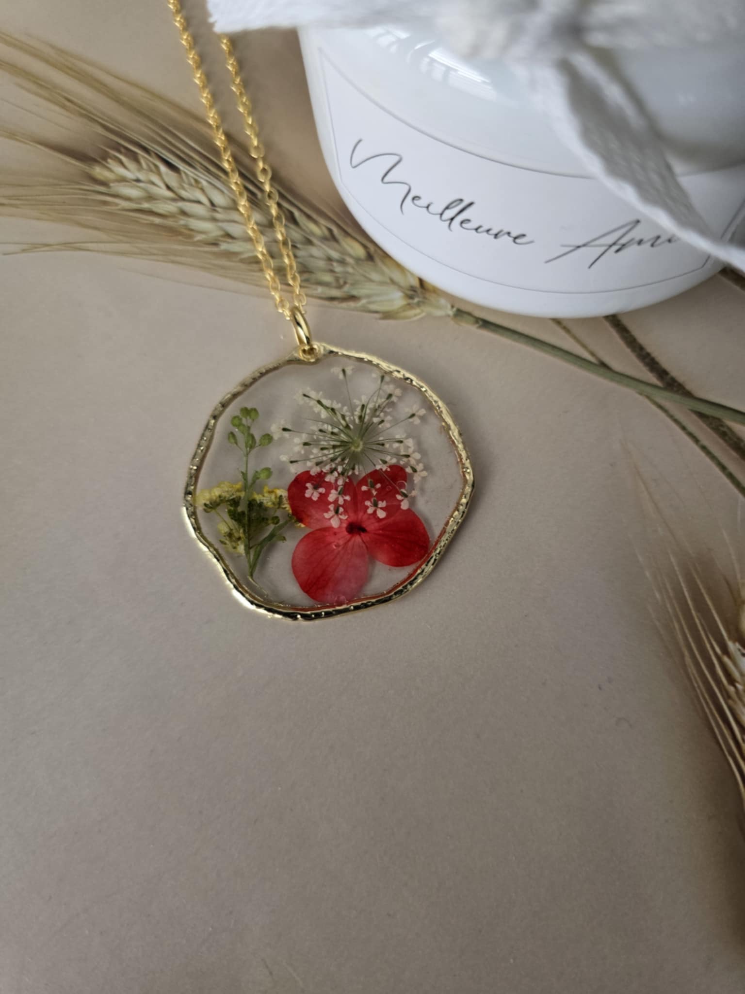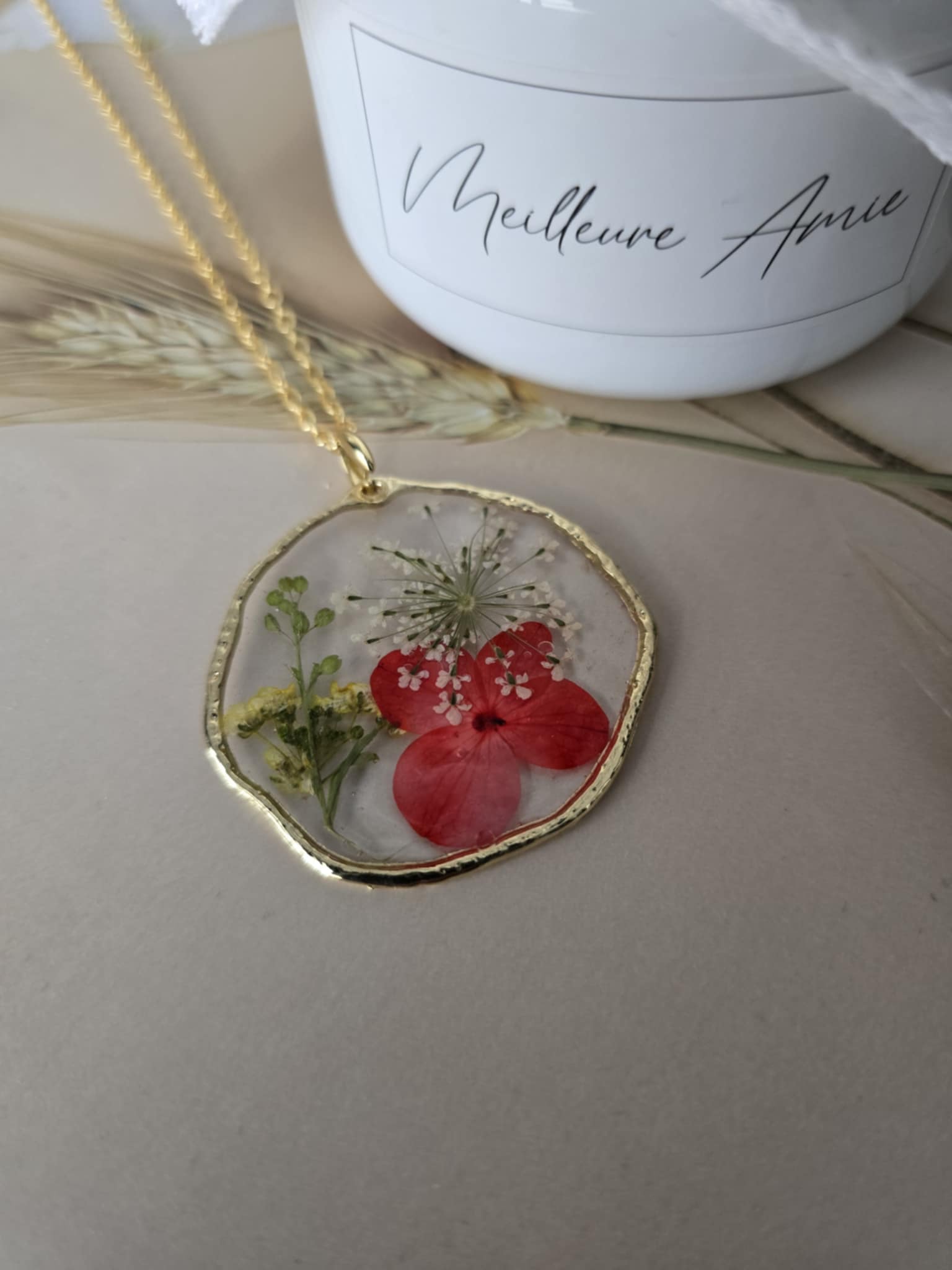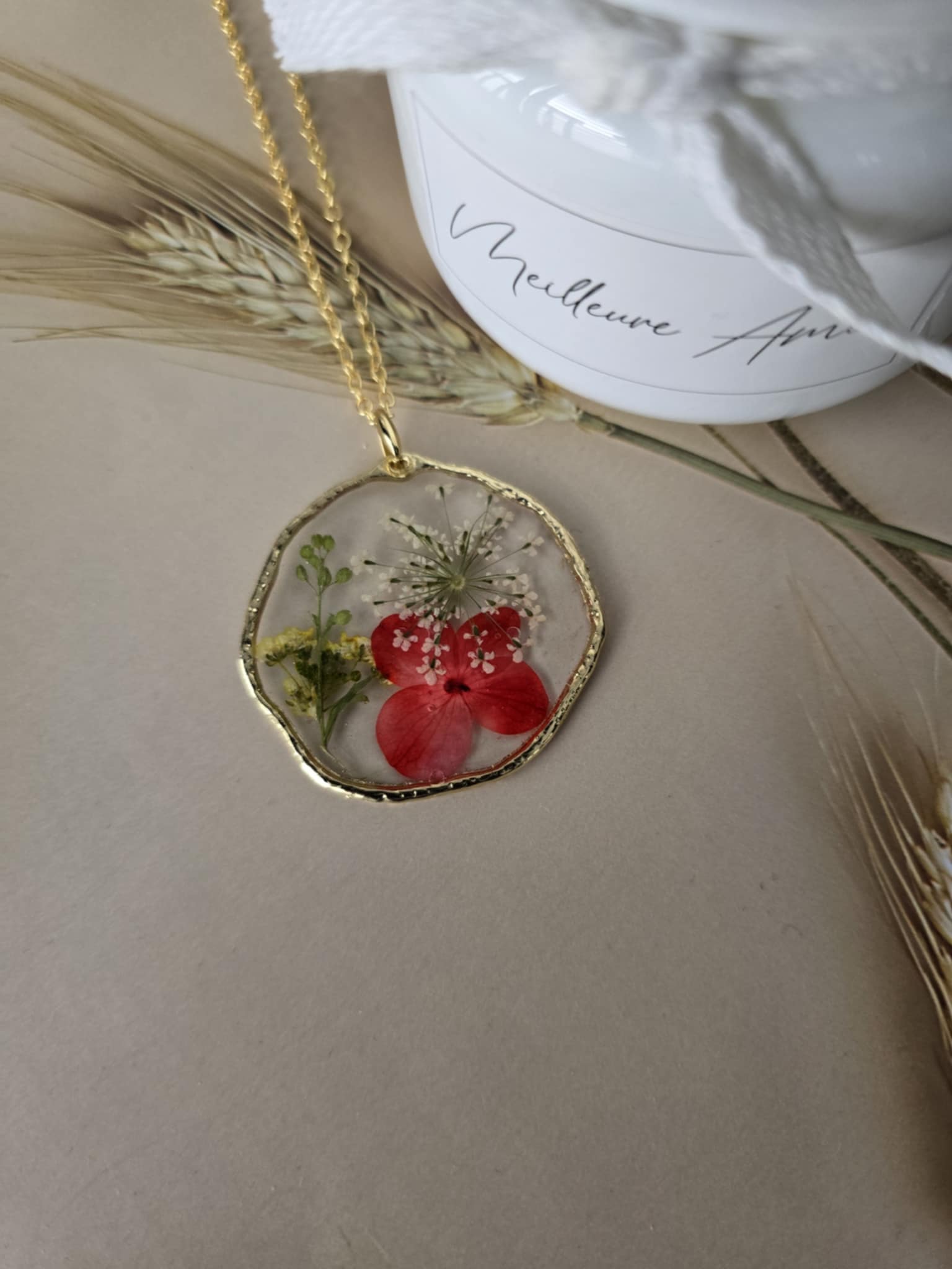 Caractéristiques : une chaîne plaquée or 14 carats ornée de bijoux en résine avec des fleurs naturelles est un accessoire élégant et unique. La résine permet de préserver la beauté des fleurs tout en les mettant en valeur. Ce type de bijou est souvent apprécié pour son aspect artisanal et sa capacité à capturer la nature.