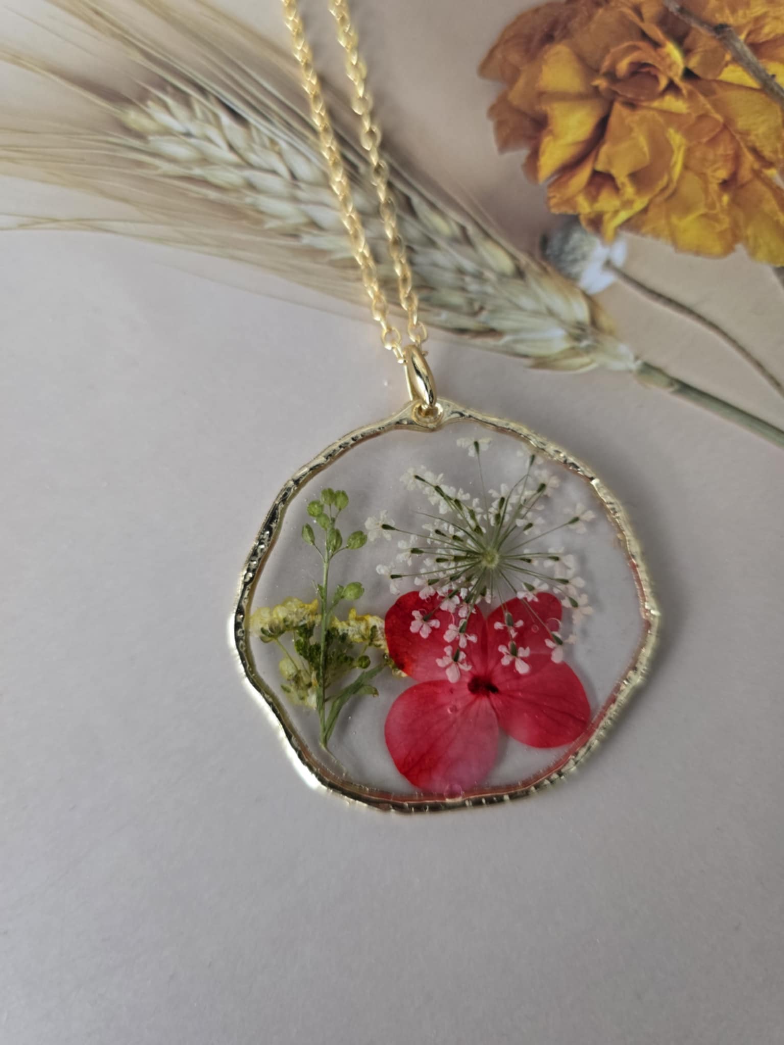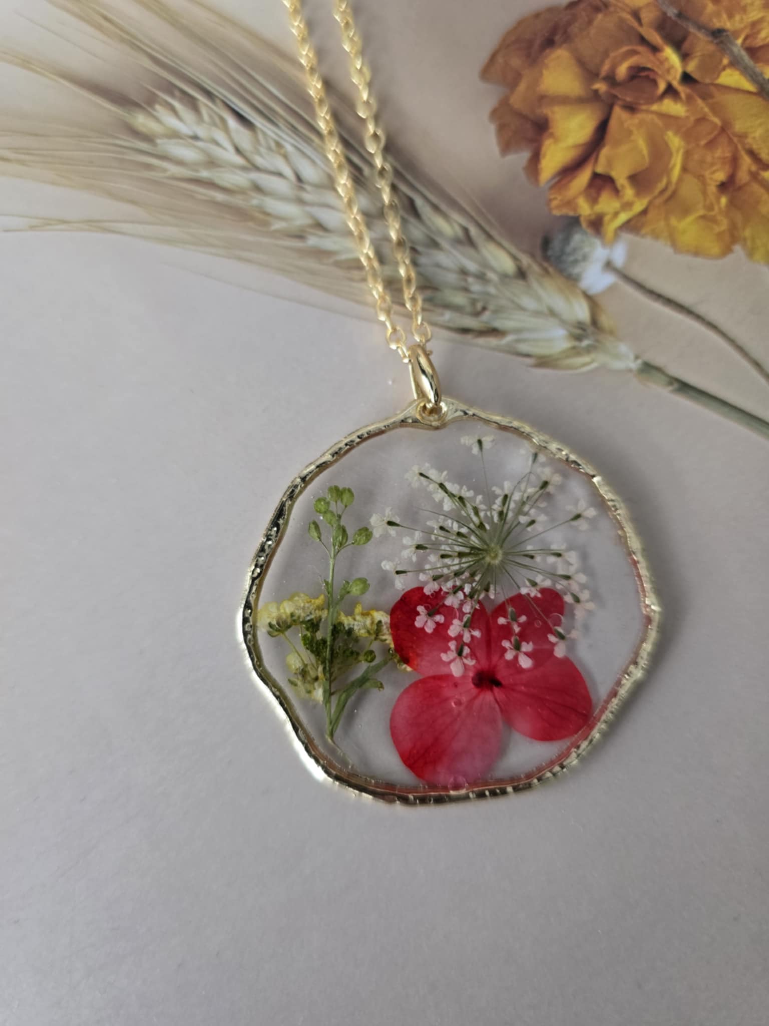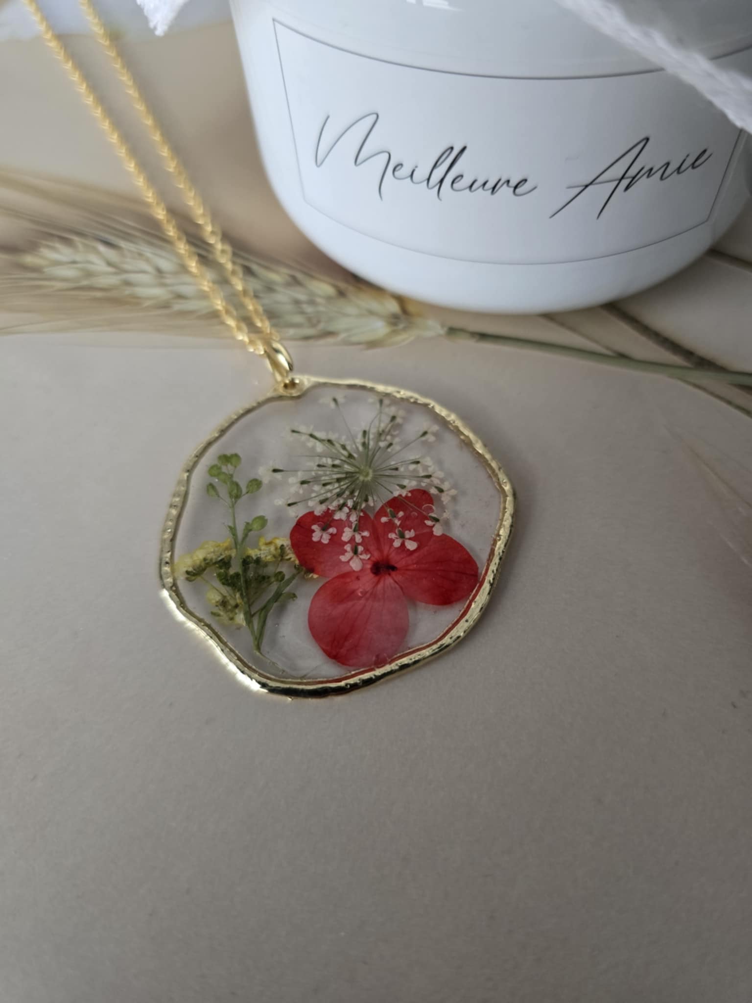 Caractéristiques : une chaîne plaquée or 14 carats ornée de bijoux en résine avec des fleurs naturelles est un accessoire élégant et unique. La résine permet de préserver la beauté des fleurs tout en les mettant en valeur. Ce type de bijou est souvent apprécié pour son aspect artisanal et sa capacité à capturer la nature.