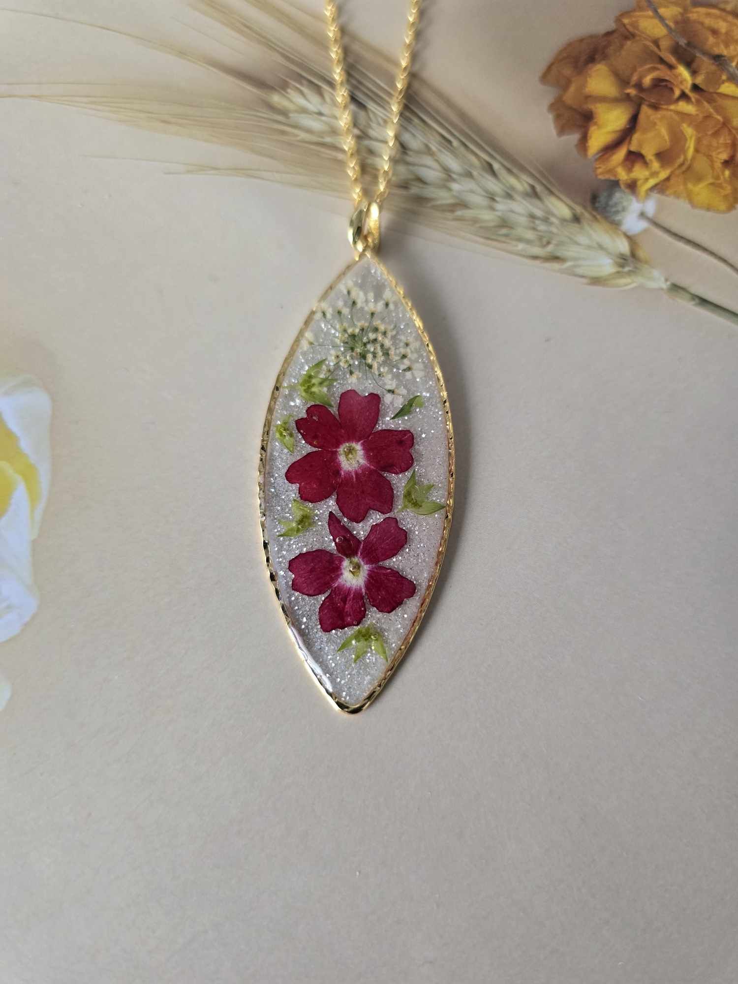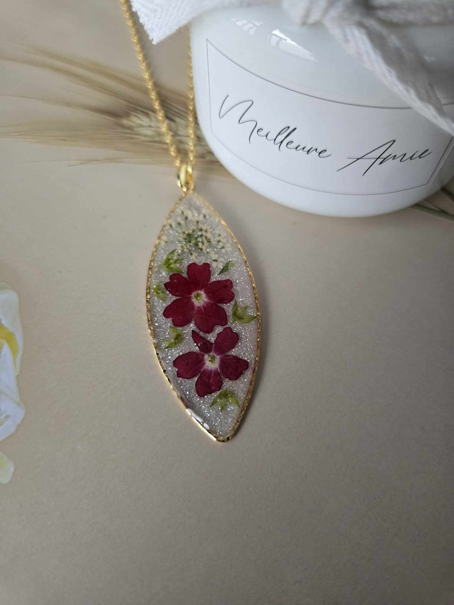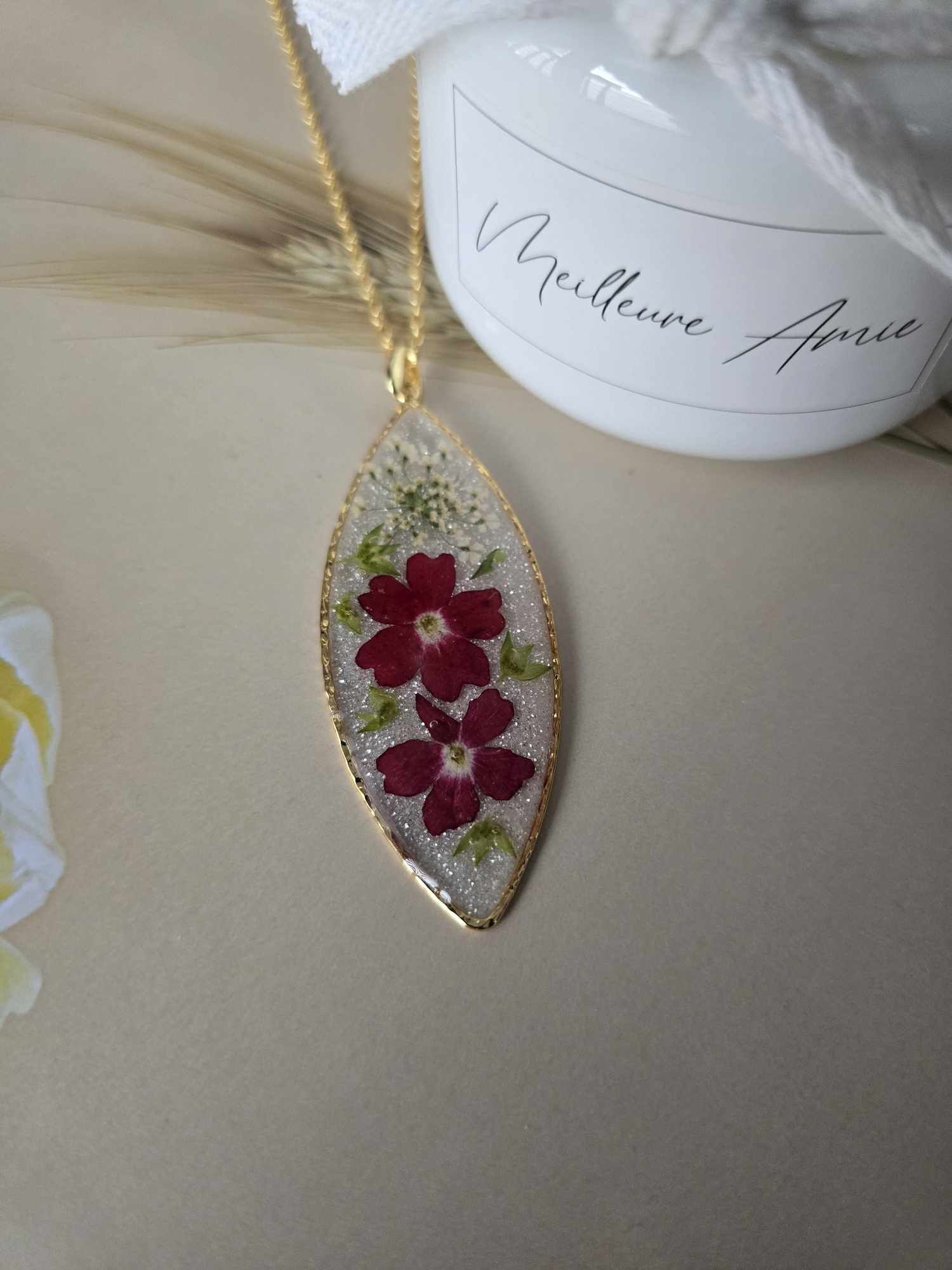Caractéristiques : une chaîne plaquée or 14 carats ornée de bijoux en résine avec des fleurs naturelles est un accessoire élégant et unique. La résine permet de préserver la beauté des fleurs tout en les mettant en valeur. Ce type de bijou est souvent apprécié pour son aspect artisanal et sa capacité à capturer la nature.