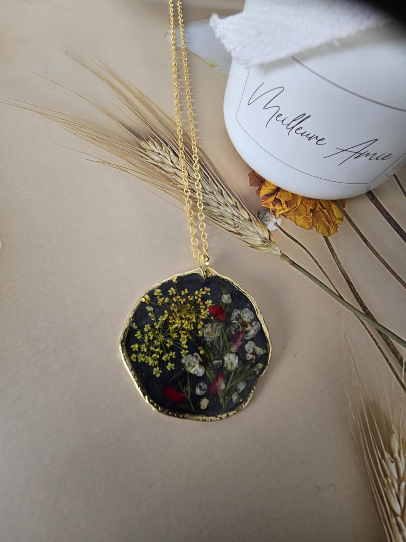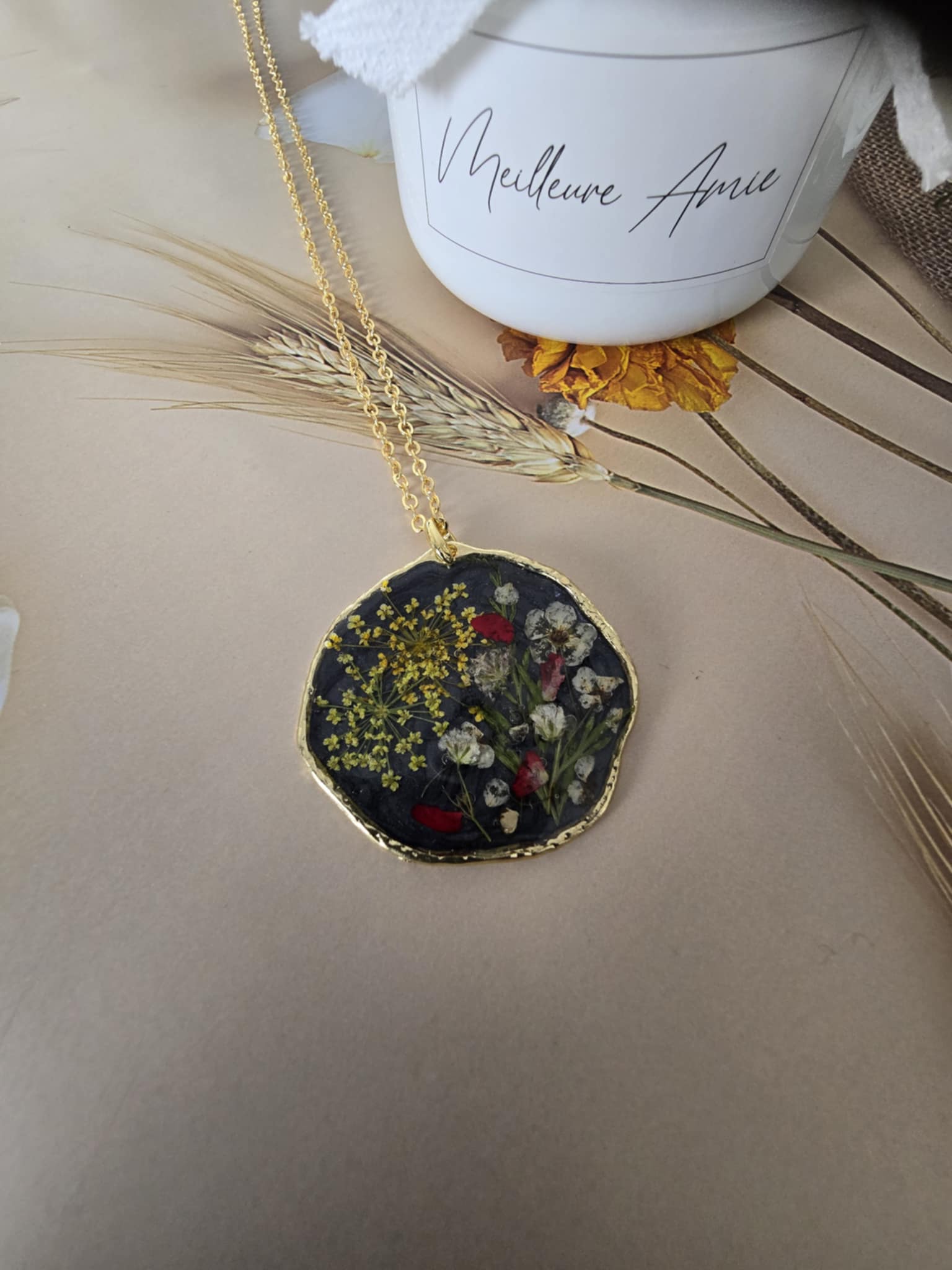 Caractéristiques : une chaîne plaquée or 14 carats ornée de bijoux en résine avec des fleurs naturelles est un accessoire élégant et unique. La résine permet de préserver la beauté des fleurs tout en les mettant en valeur. Ce type de bijou est souvent apprécié pour son aspect artisanal et sa capacité à capturer la nature.